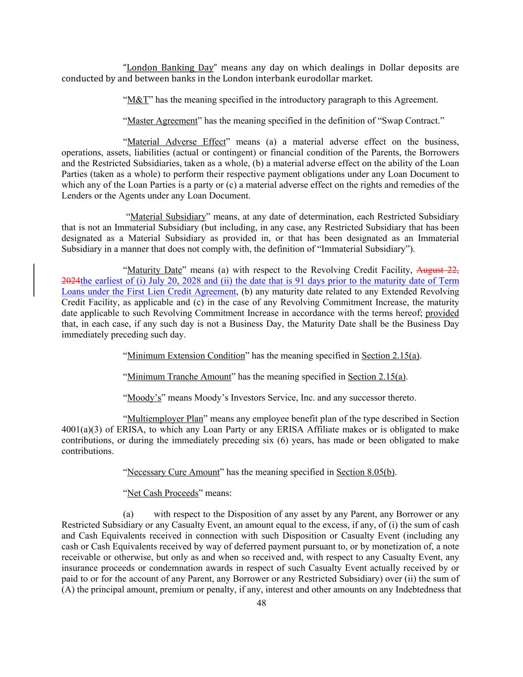 “London Banking Day” means any day on which dealings in Dollar deposits are conducted by and between banks in the London interbank eurodollar market. “M&T” has the meaning specified in the introductory paragraph to this Agreement. “Master Agreement” has the meaning specified in the definition of “Swap Contract.” “Material Adverse Effect” means (a) a material adverse effect on the business, operations, assets, liabilities (actual or contingent) or financial condition of the Parents, the Borrowers and the Restricted Subsidiaries, taken as a whole, (b) a material adverse effect on the ability of the Loan Parties (taken as a whole) to perform their respective payment obligations under any Loan Document to which any of the Loan Parties is a party or (c) a material adverse effect on the rights and remedies of the Lenders or the Agents under any Loan Document. “Material Subsidiary” means, at any date of determination, each Restricted Subsidiary that is not an Immaterial Subsidiary (but including, in any case, any Restricted Subsidiary that has been designated as a Material Subsidiary as provided in, or that has been designated as an Immaterial Subsidiary in a manner that does not comply with, the definition of “Immaterial Subsidiary”). “Maturity Date” means (a) with respect to the Revolving Credit Facility, August 22, 2024the earliest of (i) July 20, 2028 and (ii) the date that is 91 days prior to the maturity date of Term Loans under the First Lien Credit Agreement, (b) any maturity date related to any Extended Revolving Credit Facility, as applicable and (c) in the case of any Revolving Commitment Increase, the maturity date applicable to such Revolving Commitment Increase in accordance with the terms hereof; provided that, in each case, if any such day is not a Business Day, the Maturity Date shall be the Business Day immediately preceding such day. “Minimum Extension Condition” has the meaning specified in Section 2.15(a). “Minimum Tranche Amount” has the meaning specified in Section 2.15(a). “Moody’s” means Moody’s Investors Service, Inc. and any successor thereto. “Multiemployer Plan” means any employee benefit plan of the type described in Section 4001(a)(3) of ERISA, to which any Loan Party or any ERISA Affiliate makes or is obligated to make contributions, or during the immediately preceding six (6) years, has made or been obligated to make contributions. “Necessary Cure Amount” has the meaning specified in Section 8.05(b). “Net Cash Proceeds” means: (a) with respect to the Disposition of any asset by any Parent, any Borrower or any Restricted Subsidiary or any Casualty Event, an amount equal to the excess, if any, of (i) the sum of cash and Cash Equivalents received in connection with such Disposition or Casualty Event (including any cash or Cash Equivalents received by way of deferred payment pursuant to, or by monetization of, a note receivable or otherwise, but only as and when so received and, with respect to any Casualty Event, any insurance proceeds or condemnation awards in respect of such Casualty Event actually received by or paid to or for the account of any Parent, any Borrower or any Restricted Subsidiary) over (ii) the sum of (A) the principal amount, premium or penalty, if any, interest and other amounts on any Indebtedness that 48
