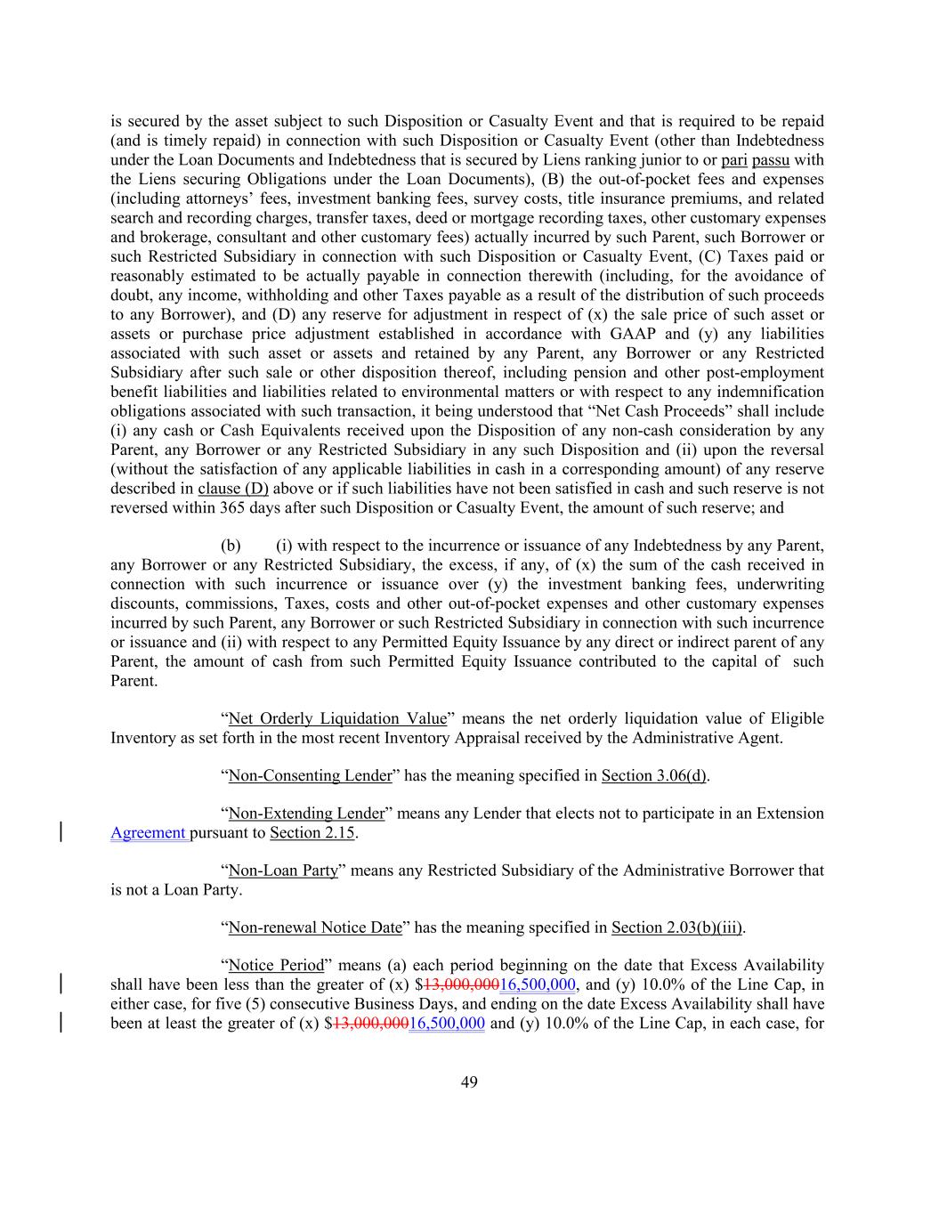 is secured by the asset subject to such Disposition or Casualty Event and that is required to be repaid (and is timely repaid) in connection with such Disposition or Casualty Event (other than Indebtedness under the Loan Documents and Indebtedness that is secured by Liens ranking junior to or pari passu with the Liens securing Obligations under the Loan Documents), (B) the out-of-pocket fees and expenses (including attorneys’ fees, investment banking fees, survey costs, title insurance premiums, and related search and recording charges, transfer taxes, deed or mortgage recording taxes, other customary expenses and brokerage, consultant and other customary fees) actually incurred by such Parent, such Borrower or such Restricted Subsidiary in connection with such Disposition or Casualty Event, (C) Taxes paid or reasonably estimated to be actually payable in connection therewith (including, for the avoidance of doubt, any income, withholding and other Taxes payable as a result of the distribution of such proceeds to any Borrower), and (D) any reserve for adjustment in respect of (x) the sale price of such asset or assets or purchase price adjustment established in accordance with GAAP and (y) any liabilities associated with such asset or assets and retained by any Parent, any Borrower or any Restricted Subsidiary after such sale or other disposition thereof, including pension and other post-employment benefit liabilities and liabilities related to environmental matters or with respect to any indemnification obligations associated with such transaction, it being understood that “Net Cash Proceeds” shall include (i) any cash or Cash Equivalents received upon the Disposition of any non-cash consideration by any Parent, any Borrower or any Restricted Subsidiary in any such Disposition and (ii) upon the reversal (without the satisfaction of any applicable liabilities in cash in a corresponding amount) of any reserve described in clause (D) above or if such liabilities have not been satisfied in cash and such reserve is not reversed within 365 days after such Disposition or Casualty Event, the amount of such reserve; and (b) (i) with respect to the incurrence or issuance of any Indebtedness by any Parent, any Borrower or any Restricted Subsidiary, the excess, if any, of (x) the sum of the cash received in connection with such incurrence or issuance over (y) the investment banking fees, underwriting discounts, commissions, Taxes, costs and other out-of-pocket expenses and other customary expenses incurred by such Parent, any Borrower or such Restricted Subsidiary in connection with such incurrence or issuance and (ii) with respect to any Permitted Equity Issuance by any direct or indirect parent of any Parent, the amount of cash from such Permitted Equity Issuance contributed to the capital of such Parent. “Net Orderly Liquidation Value” means the net orderly liquidation value of Eligible Inventory as set forth in the most recent Inventory Appraisal received by the Administrative Agent. “Non-Consenting Lender” has the meaning specified in Section 3.06(d). “Non-Extending Lender” means any Lender that elects not to participate in an Extension Agreement pursuant to Section 2.15. “Non-Loan Party” means any Restricted Subsidiary of the Administrative Borrower that is not a Loan Party. “Non-renewal Notice Date” has the meaning specified in Section 2.03(b)(iii). “Notice Period” means (a) each period beginning on the date that Excess Availability shall have been less than the greater of (x) $13,000,00016,500,000, and (y) 10.0% of the Line Cap, in either case, for five (5) consecutive Business Days, and ending on the date Excess Availability shall have been at least the greater of (x) $13,000,00016,500,000 and (y) 10.0% of the Line Cap, in each case, for 49