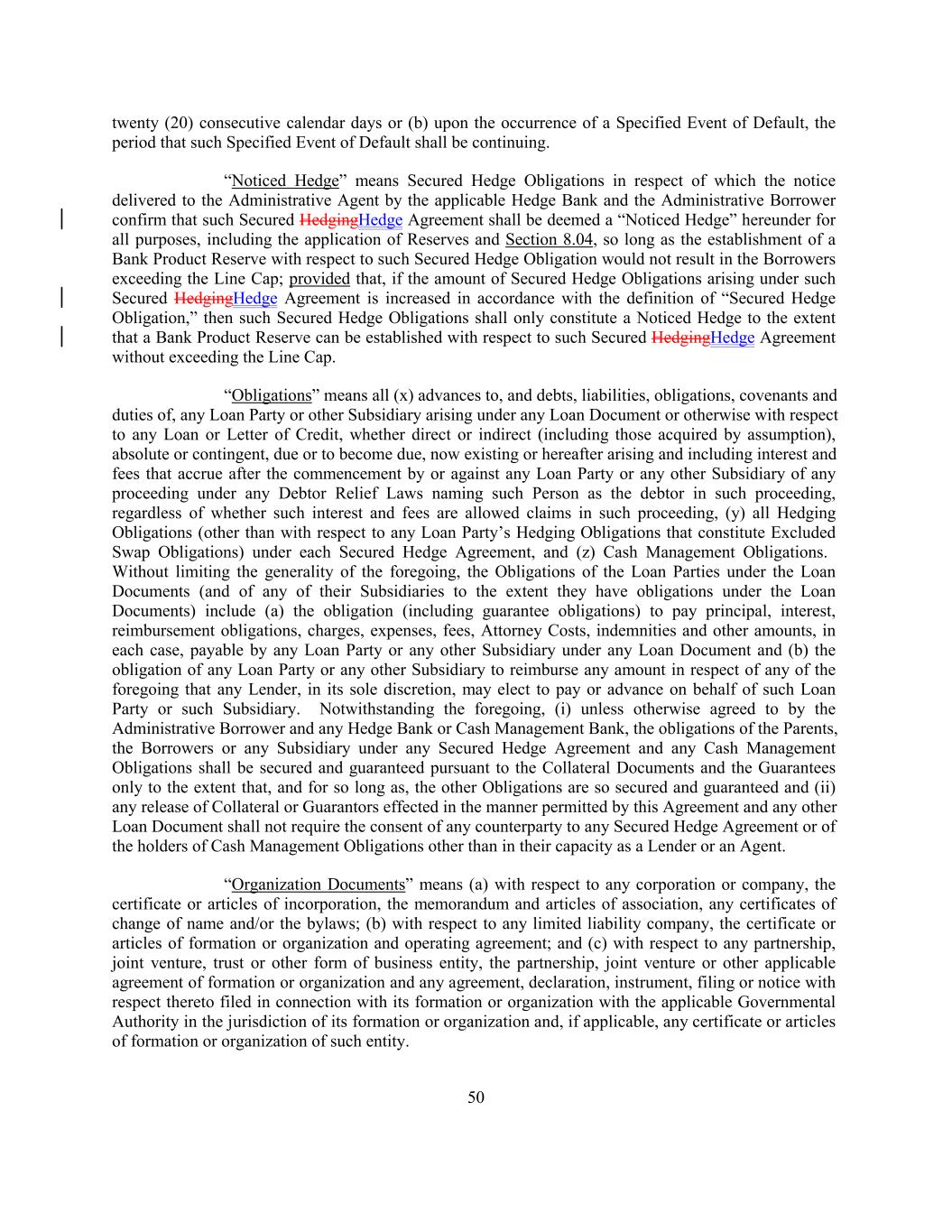 twenty (20) consecutive calendar days or (b) upon the occurrence of a Specified Event of Default, the period that such Specified Event of Default shall be continuing. “Noticed Hedge” means Secured Hedge Obligations in respect of which the notice delivered to the Administrative Agent by the applicable Hedge Bank and the Administrative Borrower confirm that such Secured HedgingHedge Agreement shall be deemed a “Noticed Hedge” hereunder for all purposes, including the application of Reserves and Section 8.04, so long as the establishment of a Bank Product Reserve with respect to such Secured Hedge Obligation would not result in the Borrowers exceeding the Line Cap; provided that, if the amount of Secured Hedge Obligations arising under such Secured HedgingHedge Agreement is increased in accordance with the definition of “Secured Hedge Obligation,” then such Secured Hedge Obligations shall only constitute a Noticed Hedge to the extent that a Bank Product Reserve can be established with respect to such Secured HedgingHedge Agreement without exceeding the Line Cap. “Obligations” means all (x) advances to, and debts, liabilities, obligations, covenants and duties of, any Loan Party or other Subsidiary arising under any Loan Document or otherwise with respect to any Loan or Letter of Credit, whether direct or indirect (including those acquired by assumption), absolute or contingent, due or to become due, now existing or hereafter arising and including interest and fees that accrue after the commencement by or against any Loan Party or any other Subsidiary of any proceeding under any Debtor Relief Laws naming such Person as the debtor in such proceeding, regardless of whether such interest and fees are allowed claims in such proceeding, (y) all Hedging Obligations (other than with respect to any Loan Party’s Hedging Obligations that constitute Excluded Swap Obligations) under each Secured Hedge Agreement, and (z) Cash Management Obligations. Without limiting the generality of the foregoing, the Obligations of the Loan Parties under the Loan Documents (and of any of their Subsidiaries to the extent they have obligations under the Loan Documents) include (a) the obligation (including guarantee obligations) to pay principal, interest, reimbursement obligations, charges, expenses, fees, Attorney Costs, indemnities and other amounts, in each case, payable by any Loan Party or any other Subsidiary under any Loan Document and (b) the obligation of any Loan Party or any other Subsidiary to reimburse any amount in respect of any of the foregoing that any Lender, in its sole discretion, may elect to pay or advance on behalf of such Loan Party or such Subsidiary. Notwithstanding the foregoing, (i) unless otherwise agreed to by the Administrative Borrower and any Hedge Bank or Cash Management Bank, the obligations of the Parents, the Borrowers or any Subsidiary under any Secured Hedge Agreement and any Cash Management Obligations shall be secured and guaranteed pursuant to the Collateral Documents and the Guarantees only to the extent that, and for so long as, the other Obligations are so secured and guaranteed and (ii) any release of Collateral or Guarantors effected in the manner permitted by this Agreement and any other Loan Document shall not require the consent of any counterparty to any Secured Hedge Agreement or of the holders of Cash Management Obligations other than in their capacity as a Lender or an Agent. “Organization Documents” means (a) with respect to any corporation or company, the certificate or articles of incorporation, the memorandum and articles of association, any certificates of change of name and/or the bylaws; (b) with respect to any limited liability company, the certificate or articles of formation or organization and operating agreement; and (c) with respect to any partnership, joint venture, trust or other form of business entity, the partnership, joint venture or other applicable agreement of formation or organization and any agreement, declaration, instrument, filing or notice with respect thereto filed in connection with its formation or organization with the applicable Governmental Authority in the jurisdiction of its formation or organization and, if applicable, any certificate or articles of formation or organization of such entity. 50