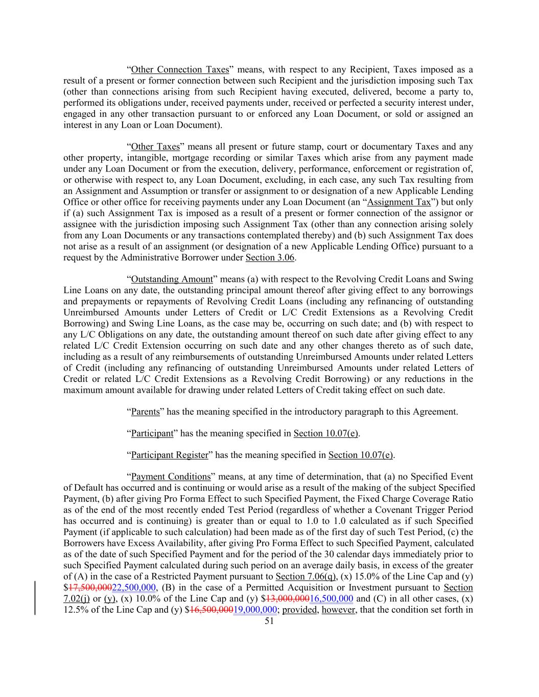 “Other Connection Taxes” means, with respect to any Recipient, Taxes imposed as a result of a present or former connection between such Recipient and the jurisdiction imposing such Tax (other than connections arising from such Recipient having executed, delivered, become a party to, performed its obligations under, received payments under, received or perfected a security interest under, engaged in any other transaction pursuant to or enforced any Loan Document, or sold or assigned an interest in any Loan or Loan Document). “Other Taxes” means all present or future stamp, court or documentary Taxes and any other property, intangible, mortgage recording or similar Taxes which arise from any payment made under any Loan Document or from the execution, delivery, performance, enforcement or registration of, or otherwise with respect to, any Loan Document, excluding, in each case, any such Tax resulting from an Assignment and Assumption or transfer or assignment to or designation of a new Applicable Lending Office or other office for receiving payments under any Loan Document (an “Assignment Tax”) but only if (a) such Assignment Tax is imposed as a result of a present or former connection of the assignor or assignee with the jurisdiction imposing such Assignment Tax (other than any connection arising solely from any Loan Documents or any transactions contemplated thereby) and (b) such Assignment Tax does not arise as a result of an assignment (or designation of a new Applicable Lending Office) pursuant to a request by the Administrative Borrower under Section 3.06. “Outstanding Amount” means (a) with respect to the Revolving Credit Loans and Swing Line Loans on any date, the outstanding principal amount thereof after giving effect to any borrowings and prepayments or repayments of Revolving Credit Loans (including any refinancing of outstanding Unreimbursed Amounts under Letters of Credit or L/C Credit Extensions as a Revolving Credit Borrowing) and Swing Line Loans, as the case may be, occurring on such date; and (b) with respect to any L/C Obligations on any date, the outstanding amount thereof on such date after giving effect to any related L/C Credit Extension occurring on such date and any other changes thereto as of such date, including as a result of any reimbursements of outstanding Unreimbursed Amounts under related Letters of Credit (including any refinancing of outstanding Unreimbursed Amounts under related Letters of Credit or related L/C Credit Extensions as a Revolving Credit Borrowing) or any reductions in the maximum amount available for drawing under related Letters of Credit taking effect on such date. “Parents” has the meaning specified in the introductory paragraph to this Agreement. “Participant” has the meaning specified in Section 10.07(e). “Participant Register” has the meaning specified in Section 10.07(e). “Payment Conditions” means, at any time of determination, that (a) no Specified Event of Default has occurred and is continuing or would arise as a result of the making of the subject Specified Payment, (b) after giving Pro Forma Effect to such Specified Payment, the Fixed Charge Coverage Ratio as of the end of the most recently ended Test Period (regardless of whether a Covenant Trigger Period has occurred and is continuing) is greater than or equal to 1.0 to 1.0 calculated as if such Specified Payment (if applicable to such calculation) had been made as of the first day of such Test Period, (c) the Borrowers have Excess Availability, after giving Pro Forma Effect to such Specified Payment, calculated as of the date of such Specified Payment and for the period of the 30 calendar days immediately prior to such Specified Payment calculated during such period on an average daily basis, in excess of the greater of (A) in the case of a Restricted Payment pursuant to Section 7.06(q), (x) 15.0% of the Line Cap and (y) $17,500,00022,500,000, (B) in the case of a Permitted Acquisition or Investment pursuant to Section 7.02(j) or (y), (x) 10.0% of the Line Cap and (y) $13,000,00016,500,000 and (C) in all other cases, (x) 12.5% of the Line Cap and (y) $16,500,00019,000,000; provided, however, that the condition set forth in 51