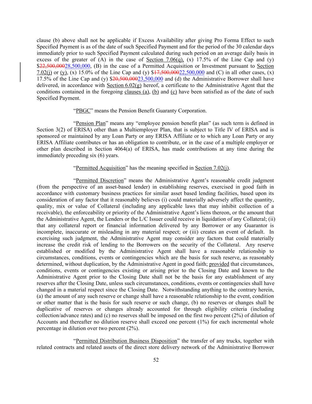 clause (b) above shall not be applicable if Excess Availability after giving Pro Forma Effect to such Specified Payment is as of the date of such Specified Payment and for the period of the 30 calendar days immediately prior to such Specified Payment calculated during such period on an average daily basis in excess of the greater of (A) in the case of Section 7.06(q), (x) 17.5% of the Line Cap and (y) $22,500,00028,500,000, (B) in the case of a Permitted Acquisition or Investment pursuant to Section 7.02(j) or (y), (x) 15.0% of the Line Cap and (y) $17,500,00022,500,000 and (C) in all other cases, (x) 17.5% of the Line Cap and (y) $20,500,00023,500,000 and (d) the Administrative Borrower shall have delivered, in accordance with Section 6.02(g) hereof, a certificate to the Administrative Agent that the conditions contained in the foregoing clauses (a), (b) and (c) have been satisfied as of the date of such Specified Payment. “PBGC” means the Pension Benefit Guaranty Corporation. “Pension Plan” means any “employee pension benefit plan” (as such term is defined in Section 3(2) of ERISA) other than a Multiemployer Plan, that is subject to Title IV of ERISA and is sponsored or maintained by any Loan Party or any ERISA Affiliate or to which any Loan Party or any ERISA Affiliate contributes or has an obligation to contribute, or in the case of a multiple employer or other plan described in Section 4064(a) of ERISA, has made contributions at any time during the immediately preceding six (6) years. “Permitted Acquisition” has the meaning specified in Section 7.02(j). “Permitted Discretion” means the Administrative Agent’s reasonable credit judgment (from the perspective of an asset-based lender) in establishing reserves, exercised in good faith in accordance with customary business practices for similar asset based lending facilities, based upon its consideration of any factor that it reasonably believes (i) could materially adversely affect the quantity, quality, mix or value of Collateral (including any applicable laws that may inhibit collection of a receivable), the enforceability or priority of the Administrative Agent’s liens thereon, or the amount that the Administrative Agent, the Lenders or the L/C Issuer could receive in liquidation of any Collateral; (ii) that any collateral report or financial information delivered by any Borrower or any Guarantor is incomplete, inaccurate or misleading in any material respect; or (iii) creates an event of default. In exercising such judgment, the Administrative Agent may consider any factors that could materially increase the credit risk of lending to the Borrowers on the security of the Collateral. Any reserve established or modified by the Administrative Agent shall have a reasonable relationship to circumstances, conditions, events or contingencies which are the basis for such reserve, as reasonably determined, without duplication, by the Administrative Agent in good faith; provided that circumstances, conditions, events or contingencies existing or arising prior to the Closing Date and known to the Administrative Agent prior to the Closing Date shall not be the basis for any establishment of any reserves after the Closing Date, unless such circumstances, conditions, events or contingencies shall have changed in a material respect since the Closing Date. Notwithstanding anything to the contrary herein, (a) the amount of any such reserve or change shall have a reasonable relationship to the event, condition or other matter that is the basis for such reserve or such change, (b) no reserves or changes shall be duplicative of reserves or changes already accounted for through eligibility criteria (including collection/advance rates) and (c) no reserves shall be imposed on the first two percent (2%) of dilution of Accounts and thereafter no dilution reserve shall exceed one percent (1%) for each incremental whole percentage in dilution over two percent (2%). “Permitted Distribution Business Disposition” the transfer of any trucks, together with related contracts and related assets of the direct store delivery network of the Administrative Borrower 52