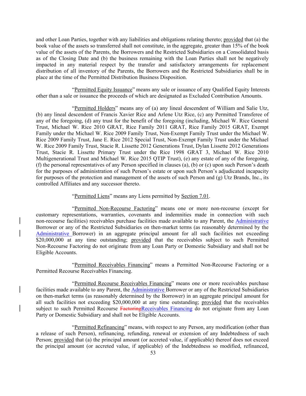 and other Loan Parties, together with any liabilities and obligations relating thereto; provided that (a) the book value of the assets so transferred shall not constitute, in the aggregate, greater than 15% of the book value of the assets of the Parents, the Borrowers and the Restricted Subsidiaries on a Consolidated basis as of the Closing Date and (b) the business remaining with the Loan Parties shall not be negatively impacted in any material respect by the transfer and satisfactory arrangements for replacement distribution of all inventory of the Parents, the Borrowers and the Restricted Subsidiaries shall be in place at the time of the Permitted Distribution Business Disposition. “Permitted Equity Issuance” means any sale or issuance of any Qualified Equity Interests other than a sale or issuance the proceeds of which are designated as Excluded Contribution Amounts. “Permitted Holders” means any of (a) any lineal descendent of William and Salie Utz, (b) any lineal descendent of Francis Xavier Rice and Arlene Utz Rice, (c) any Permitted Transferee of any of the foregoing, (d) any trust for the benefit of the foregoing (including, Michael W. Rice General Trust, Michael W. Rice 2010 GRAT, Rice Family 2011 GRAT, Rice Family 2015 GRAT, Exempt Family under the Michael W. Rice 2009 Family Trust, Non-Exempt Family Trust under the Michael W. Rice 2009 Family Trust, Jane E. Rice 2012 Special Trust, Non-Exempt Family Trust under the Michael W. Rice 2009 Family Trust, Stacie R. Lissette 2012 Generations Trust, Dylan Lissette 2012 Generations Trust, Stacie R. Lissette Primary Trust under the Rice 1998 GRAT 3, Michael W. Rice 2010 Multigenerational Trust and Michael W. Rice 2015 QTIP Trust), (e) any estate of any of the foregoing, (f) the personal representatives of any Person specified in clauses (a), (b) or (c) upon such Person’s death for the purposes of administration of such Person’s estate or upon such Person’s adjudicated incapacity for purposes of the protection and management of the assets of such Person and (g) Utz Brands, Inc., its controlled Affiliates and any successor thereto. “Permitted Liens” means any Liens permitted by Section 7.01. “Permitted Non-Recourse Factoring” means one or more non-recourse (except for customary representations, warranties, covenants and indemnities made in connection with such non-recourse facilities) receivables purchase facilities made available to any Parent, the Administrative Borrower or any of the Restricted Subsidiaries on then-market terms (as reasonably determined by the Administrative Borrower) in an aggregate principal amount for all such facilities not exceeding $20,000,000 at any time outstanding; provided that the receivables subject to such Permitted Non-Recourse Factoring do not originate from any Loan Party or Domestic Subsidiary and shall not be Eligible Accounts. “Permitted Receivables Financing” means a Permitted Non-Recourse Factoring or a Permitted Recourse Receivables Financing. “Permitted Recourse Receivables Financing” means one or more receivables purchase facilities made available to any Parent, the Administrative Borrower or any of the Restricted Subsidiaries on then-market terms (as reasonably determined by the Borrower) in an aggregate principal amount for all such facilities not exceeding $20,000,000 at any time outstanding; provided that the receivables subject to such Permitted Recourse FactoringReceivables Financing do not originate from any Loan Party or Domestic Subsidiary and shall not be Eligible Accounts. “Permitted Refinancing” means, with respect to any Person, any modification (other than a release of such Person), refinancing, refunding, renewal or extension of any Indebtedness of such Person; provided that (a) the principal amount (or accreted value, if applicable) thereof does not exceed the principal amount (or accreted value, if applicable) of the Indebtedness so modified, refinanced, 53