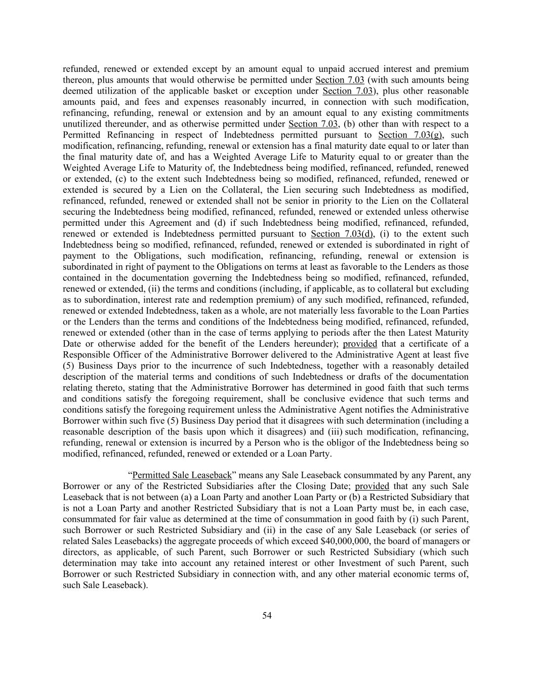refunded, renewed or extended except by an amount equal to unpaid accrued interest and premium thereon, plus amounts that would otherwise be permitted under Section 7.03 (with such amounts being deemed utilization of the applicable basket or exception under Section 7.03), plus other reasonable amounts paid, and fees and expenses reasonably incurred, in connection with such modification, refinancing, refunding, renewal or extension and by an amount equal to any existing commitments unutilized thereunder, and as otherwise permitted under Section 7.03, (b) other than with respect to a Permitted Refinancing in respect of Indebtedness permitted pursuant to Section 7.03(g), such modification, refinancing, refunding, renewal or extension has a final maturity date equal to or later than the final maturity date of, and has a Weighted Average Life to Maturity equal to or greater than the Weighted Average Life to Maturity of, the Indebtedness being modified, refinanced, refunded, renewed or extended, (c) to the extent such Indebtedness being so modified, refinanced, refunded, renewed or extended is secured by a Lien on the Collateral, the Lien securing such Indebtedness as modified, refinanced, refunded, renewed or extended shall not be senior in priority to the Lien on the Collateral securing the Indebtedness being modified, refinanced, refunded, renewed or extended unless otherwise permitted under this Agreement and (d) if such Indebtedness being modified, refinanced, refunded, renewed or extended is Indebtedness permitted pursuant to Section 7.03(d), (i) to the extent such Indebtedness being so modified, refinanced, refunded, renewed or extended is subordinated in right of payment to the Obligations, such modification, refinancing, refunding, renewal or extension is subordinated in right of payment to the Obligations on terms at least as favorable to the Lenders as those contained in the documentation governing the Indebtedness being so modified, refinanced, refunded, renewed or extended, (ii) the terms and conditions (including, if applicable, as to collateral but excluding as to subordination, interest rate and redemption premium) of any such modified, refinanced, refunded, renewed or extended Indebtedness, taken as a whole, are not materially less favorable to the Loan Parties or the Lenders than the terms and conditions of the Indebtedness being modified, refinanced, refunded, renewed or extended (other than in the case of terms applying to periods after the then Latest Maturity Date or otherwise added for the benefit of the Lenders hereunder); provided that a certificate of a Responsible Officer of the Administrative Borrower delivered to the Administrative Agent at least five (5) Business Days prior to the incurrence of such Indebtedness, together with a reasonably detailed description of the material terms and conditions of such Indebtedness or drafts of the documentation relating thereto, stating that the Administrative Borrower has determined in good faith that such terms and conditions satisfy the foregoing requirement, shall be conclusive evidence that such terms and conditions satisfy the foregoing requirement unless the Administrative Agent notifies the Administrative Borrower within such five (5) Business Day period that it disagrees with such determination (including a reasonable description of the basis upon which it disagrees) and (iii) such modification, refinancing, refunding, renewal or extension is incurred by a Person who is the obligor of the Indebtedness being so modified, refinanced, refunded, renewed or extended or a Loan Party. “Permitted Sale Leaseback” means any Sale Leaseback consummated by any Parent, any Borrower or any of the Restricted Subsidiaries after the Closing Date; provided that any such Sale Leaseback that is not between (a) a Loan Party and another Loan Party or (b) a Restricted Subsidiary that is not a Loan Party and another Restricted Subsidiary that is not a Loan Party must be, in each case, consummated for fair value as determined at the time of consummation in good faith by (i) such Parent, such Borrower or such Restricted Subsidiary and (ii) in the case of any Sale Leaseback (or series of related Sales Leasebacks) the aggregate proceeds of which exceed $40,000,000, the board of managers or directors, as applicable, of such Parent, such Borrower or such Restricted Subsidiary (which such determination may take into account any retained interest or other Investment of such Parent, such Borrower or such Restricted Subsidiary in connection with, and any other material economic terms of, such Sale Leaseback). 54