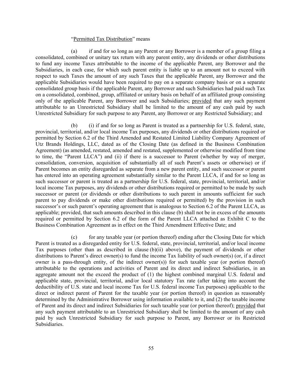 “Permitted Tax Distribution” means (a) if and for so long as any Parent or any Borrower is a member of a group filing a consolidated, combined or unitary tax return with any parent entity, any dividends or other distributions to fund any income Taxes attributable to the income of the applicable Parent, any Borrower and the Subsidiaries, in each case, for which such parent entity is liable up to an amount not to exceed with respect to such Taxes the amount of any such Taxes that the applicable Parent, any Borrower and the applicable Subsidiaries would have been required to pay on a separate company basis or on a separate consolidated group basis if the applicable Parent, any Borrower and such Subsidiaries had paid such Tax on a consolidated, combined, group, affiliated or unitary basis on behalf of an affiliated group consisting only of the applicable Parent, any Borrower and such Subsidiaries; provided that any such payment attributable to an Unrestricted Subsidiary shall be limited to the amount of any cash paid by such Unrestricted Subsidiary for such purpose to any Parent, any Borrower or any Restricted Subsidiary; and (b) (i) if and for so long as Parent is treated as a partnership for U.S. federal, state, provincial, territorial, and/or local income Tax purposes, any dividends or other distributions required or permitted by Section 6.2 of the Third Amended and Restated Limited Liability Company Agreement of Utz Brands Holdings, LLC, dated as of the Closing Date (as defined in the Business Combination Agreement) (as amended, restated, amended and restated, supplemented or otherwise modified from time to time, the “Parent LLCA”) and (ii) if there is a successor to Parent (whether by way of merger, consolidation, conversion, acquisition of substantially all of such Parent’s assets or otherwise) or if Parent becomes an entity disregarded as separate from a new parent entity, and such successor or parent has entered into an operating agreement substantially similar to the Parent LLCA, if and for so long as such successor or parent is treated as a partnership for U.S. federal, state, provincial, territorial, and/or local income Tax purposes, any dividends or other distributions required or permitted to be made by such successor or parent (or dividends or other distributions to such parent in amounts sufficient for such parent to pay dividends or make other distributions required or permitted) by the provision in such successor’s or such parent’s operating agreement that is analogous to Section 6.2 of the Parent LLCA, as applicable; provided, that such amounts described in this clause (b) shall not be in excess of the amounts required or permitted by Section 6.2 of the form of the Parent LLCA attached as Exhibit C to the Business Combination Agreement as in effect on the Third Amendment Effective Date; and (c) for any taxable year (or portion thereof) ending after the Closing Date for which Parent is treated as a disregarded entity for U.S. federal, state, provincial, territorial, and/or local income Tax purposes (other than as described in clause (b)(ii) above), the payment of dividends or other distributions to Parent’s direct owner(s) to fund the income Tax liability of such owner(s) (or, if a direct owner is a pass-through entity, of the indirect owner(s)) for such taxable year (or portion thereof) attributable to the operations and activities of Parent and its direct and indirect Subsidiaries, in an aggregate amount not the exceed the product of (1) the highest combined marginal U.S. federal and applicable state, provincial, territorial, and/or local statutory Tax rate (after taking into account the deductibility of U.S. state and local income Tax for U.S. federal income Tax purposes) applicable to the direct or indirect parent of Parent for the taxable year (or portion thereof) in question as reasonably determined by the Administrative Borrower using information available to it, and (2) the taxable income of Parent and its direct and indirect Subsidiaries for such taxable year (or portion thereof); provided that any such payment attributable to an Unrestricted Subsidiary shall be limited to the amount of any cash paid by such Unrestricted Subsidiary for such purpose to Parent, any Borrower or its Restricted Subsidiaries. 55