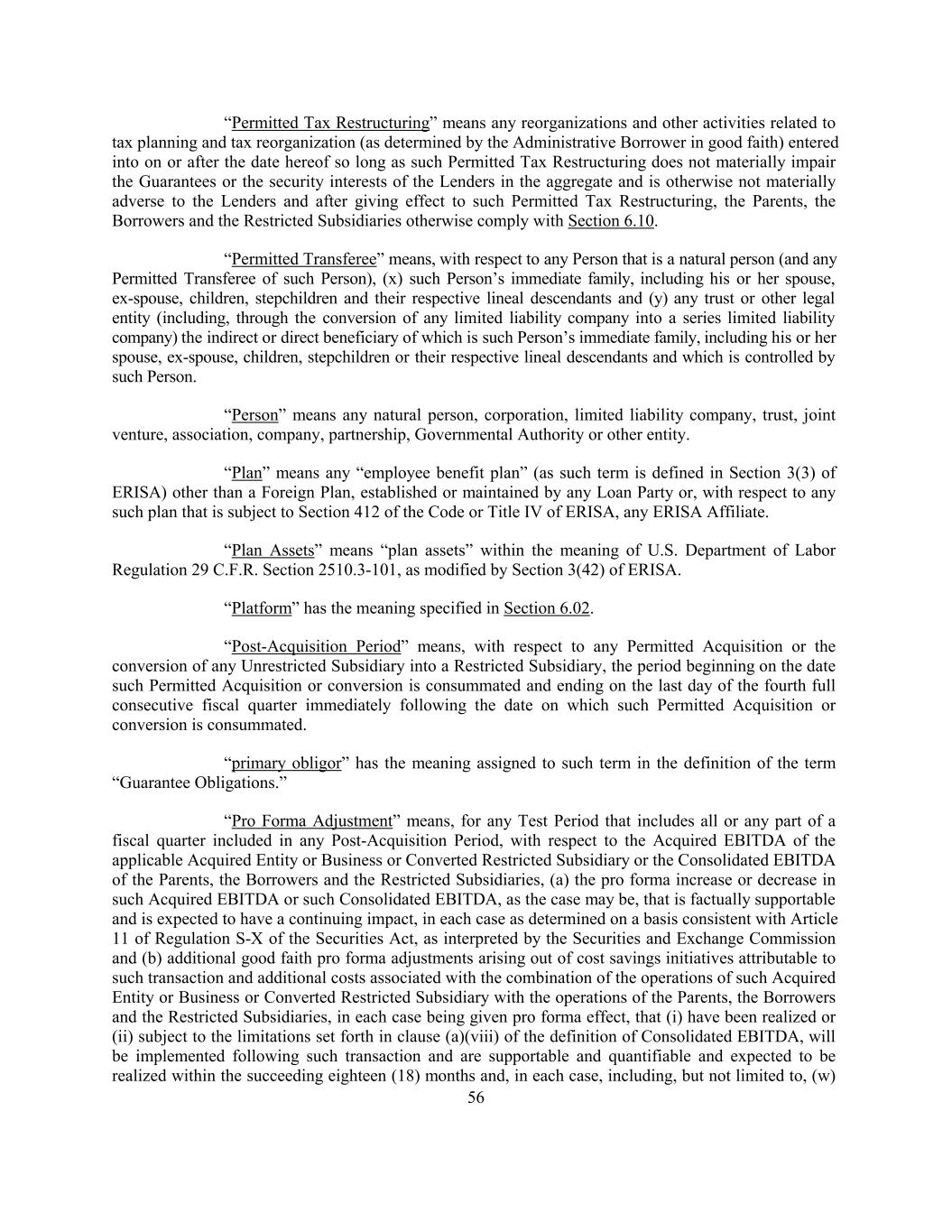 “Permitted Tax Restructuring” means any reorganizations and other activities related to tax planning and tax reorganization (as determined by the Administrative Borrower in good faith) entered into on or after the date hereof so long as such Permitted Tax Restructuring does not materially impair the Guarantees or the security interests of the Lenders in the aggregate and is otherwise not materially adverse to the Lenders and after giving effect to such Permitted Tax Restructuring, the Parents, the Borrowers and the Restricted Subsidiaries otherwise comply with Section 6.10. “Permitted Transferee” means, with respect to any Person that is a natural person (and any Permitted Transferee of such Person), (x) such Person’s immediate family, including his or her spouse, ex-spouse, children, stepchildren and their respective lineal descendants and (y) any trust or other legal entity (including, through the conversion of any limited liability company into a series limited liability company) the indirect or direct beneficiary of which is such Person’s immediate family, including his or her spouse, ex-spouse, children, stepchildren or their respective lineal descendants and which is controlled by such Person. “Person” means any natural person, corporation, limited liability company, trust, joint venture, association, company, partnership, Governmental Authority or other entity. “Plan” means any “employee benefit plan” (as such term is defined in Section 3(3) of ERISA) other than a Foreign Plan, established or maintained by any Loan Party or, with respect to any such plan that is subject to Section 412 of the Code or Title IV of ERISA, any ERISA Affiliate. “Plan Assets” means “plan assets” within the meaning of U.S. Department of Labor Regulation 29 C.F.R. Section 2510.3-101, as modified by Section 3(42) of ERISA. “Platform” has the meaning specified in Section 6.02. “Post-Acquisition Period” means, with respect to any Permitted Acquisition or the conversion of any Unrestricted Subsidiary into a Restricted Subsidiary, the period beginning on the date such Permitted Acquisition or conversion is consummated and ending on the last day of the fourth full consecutive fiscal quarter immediately following the date on which such Permitted Acquisition or conversion is consummated. “primary obligor” has the meaning assigned to such term in the definition of the term “Guarantee Obligations.” “Pro Forma Adjustment” means, for any Test Period that includes all or any part of a fiscal quarter included in any Post-Acquisition Period, with respect to the Acquired EBITDA of the applicable Acquired Entity or Business or Converted Restricted Subsidiary or the Consolidated EBITDA of the Parents, the Borrowers and the Restricted Subsidiaries, (a) the pro forma increase or decrease in such Acquired EBITDA or such Consolidated EBITDA, as the case may be, that is factually supportable and is expected to have a continuing impact, in each case as determined on a basis consistent with Article 11 of Regulation S-X of the Securities Act, as interpreted by the Securities and Exchange Commission and (b) additional good faith pro forma adjustments arising out of cost savings initiatives attributable to such transaction and additional costs associated with the combination of the operations of such Acquired Entity or Business or Converted Restricted Subsidiary with the operations of the Parents, the Borrowers and the Restricted Subsidiaries, in each case being given pro forma effect, that (i) have been realized or (ii) subject to the limitations set forth in clause (a)(viii) of the definition of Consolidated EBITDA, will be implemented following such transaction and are supportable and quantifiable and expected to be realized within the succeeding eighteen (18) months and, in each case, including, but not limited to, (w) 56