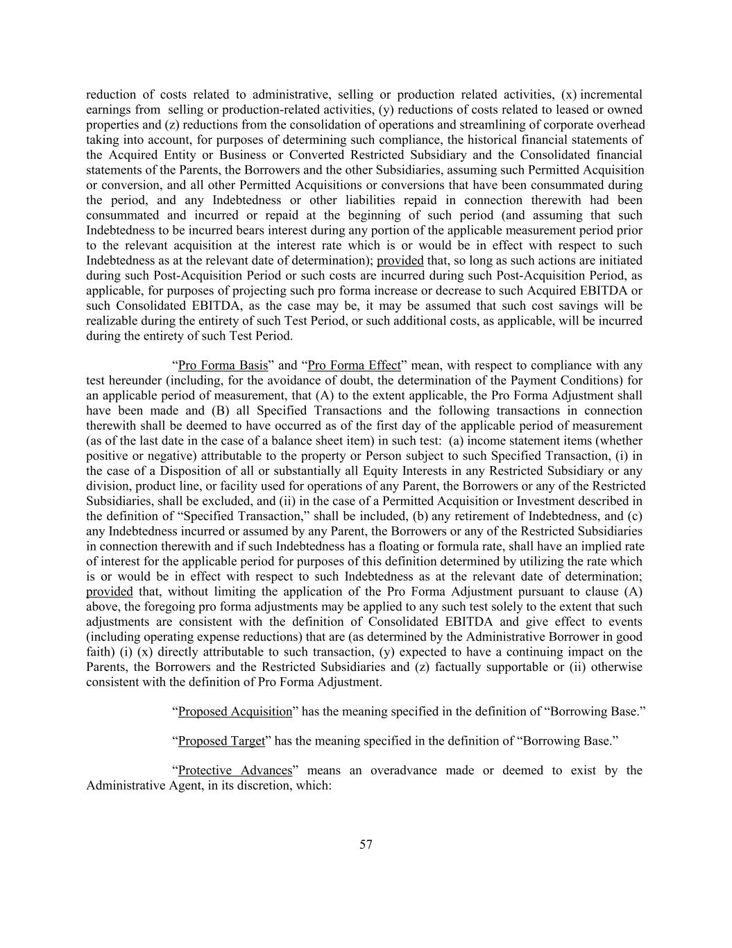 reduction of costs related to administrative, selling or production related activities, (x) incremental earnings from selling or production-related activities, (y) reductions of costs related to leased or owned properties and (z) reductions from the consolidation of operations and streamlining of corporate overhead taking into account, for purposes of determining such compliance, the historical financial statements of the Acquired Entity or Business or Converted Restricted Subsidiary and the Consolidated financial statements of the Parents, the Borrowers and the other Subsidiaries, assuming such Permitted Acquisition or conversion, and all other Permitted Acquisitions or conversions that have been consummated during the period, and any Indebtedness or other liabilities repaid in connection therewith had been consummated and incurred or repaid at the beginning of such period (and assuming that such Indebtedness to be incurred bears interest during any portion of the applicable measurement period prior to the relevant acquisition at the interest rate which is or would be in effect with respect to such Indebtedness as at the relevant date of determination); provided that, so long as such actions are initiated during such Post-Acquisition Period or such costs are incurred during such Post-Acquisition Period, as applicable, for purposes of projecting such pro forma increase or decrease to such Acquired EBITDA or such Consolidated EBITDA, as the case may be, it may be assumed that such cost savings will be realizable during the entirety of such Test Period, or such additional costs, as applicable, will be incurred during the entirety of such Test Period. “Pro Forma Basis” and “Pro Forma Effect” mean, with respect to compliance with any test hereunder (including, for the avoidance of doubt, the determination of the Payment Conditions) for an applicable period of measurement, that (A) to the extent applicable, the Pro Forma Adjustment shall have been made and (B) all Specified Transactions and the following transactions in connection therewith shall be deemed to have occurred as of the first day of the applicable period of measurement (as of the last date in the case of a balance sheet item) in such test: (a) income statement items (whether positive or negative) attributable to the property or Person subject to such Specified Transaction, (i) in the case of a Disposition of all or substantially all Equity Interests in any Restricted Subsidiary or any division, product line, or facility used for operations of any Parent, the Borrowers or any of the Restricted Subsidiaries, shall be excluded, and (ii) in the case of a Permitted Acquisition or Investment described in the definition of “Specified Transaction,” shall be included, (b) any retirement of Indebtedness, and (c) any Indebtedness incurred or assumed by any Parent, the Borrowers or any of the Restricted Subsidiaries in connection therewith and if such Indebtedness has a floating or formula rate, shall have an implied rate of interest for the applicable period for purposes of this definition determined by utilizing the rate which is or would be in effect with respect to such Indebtedness as at the relevant date of determination; provided that, without limiting the application of the Pro Forma Adjustment pursuant to clause (A) above, the foregoing pro forma adjustments may be applied to any such test solely to the extent that such adjustments are consistent with the definition of Consolidated EBITDA and give effect to events (including operating expense reductions) that are (as determined by the Administrative Borrower in good faith) (i) (x) directly attributable to such transaction, (y) expected to have a continuing impact on the Parents, the Borrowers and the Restricted Subsidiaries and (z) factually supportable or (ii) otherwise consistent with the definition of Pro Forma Adjustment. “Proposed Acquisition” has the meaning specified in the definition of “Borrowing Base.” “Proposed Target” has the meaning specified in the definition of “Borrowing Base.” “Protective Advances” means an overadvance made or deemed to exist by the Administrative Agent, in its discretion, which: 57