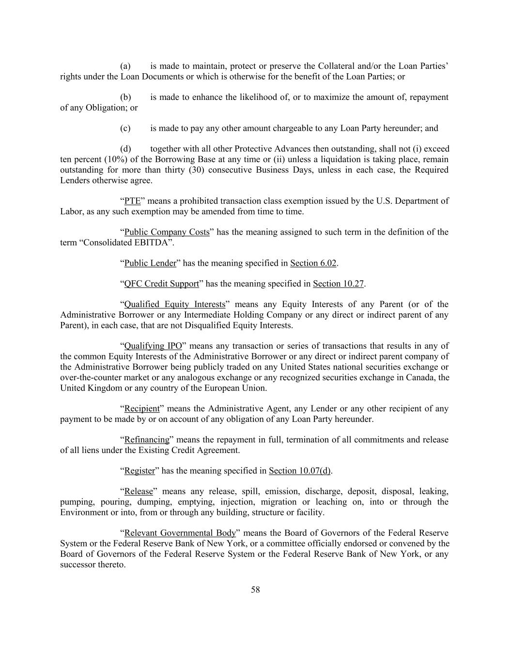(a) is made to maintain, protect or preserve the Collateral and/or the Loan Parties’ rights under the Loan Documents or which is otherwise for the benefit of the Loan Parties; or (b) is made to enhance the likelihood of, or to maximize the amount of, repayment of any Obligation; or (c) is made to pay any other amount chargeable to any Loan Party hereunder; and (d) together with all other Protective Advances then outstanding, shall not (i) exceed ten percent (10%) of the Borrowing Base at any time or (ii) unless a liquidation is taking place, remain outstanding for more than thirty (30) consecutive Business Days, unless in each case, the Required Lenders otherwise agree. “PTE” means a prohibited transaction class exemption issued by the U.S. Department of Labor, as any such exemption may be amended from time to time. “Public Company Costs” has the meaning assigned to such term in the definition of the term “Consolidated EBITDA”. “Public Lender” has the meaning specified in Section 6.02. “QFC Credit Support” has the meaning specified in Section 10.27. “Qualified Equity Interests” means any Equity Interests of any Parent (or of the Administrative Borrower or any Intermediate Holding Company or any direct or indirect parent of any Parent), in each case, that are not Disqualified Equity Interests. “Qualifying IPO” means any transaction or series of transactions that results in any of the common Equity Interests of the Administrative Borrower or any direct or indirect parent company of the Administrative Borrower being publicly traded on any United States national securities exchange or over-the-counter market or any analogous exchange or any recognized securities exchange in Canada, the United Kingdom or any country of the European Union. “Recipient” means the Administrative Agent, any Lender or any other recipient of any payment to be made by or on account of any obligation of any Loan Party hereunder. “Refinancing” means the repayment in full, termination of all commitments and release of all liens under the Existing Credit Agreement. “Register” has the meaning specified in Section 10.07(d). “Release” means any release, spill, emission, discharge, deposit, disposal, leaking, pumping, pouring, dumping, emptying, injection, migration or leaching on, into or through the Environment or into, from or through any building, structure or facility. “Relevant Governmental Body” means the Board of Governors of the Federal Reserve System or the Federal Reserve Bank of New York, or a committee officially endorsed or convened by the Board of Governors of the Federal Reserve System or the Federal Reserve Bank of New York, or any successor thereto. 58