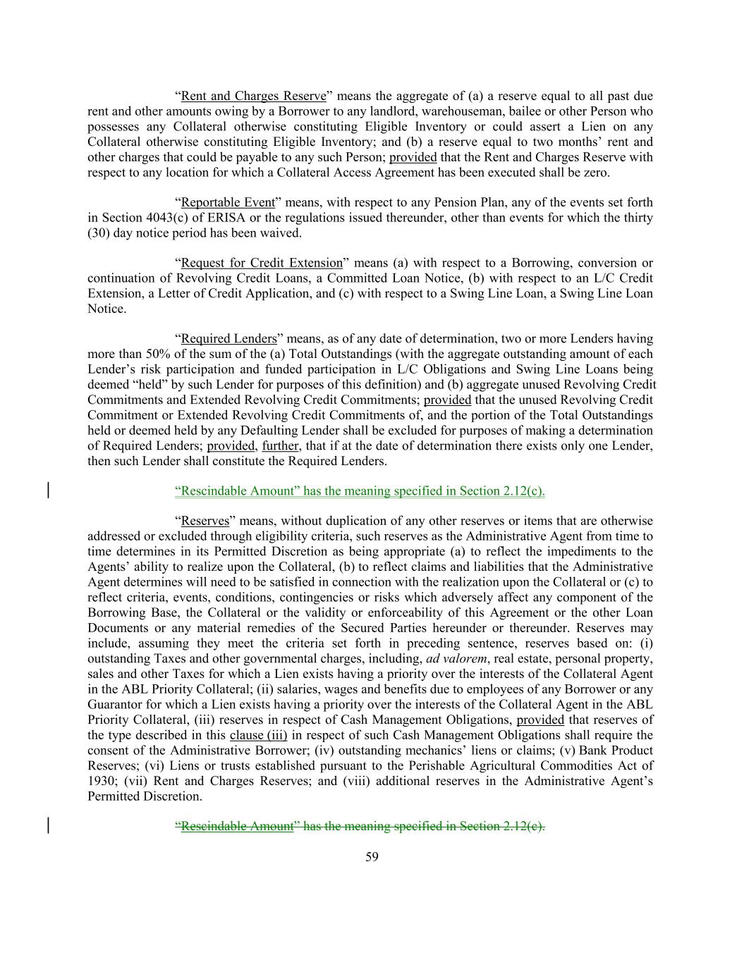 “Rent and Charges Reserve” means the aggregate of (a) a reserve equal to all past due rent and other amounts owing by a Borrower to any landlord, warehouseman, bailee or other Person who possesses any Collateral otherwise constituting Eligible Inventory or could assert a Lien on any Collateral otherwise constituting Eligible Inventory; and (b) a reserve equal to two months’ rent and other charges that could be payable to any such Person; provided that the Rent and Charges Reserve with respect to any location for which a Collateral Access Agreement has been executed shall be zero. “Reportable Event” means, with respect to any Pension Plan, any of the events set forth in Section 4043(c) of ERISA or the regulations issued thereunder, other than events for which the thirty (30) day notice period has been waived. “Request for Credit Extension” means (a) with respect to a Borrowing, conversion or continuation of Revolving Credit Loans, a Committed Loan Notice, (b) with respect to an L/C Credit Extension, a Letter of Credit Application, and (c) with respect to a Swing Line Loan, a Swing Line Loan Notice. “Required Lenders” means, as of any date of determination, two or more Lenders having more than 50% of the sum of the (a) Total Outstandings (with the aggregate outstanding amount of each Lender’s risk participation and funded participation in L/C Obligations and Swing Line Loans being deemed “held” by such Lender for purposes of this definition) and (b) aggregate unused Revolving Credit Commitments and Extended Revolving Credit Commitments; provided that the unused Revolving Credit Commitment or Extended Revolving Credit Commitments of, and the portion of the Total Outstandings held or deemed held by any Defaulting Lender shall be excluded for purposes of making a determination of Required Lenders; provided, further, that if at the date of determination there exists only one Lender, then such Lender shall constitute the Required Lenders. “Rescindable Amount” has the meaning specified in Section 2.12(c). “Reserves” means, without duplication of any other reserves or items that are otherwise addressed or excluded through eligibility criteria, such reserves as the Administrative Agent from time to time determines in its Permitted Discretion as being appropriate (a) to reflect the impediments to the Agents’ ability to realize upon the Collateral, (b) to reflect claims and liabilities that the Administrative Agent determines will need to be satisfied in connection with the realization upon the Collateral or (c) to reflect criteria, events, conditions, contingencies or risks which adversely affect any component of the Borrowing Base, the Collateral or the validity or enforceability of this Agreement or the other Loan Documents or any material remedies of the Secured Parties hereunder or thereunder. Reserves may include, assuming they meet the criteria set forth in preceding sentence, reserves based on: (i) outstanding Taxes and other governmental charges, including, ad valorem, real estate, personal property, sales and other Taxes for which a Lien exists having a priority over the interests of the Collateral Agent in the ABL Priority Collateral; (ii) salaries, wages and benefits due to employees of any Borrower or any Guarantor for which a Lien exists having a priority over the interests of the Collateral Agent in the ABL Priority Collateral, (iii) reserves in respect of Cash Management Obligations, provided that reserves of the type described in this clause (iii) in respect of such Cash Management Obligations shall require the consent of the Administrative Borrower; (iv) outstanding mechanics’ liens or claims; (v) Bank Product Reserves; (vi) Liens or trusts established pursuant to the Perishable Agricultural Commodities Act of 1930; (vii) Rent and Charges Reserves; and (viii) additional reserves in the Administrative Agent’s Permitted Discretion. “Rescindable Amount” has the meaning specified in Section 2.12(c). 59
