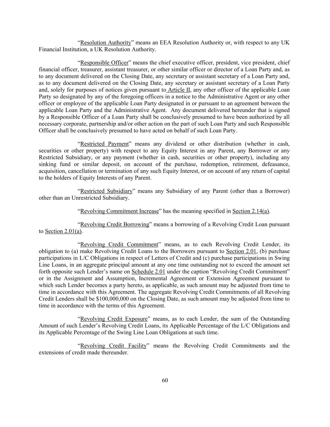 “Resolution Authority” means an EEA Resolution Authority or, with respect to any UK Financial Institution, a UK Resolution Authority. “Responsible Officer” means the chief executive officer, president, vice president, chief financial officer, treasurer, assistant treasurer, or other similar officer or director of a Loan Party and, as to any document delivered on the Closing Date, any secretary or assistant secretary of a Loan Party and, as to any document delivered on the Closing Date, any secretary or assistant secretary of a Loan Party and, solely for purposes of notices given pursuant to Article II, any other officer of the applicable Loan Party so designated by any of the foregoing officers in a notice to the Administrative Agent or any other officer or employee of the applicable Loan Party designated in or pursuant to an agreement between the applicable Loan Party and the Administrative Agent. Any document delivered hereunder that is signed by a Responsible Officer of a Loan Party shall be conclusively presumed to have been authorized by all necessary corporate, partnership and/or other action on the part of such Loan Party and such Responsible Officer shall be conclusively presumed to have acted on behalf of such Loan Party. “Restricted Payment” means any dividend or other distribution (whether in cash, securities or other property) with respect to any Equity Interest in any Parent, any Borrower or any Restricted Subsidiary, or any payment (whether in cash, securities or other property), including any sinking fund or similar deposit, on account of the purchase, redemption, retirement, defeasance, acquisition, cancellation or termination of any such Equity Interest, or on account of any return of capital to the holders of Equity Interests of any Parent. “Restricted Subsidiary” means any Subsidiary of any Parent (other than a Borrower) other than an Unrestricted Subsidiary. “Revolving Commitment Increase” has the meaning specified in Section 2.14(a). “Revolving Credit Borrowing” means a borrowing of a Revolving Credit Loan pursuant to Section 2.01(a). “Revolving Credit Commitment” means, as to each Revolving Credit Lender, its obligation to (a) make Revolving Credit Loans to the Borrowers pursuant to Section 2.01, (b) purchase participations in L/C Obligations in respect of Letters of Credit and (c) purchase participations in Swing Line Loans, in an aggregate principal amount at any one time outstanding not to exceed the amount set forth opposite such Lender’s name on Schedule 2.01 under the caption “Revolving Credit Commitment” or in the Assignment and Assumption, Incremental Agreement or Extension Agreement pursuant to which such Lender becomes a party hereto, as applicable, as such amount may be adjusted from time to time in accordance with this Agreement. The aggregate Revolving Credit Commitments of all Revolving Credit Lenders shall be $100,000,000 on the Closing Date, as such amount may be adjusted from time to time in accordance with the terms of this Agreement. “Revolving Credit Exposure” means, as to each Lender, the sum of the Outstanding Amount of such Lender’s Revolving Credit Loans, its Applicable Percentage of the L/C Obligations and its Applicable Percentage of the Swing Line Loan Obligations at such time. “Revolving Credit Facility” means the Revolving Credit Commitments and the extensions of credit made thereunder. 60