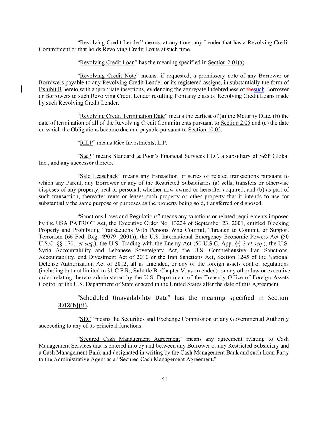 “Revolving Credit Lender” means, at any time, any Lender that has a Revolving Credit Commitment or that holds Revolving Credit Loans at such time. “Revolving Credit Loan” has the meaning specified in Section 2.01(a). “Revolving Credit Note” means, if requested, a promissory note of any Borrower or Borrowers payable to any Revolving Credit Lender or its registered assigns, in substantially the form of Exhibit B hereto with appropriate insertions, evidencing the aggregate Indebtedness of thesuch Borrower or Borrowers to such Revolving Credit Lender resulting from any class of Revolving Credit Loans made by such Revolving Credit Lender. “Revolving Credit Termination Date” means the earliest of (a) the Maturity Date, (b) the date of termination of all of the Revolving Credit Commitments pursuant to Section 2.05 and (c) the date on which the Obligations become due and payable pursuant to Section 10.02. “RILP” means Rice Investments, L.P. “S&P” means Standard & Poor’s Financial Services LLC, a subsidiary of S&P Global Inc., and any successor thereto. “Sale Leaseback” means any transaction or series of related transactions pursuant to which any Parent, any Borrower or any of the Restricted Subsidiaries (a) sells, transfers or otherwise disposes of any property, real or personal, whether now owned or hereafter acquired, and (b) as part of such transaction, thereafter rents or leases such property or other property that it intends to use for substantially the same purpose or purposes as the property being sold, transferred or disposed. “Sanctions Laws and Regulations” means any sanctions or related requirements imposed by the USA PATRIOT Act, the Executive Order No. 13224 of September 23, 2001, entitled Blocking Property and Prohibiting Transactions With Persons Who Commit, Threaten to Commit, or Support Terrorism (66 Fed. Reg. 49079 (2001)), the U.S. International Emergency Economic Powers Act (50 U.S.C. §§ 1701 et seq.), the U.S. Trading with the Enemy Act (50 U.S.C. App. §§ 2 et seq.), the U.S. Syria Accountability and Lebanese Sovereignty Act, the U.S. Comprehensive Iran Sanctions, Accountability, and Divestment Act of 2010 or the Iran Sanctions Act, Section 1245 of the National Defense Authorization Act of 2012, all as amended, or any of the foreign assets control regulations (including but not limited to 31 C.F.R., Subtitle B, Chapter V, as amended) or any other law or executive order relating thereto administered by the U.S. Department of the Treasury Office of Foreign Assets Control or the U.S. Department of State enacted in the United States after the date of this Agreement. “Scheduled Unavailability Date” has the meaning specified in Section 3.02(b)(ii). “SEC” means the Securities and Exchange Commission or any Governmental Authority succeeding to any of its principal functions. “Secured Cash Management Agreement” means any agreement relating to Cash Management Services that is entered into by and between any Borrower or any Restricted Subsidiary and a Cash Management Bank and designated in writing by the Cash Management Bank and such Loan Party to the Administrative Agent as a “Secured Cash Management Agreement.” 61