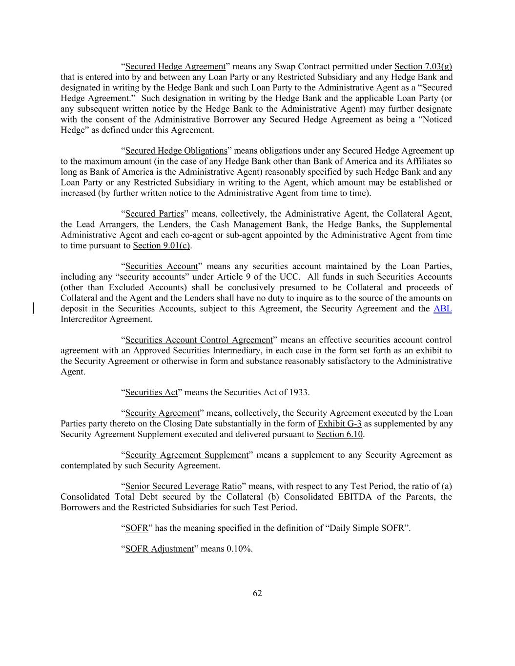 “Secured Hedge Agreement” means any Swap Contract permitted under Section 7.03(g) that is entered into by and between any Loan Party or any Restricted Subsidiary and any Hedge Bank and designated in writing by the Hedge Bank and such Loan Party to the Administrative Agent as a “Secured Hedge Agreement.” Such designation in writing by the Hedge Bank and the applicable Loan Party (or any subsequent written notice by the Hedge Bank to the Administrative Agent) may further designate with the consent of the Administrative Borrower any Secured Hedge Agreement as being a “Noticed Hedge” as defined under this Agreement. “Secured Hedge Obligations” means obligations under any Secured Hedge Agreement up to the maximum amount (in the case of any Hedge Bank other than Bank of America and its Affiliates so long as Bank of America is the Administrative Agent) reasonably specified by such Hedge Bank and any Loan Party or any Restricted Subsidiary in writing to the Agent, which amount may be established or increased (by further written notice to the Administrative Agent from time to time). “Secured Parties” means, collectively, the Administrative Agent, the Collateral Agent, the Lead Arrangers, the Lenders, the Cash Management Bank, the Hedge Banks, the Supplemental Administrative Agent and each co-agent or sub-agent appointed by the Administrative Agent from time to time pursuant to Section 9.01(c). “Securities Account” means any securities account maintained by the Loan Parties, including any “security accounts” under Article 9 of the UCC. All funds in such Securities Accounts (other than Excluded Accounts) shall be conclusively presumed to be Collateral and proceeds of Collateral and the Agent and the Lenders shall have no duty to inquire as to the source of the amounts on deposit in the Securities Accounts, subject to this Agreement, the Security Agreement and the ABL Intercreditor Agreement. “Securities Account Control Agreement” means an effective securities account control agreement with an Approved Securities Intermediary, in each case in the form set forth as an exhibit to the Security Agreement or otherwise in form and substance reasonably satisfactory to the Administrative Agent. “Securities Act” means the Securities Act of 1933. “Security Agreement” means, collectively, the Security Agreement executed by the Loan Parties party thereto on the Closing Date substantially in the form of Exhibit G-3 as supplemented by any Security Agreement Supplement executed and delivered pursuant to Section 6.10. “Security Agreement Supplement” means a supplement to any Security Agreement as contemplated by such Security Agreement. “Senior Secured Leverage Ratio” means, with respect to any Test Period, the ratio of (a) Consolidated Total Debt secured by the Collateral (b) Consolidated EBITDA of the Parents, the Borrowers and the Restricted Subsidiaries for such Test Period. “SOFR” has the meaning specified in the definition of “Daily Simple SOFR”. “SOFR Adjustment” means 0.10%. 62