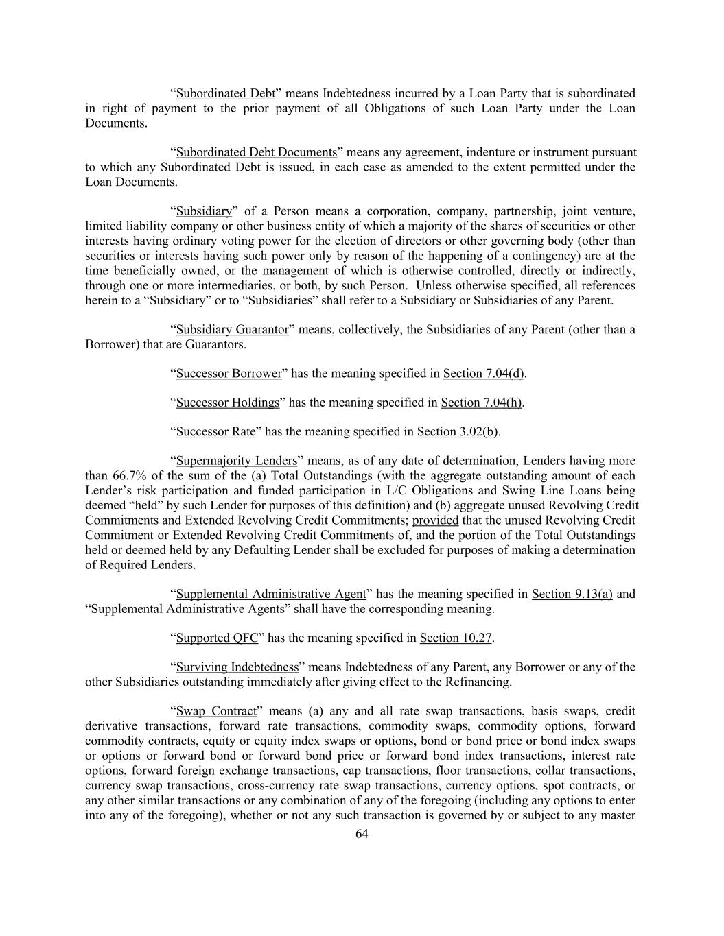“Subordinated Debt” means Indebtedness incurred by a Loan Party that is subordinated in right of payment to the prior payment of all Obligations of such Loan Party under the Loan Documents. “Subordinated Debt Documents” means any agreement, indenture or instrument pursuant to which any Subordinated Debt is issued, in each case as amended to the extent permitted under the Loan Documents. “Subsidiary” of a Person means a corporation, company, partnership, joint venture, limited liability company or other business entity of which a majority of the shares of securities or other interests having ordinary voting power for the election of directors or other governing body (other than securities or interests having such power only by reason of the happening of a contingency) are at the time beneficially owned, or the management of which is otherwise controlled, directly or indirectly, through one or more intermediaries, or both, by such Person. Unless otherwise specified, all references herein to a “Subsidiary” or to “Subsidiaries” shall refer to a Subsidiary or Subsidiaries of any Parent. “Subsidiary Guarantor” means, collectively, the Subsidiaries of any Parent (other than a Borrower) that are Guarantors. “Successor Borrower” has the meaning specified in Section 7.04(d). “Successor Holdings” has the meaning specified in Section 7.04(h). “Successor Rate” has the meaning specified in Section 3.02(b). “Supermajority Lenders” means, as of any date of determination, Lenders having more than 66.7% of the sum of the (a) Total Outstandings (with the aggregate outstanding amount of each Lender’s risk participation and funded participation in L/C Obligations and Swing Line Loans being deemed “held” by such Lender for purposes of this definition) and (b) aggregate unused Revolving Credit Commitments and Extended Revolving Credit Commitments; provided that the unused Revolving Credit Commitment or Extended Revolving Credit Commitments of, and the portion of the Total Outstandings held or deemed held by any Defaulting Lender shall be excluded for purposes of making a determination of Required Lenders. “Supplemental Administrative Agent” has the meaning specified in Section 9.13(a) and “Supplemental Administrative Agents” shall have the corresponding meaning. “Supported QFC” has the meaning specified in Section 10.27. “Surviving Indebtedness” means Indebtedness of any Parent, any Borrower or any of the other Subsidiaries outstanding immediately after giving effect to the Refinancing. “Swap Contract” means (a) any and all rate swap transactions, basis swaps, credit derivative transactions, forward rate transactions, commodity swaps, commodity options, forward commodity contracts, equity or equity index swaps or options, bond or bond price or bond index swaps or options or forward bond or forward bond price or forward bond index transactions, interest rate options, forward foreign exchange transactions, cap transactions, floor transactions, collar transactions, currency swap transactions, cross-currency rate swap transactions, currency options, spot contracts, or any other similar transactions or any combination of any of the foregoing (including any options to enter into any of the foregoing), whether or not any such transaction is governed by or subject to any master 64