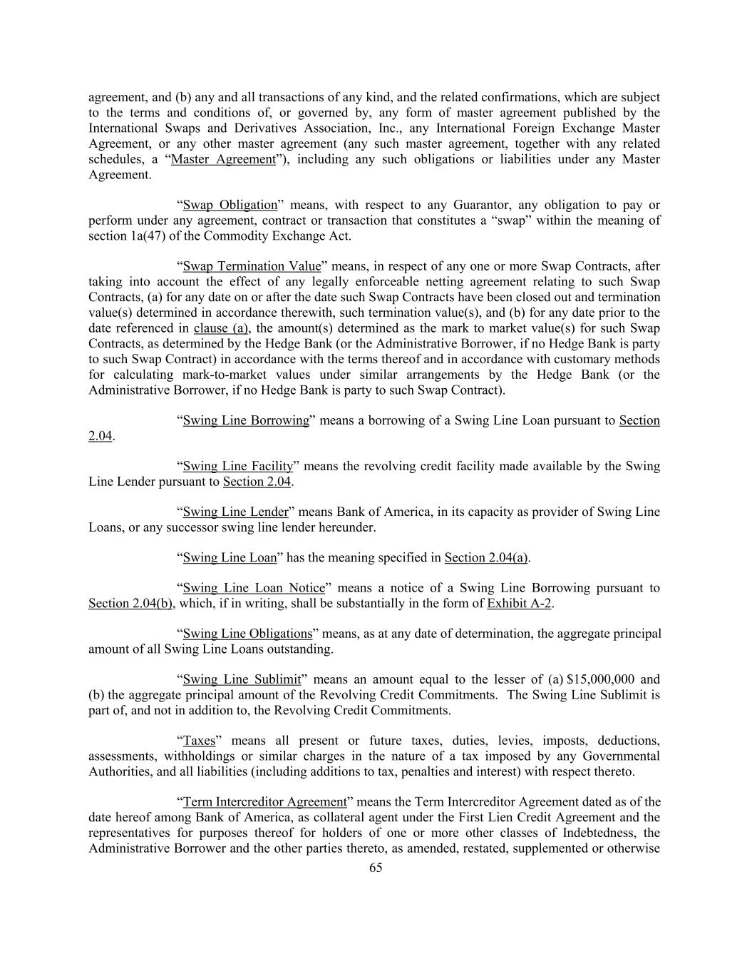 agreement, and (b) any and all transactions of any kind, and the related confirmations, which are subject to the terms and conditions of, or governed by, any form of master agreement published by the International Swaps and Derivatives Association, Inc., any International Foreign Exchange Master Agreement, or any other master agreement (any such master agreement, together with any related schedules, a “Master Agreement”), including any such obligations or liabilities under any Master Agreement. “Swap Obligation” means, with respect to any Guarantor, any obligation to pay or perform under any agreement, contract or transaction that constitutes a “swap” within the meaning of section 1a(47) of the Commodity Exchange Act. “Swap Termination Value” means, in respect of any one or more Swap Contracts, after taking into account the effect of any legally enforceable netting agreement relating to such Swap Contracts, (a) for any date on or after the date such Swap Contracts have been closed out and termination value(s) determined in accordance therewith, such termination value(s), and (b) for any date prior to the date referenced in clause (a), the amount(s) determined as the mark to market value(s) for such Swap Contracts, as determined by the Hedge Bank (or the Administrative Borrower, if no Hedge Bank is party to such Swap Contract) in accordance with the terms thereof and in accordance with customary methods for calculating mark-to-market values under similar arrangements by the Hedge Bank (or the Administrative Borrower, if no Hedge Bank is party to such Swap Contract). “Swing Line Borrowing” means a borrowing of a Swing Line Loan pursuant to Section 2.04. “Swing Line Facility” means the revolving credit facility made available by the Swing Line Lender pursuant to Section 2.04. “Swing Line Lender” means Bank of America, in its capacity as provider of Swing Line Loans, or any successor swing line lender hereunder. “Swing Line Loan” has the meaning specified in Section 2.04(a). “Swing Line Loan Notice” means a notice of a Swing Line Borrowing pursuant to Section 2.04(b), which, if in writing, shall be substantially in the form of Exhibit A-2. “Swing Line Obligations” means, as at any date of determination, the aggregate principal amount of all Swing Line Loans outstanding. “Swing Line Sublimit” means an amount equal to the lesser of (a) $15,000,000 and (b) the aggregate principal amount of the Revolving Credit Commitments. The Swing Line Sublimit is part of, and not in addition to, the Revolving Credit Commitments. “Taxes” means all present or future taxes, duties, levies, imposts, deductions, assessments, withholdings or similar charges in the nature of a tax imposed by any Governmental Authorities, and all liabilities (including additions to tax, penalties and interest) with respect thereto. “Term Intercreditor Agreement” means the Term Intercreditor Agreement dated as of the date hereof among Bank of America, as collateral agent under the First Lien Credit Agreement and the representatives for purposes thereof for holders of one or more other classes of Indebtedness, the Administrative Borrower and the other parties thereto, as amended, restated, supplemented or otherwise 65