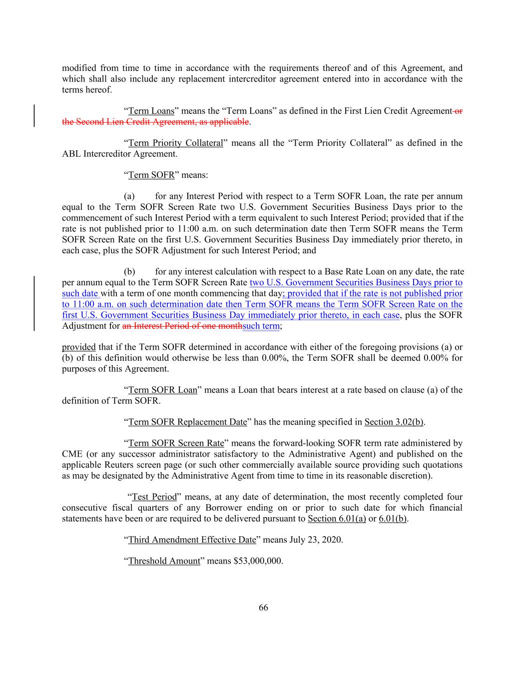 modified from time to time in accordance with the requirements thereof and of this Agreement, and which shall also include any replacement intercreditor agreement entered into in accordance with the terms hereof. “Term Loans” means the “Term Loans” as defined in the First Lien Credit Agreement or the Second Lien Credit Agreement, as applicable. “Term Priority Collateral” means all the “Term Priority Collateral” as defined in the ABL Intercreditor Agreement. “Term SOFR” means: (a) for any Interest Period with respect to a Term SOFR Loan, the rate per annum equal to the Term SOFR Screen Rate two U.S. Government Securities Business Days prior to the commencement of such Interest Period with a term equivalent to such Interest Period; provided that if the rate is not published prior to 11:00 a.m. on such determination date then Term SOFR means the Term SOFR Screen Rate on the first U.S. Government Securities Business Day immediately prior thereto, in each case, plus the SOFR Adjustment for such Interest Period; and (b) for any interest calculation with respect to a Base Rate Loan on any date, the rate per annum equal to the Term SOFR Screen Rate two U.S. Government Securities Business Days prior to such date with a term of one month commencing that day; provided that if the rate is not published prior to 11:00 a.m. on such determination date then Term SOFR means the Term SOFR Screen Rate on the first U.S. Government Securities Business Day immediately prior thereto, in each case, plus the SOFR Adjustment for an Interest Period of one monthsuch term; provided that if the Term SOFR determined in accordance with either of the foregoing provisions (a) or (b) of this definition would otherwise be less than 0.00%, the Term SOFR shall be deemed 0.00% for purposes of this Agreement. “Term SOFR Loan” means a Loan that bears interest at a rate based on clause (a) of the definition of Term SOFR. “Term SOFR Replacement Date” has the meaning specified in Section 3.02(b). “Term SOFR Screen Rate” means the forward-looking SOFR term rate administered by CME (or any successor administrator satisfactory to the Administrative Agent) and published on the applicable Reuters screen page (or such other commercially available source providing such quotations as may be designated by the Administrative Agent from time to time in its reasonable discretion). “Test Period” means, at any date of determination, the most recently completed four consecutive fiscal quarters of any Borrower ending on or prior to such date for which financial statements have been or are required to be delivered pursuant to Section 6.01(a) or 6.01(b). “Third Amendment Effective Date” means July 23, 2020. “Threshold Amount” means $53,000,000. 66
