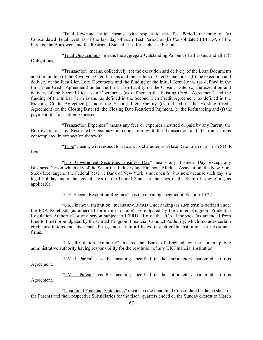 “Total Leverage Ratio” means, with respect to any Test Period, the ratio of (a) Consolidated Total Debt as of the last day of such Test Period to (b) Consolidated EBITDA of the Parents, the Borrowers and the Restricted Subsidiaries for such Test Period. “Total Outstandings” means the aggregate Outstanding Amount of all Loans and all L/C Obligations. “Transaction” means, collectively, (a) the execution and delivery of the Loan Documents and the funding of the Revolving Credit Loans and the Letters of Credit hereunder, (b) the execution and delivery of the First Lien Loan Documents and the funding of the Initial Term Loans (as defined in the First Lien Credit Agreement) under the First Lien Facility on the Closing Date, (c) the execution and delivery of the Second Lien Loan Documents (as defined in the Existing Credit Agreement) and the funding of the Initial Term Loans (as defined in the Second Lien Credit Agreement (as defined in the Existing Credit Agreement)) under the Second Lien Facility (as defined in the Existing Credit Agreement) on the Closing Date, (d) the Closing Date Restricted Payment, (e) the Refinancing and (f) the payment of Transaction Expenses. “Transaction Expenses” means any fees or expenses incurred or paid by any Parent, the Borrowers, or any Restricted Subsidiary in connection with the Transaction and the transactions contemplated in connection therewith. “Type” means, with respect to a Loan, its character as a Base Rate Loan or a Term SOFR Loan. “U.S. Government Securities Business Day” means any Business Day, except any Business Day on which any of the Securities Industry and Financial Markets Association, the New York Stock Exchange or the Federal Reserve Bank of New York is not open for business because such day is a legal holiday under the federal laws of the United States or the laws of the State of New York, as applicable. “U.S. Special Resolution Regimes” has the meaning specified in Section 10.27. “UK Financial Institution” means any BRRD Undertaking (as such term is defined under the PRA Rulebook (as amended form time to time) promulgated by the United Kingdom Prudential Regulation Authority) or any person subject to IFPRU 11.6 of the FCA Handbook (as amended from time to time) promulgated by the United Kingdom Financial Conduct Authority, which includes certain credit institutions and investment firms, and certain affiliates of such credit institutions or investment firms. “UK Resolution Authority” means the Bank of England or any other public administrative authority having responsibility for the resolution of any UK Financial Institution. “UM-R Parent” has the meaning specified in the introductory paragraph to this Agreement. “UM-U Parent” has the meaning specified in the introductory paragraph to this Agreement. “Unaudited Financial Statements” means (i) the unaudited Consolidated balance sheet of the Parents and their respective Subsidiaries for the fiscal quarters ended on the Sunday closest to March 67