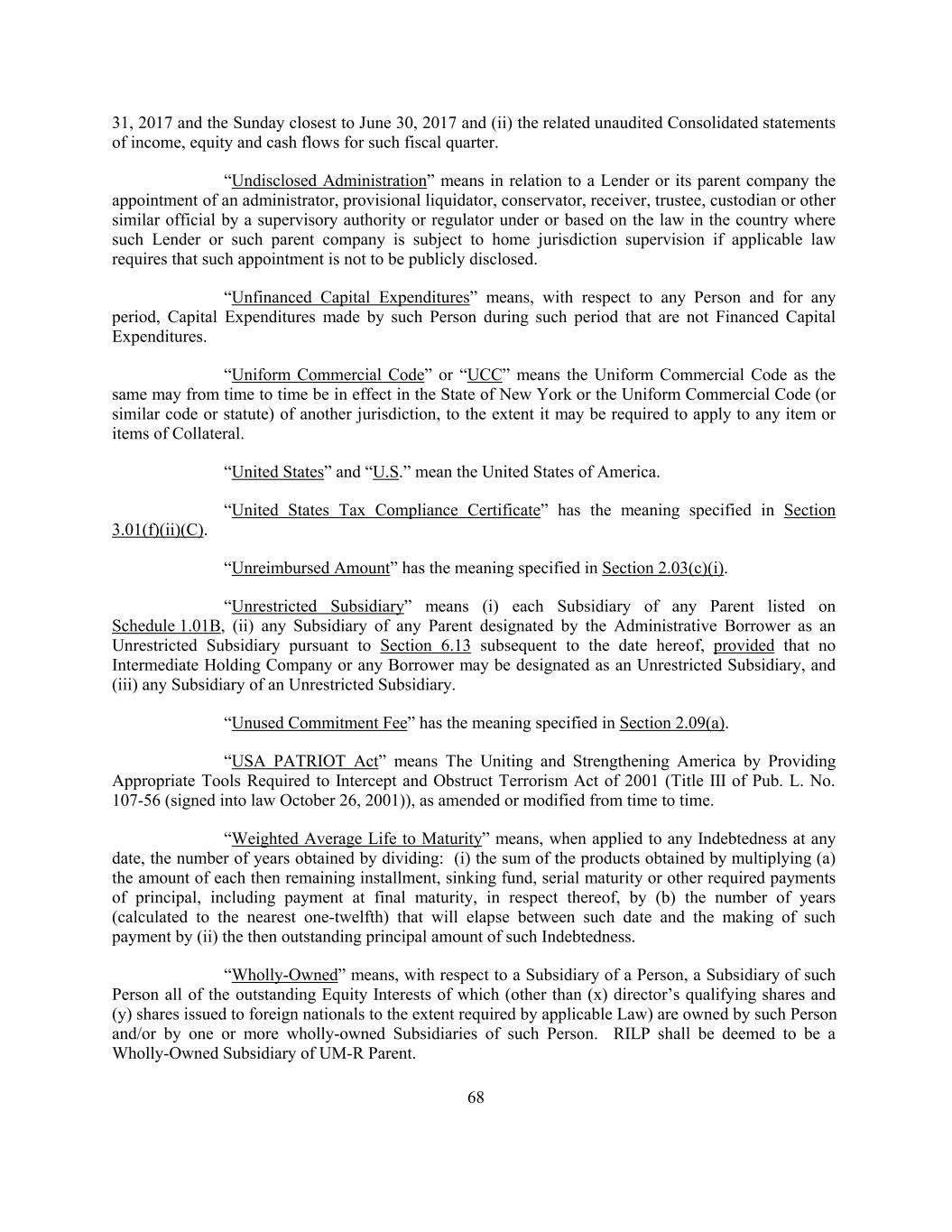 31, 2017 and the Sunday closest to June 30, 2017 and (ii) the related unaudited Consolidated statements of income, equity and cash flows for such fiscal quarter. “Undisclosed Administration” means in relation to a Lender or its parent company the appointment of an administrator, provisional liquidator, conservator, receiver, trustee, custodian or other similar official by a supervisory authority or regulator under or based on the law in the country where such Lender or such parent company is subject to home jurisdiction supervision if applicable law requires that such appointment is not to be publicly disclosed. “Unfinanced Capital Expenditures” means, with respect to any Person and for any period, Capital Expenditures made by such Person during such period that are not Financed Capital Expenditures. “Uniform Commercial Code” or “UCC” means the Uniform Commercial Code as the same may from time to time be in effect in the State of New York or the Uniform Commercial Code (or similar code or statute) of another jurisdiction, to the extent it may be required to apply to any item or items of Collateral. “United States” and “U.S.” mean the United States of America. “United States Tax Compliance Certificate” has the meaning specified in Section 3.01(f)(ii)(C). “Unreimbursed Amount” has the meaning specified in Section 2.03(c)(i). “Unrestricted Subsidiary” means (i) each Subsidiary of any Parent listed on Schedule 1.01B, (ii) any Subsidiary of any Parent designated by the Administrative Borrower as an Unrestricted Subsidiary pursuant to Section 6.13 subsequent to the date hereof, provided that no Intermediate Holding Company or any Borrower may be designated as an Unrestricted Subsidiary, and (iii) any Subsidiary of an Unrestricted Subsidiary. “Unused Commitment Fee” has the meaning specified in Section 2.09(a). “USA PATRIOT Act” means The Uniting and Strengthening America by Providing Appropriate Tools Required to Intercept and Obstruct Terrorism Act of 2001 (Title III of Pub. L. No. 107-56 (signed into law October 26, 2001)), as amended or modified from time to time. “Weighted Average Life to Maturity” means, when applied to any Indebtedness at any date, the number of years obtained by dividing: (i) the sum of the products obtained by multiplying (a) the amount of each then remaining installment, sinking fund, serial maturity or other required payments of principal, including payment at final maturity, in respect thereof, by (b) the number of years (calculated to the nearest one-twelfth) that will elapse between such date and the making of such payment by (ii) the then outstanding principal amount of such Indebtedness. “Wholly-Owned” means, with respect to a Subsidiary of a Person, a Subsidiary of such Person all of the outstanding Equity Interests of which (other than (x) director’s qualifying shares and (y) shares issued to foreign nationals to the extent required by applicable Law) are owned by such Person and/or by one or more wholly-owned Subsidiaries of such Person. RILP shall be deemed to be a Wholly-Owned Subsidiary of UM-R Parent. 68