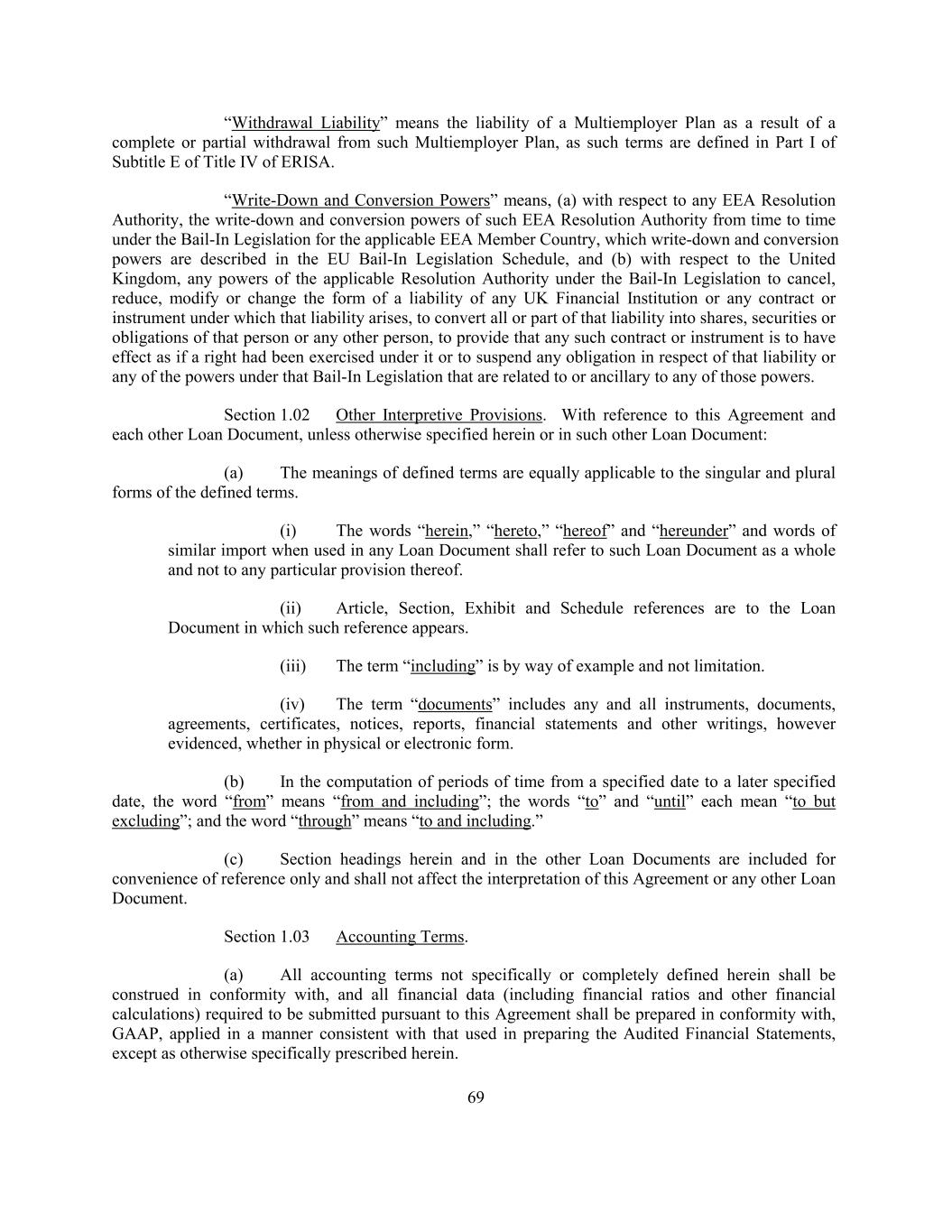 “Withdrawal Liability” means the liability of a Multiemployer Plan as a result of a complete or partial withdrawal from such Multiemployer Plan, as such terms are defined in Part I of Subtitle E of Title IV of ERISA. “Write-Down and Conversion Powers” means, (a) with respect to any EEA Resolution Authority, the write-down and conversion powers of such EEA Resolution Authority from time to time under the Bail-In Legislation for the applicable EEA Member Country, which write-down and conversion powers are described in the EU Bail-In Legislation Schedule, and (b) with respect to the United Kingdom, any powers of the applicable Resolution Authority under the Bail-In Legislation to cancel, reduce, modify or change the form of a liability of any UK Financial Institution or any contract or instrument under which that liability arises, to convert all or part of that liability into shares, securities or obligations of that person or any other person, to provide that any such contract or instrument is to have effect as if a right had been exercised under it or to suspend any obligation in respect of that liability or any of the powers under that Bail-In Legislation that are related to or ancillary to any of those powers. Section 1.02 Other Interpretive Provisions. With reference to this Agreement and each other Loan Document, unless otherwise specified herein or in such other Loan Document: (a) The meanings of defined terms are equally applicable to the singular and plural forms of the defined terms. (i) The words “herein,” “hereto,” “hereof” and “hereunder” and words of similar import when used in any Loan Document shall refer to such Loan Document as a whole and not to any particular provision thereof. (ii) Article, Section, Exhibit and Schedule references are to the Loan Document in which such reference appears. (iii) The term “including” is by way of example and not limitation. (iv) The term “documents” includes any and all instruments, documents, agreements, certificates, notices, reports, financial statements and other writings, however evidenced, whether in physical or electronic form. (b) In the computation of periods of time from a specified date to a later specified date, the word “from” means “from and including”; the words “to” and “until” each mean “to but excluding”; and the word “through” means “to and including.” (c) Section headings herein and in the other Loan Documents are included for convenience of reference only and shall not affect the interpretation of this Agreement or any other Loan Document. Section 1.03 Accounting Terms. (a) All accounting terms not specifically or completely defined herein shall be construed in conformity with, and all financial data (including financial ratios and other financial calculations) required to be submitted pursuant to this Agreement shall be prepared in conformity with, GAAP, applied in a manner consistent with that used in preparing the Audited Financial Statements, except as otherwise specifically prescribed herein. 69