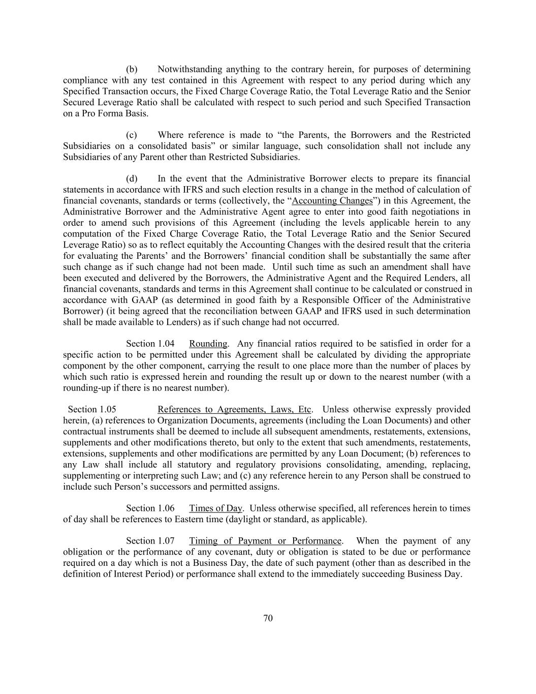 (b) Notwithstanding anything to the contrary herein, for purposes of determining compliance with any test contained in this Agreement with respect to any period during which any Specified Transaction occurs, the Fixed Charge Coverage Ratio, the Total Leverage Ratio and the Senior Secured Leverage Ratio shall be calculated with respect to such period and such Specified Transaction on a Pro Forma Basis. (c) Where reference is made to “the Parents, the Borrowers and the Restricted Subsidiaries on a consolidated basis” or similar language, such consolidation shall not include any Subsidiaries of any Parent other than Restricted Subsidiaries. (d) In the event that the Administrative Borrower elects to prepare its financial statements in accordance with IFRS and such election results in a change in the method of calculation of financial covenants, standards or terms (collectively, the “Accounting Changes”) in this Agreement, the Administrative Borrower and the Administrative Agent agree to enter into good faith negotiations in order to amend such provisions of this Agreement (including the levels applicable herein to any computation of the Fixed Charge Coverage Ratio, the Total Leverage Ratio and the Senior Secured Leverage Ratio) so as to reflect equitably the Accounting Changes with the desired result that the criteria for evaluating the Parents’ and the Borrowers’ financial condition shall be substantially the same after such change as if such change had not been made. Until such time as such an amendment shall have been executed and delivered by the Borrowers, the Administrative Agent and the Required Lenders, all financial covenants, standards and terms in this Agreement shall continue to be calculated or construed in accordance with GAAP (as determined in good faith by a Responsible Officer of the Administrative Borrower) (it being agreed that the reconciliation between GAAP and IFRS used in such determination shall be made available to Lenders) as if such change had not occurred. Section 1.04 Rounding. Any financial ratios required to be satisfied in order for a specific action to be permitted under this Agreement shall be calculated by dividing the appropriate component by the other component, carrying the result to one place more than the number of places by which such ratio is expressed herein and rounding the result up or down to the nearest number (with a rounding-up if there is no nearest number). Section 1.05 References to Agreements, Laws, Etc. Unless otherwise expressly provided herein, (a) references to Organization Documents, agreements (including the Loan Documents) and other contractual instruments shall be deemed to include all subsequent amendments, restatements, extensions, supplements and other modifications thereto, but only to the extent that such amendments, restatements, extensions, supplements and other modifications are permitted by any Loan Document; (b) references to any Law shall include all statutory and regulatory provisions consolidating, amending, replacing, supplementing or interpreting such Law; and (c) any reference herein to any Person shall be construed to include such Person’s successors and permitted assigns. Section 1.06 Times of Day. Unless otherwise specified, all references herein to times of day shall be references to Eastern time (daylight or standard, as applicable). Section 1.07 Timing of Payment or Performance. When the payment of any obligation or the performance of any covenant, duty or obligation is stated to be due or performance required on a day which is not a Business Day, the date of such payment (other than as described in the definition of Interest Period) or performance shall extend to the immediately succeeding Business Day. 70