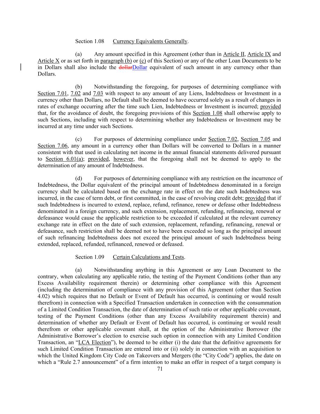 Section 1.08 Currency Equivalents Generally. (a) Any amount specified in this Agreement (other than in Article II, Article IX and Article X or as set forth in paragraph (b) or (c) of this Section) or any of the other Loan Documents to be in Dollars shall also include the dollarDollar equivalent of such amount in any currency other than Dollars. (b) Notwithstanding the foregoing, for purposes of determining compliance with Section 7.01, 7.02 and 7.03 with respect to any amount of any Liens, Indebtedness or Investment in a currency other than Dollars, no Default shall be deemed to have occurred solely as a result of changes in rates of exchange occurring after the time such Lien, Indebtedness or Investment is incurred; provided that, for the avoidance of doubt, the foregoing provisions of this Section 1.08 shall otherwise apply to such Sections, including with respect to determining whether any Indebtedness or Investment may be incurred at any time under such Sections. (c) For purposes of determining compliance under Section 7.02, Section 7.05 and Section 7.06, any amount in a currency other than Dollars will be converted to Dollars in a manner consistent with that used in calculating net income in the annual financial statements delivered pursuant to Section 6.01(a); provided, however, that the foregoing shall not be deemed to apply to the determination of any amount of Indebtedness. (d) For purposes of determining compliance with any restriction on the incurrence of Indebtedness, the Dollar equivalent of the principal amount of Indebtedness denominated in a foreign currency shall be calculated based on the exchange rate in effect on the date such Indebtedness was incurred, in the case of term debt, or first committed, in the case of revolving credit debt; provided that if such Indebtedness is incurred to extend, replace, refund, refinance, renew or defease other Indebtedness denominated in a foreign currency, and such extension, replacement, refunding, refinancing, renewal or defeasance would cause the applicable restriction to be exceeded if calculated at the relevant currency exchange rate in effect on the date of such extension, replacement, refunding, refinancing, renewal or defeasance, such restriction shall be deemed not to have been exceeded so long as the principal amount of such refinancing Indebtedness does not exceed the principal amount of such Indebtedness being extended, replaced, refunded, refinanced, renewed or defeased. Section 1.09 Certain Calculations and Tests. (a) Notwithstanding anything in this Agreement or any Loan Document to the contrary, when calculating any applicable ratio, the testing of the Payment Conditions (other than any Excess Availability requirement therein) or determining other compliance with this Agreement (including the determination of compliance with any provision of this Agreement (other than Section 4.02) which requires that no Default or Event of Default has occurred, is continuing or would result therefrom) in connection with a Specified Transaction undertaken in connection with the consummation of a Limited Condition Transaction, the date of determination of such ratio or other applicable covenant, testing of the Payment Conditions (other than any Excess Availability requirement therein) and determination of whether any Default or Event of Default has occurred, is continuing or would result therefrom or other applicable covenant shall, at the option of the Administrative Borrower (the Administrative Borrower’s election to exercise such option in connection with any Limited Condition Transaction, an “LCA Election”), be deemed to be either (i) the date that the definitive agreements for such Limited Condition Transaction are entered into or (ii) solely in connection with an acquisition to which the United Kingdom City Code on Takeovers and Mergers (the “City Code”) applies, the date on which a “Rule 2.7 announcement” of a firm intention to make an offer in respect of a target company is 71