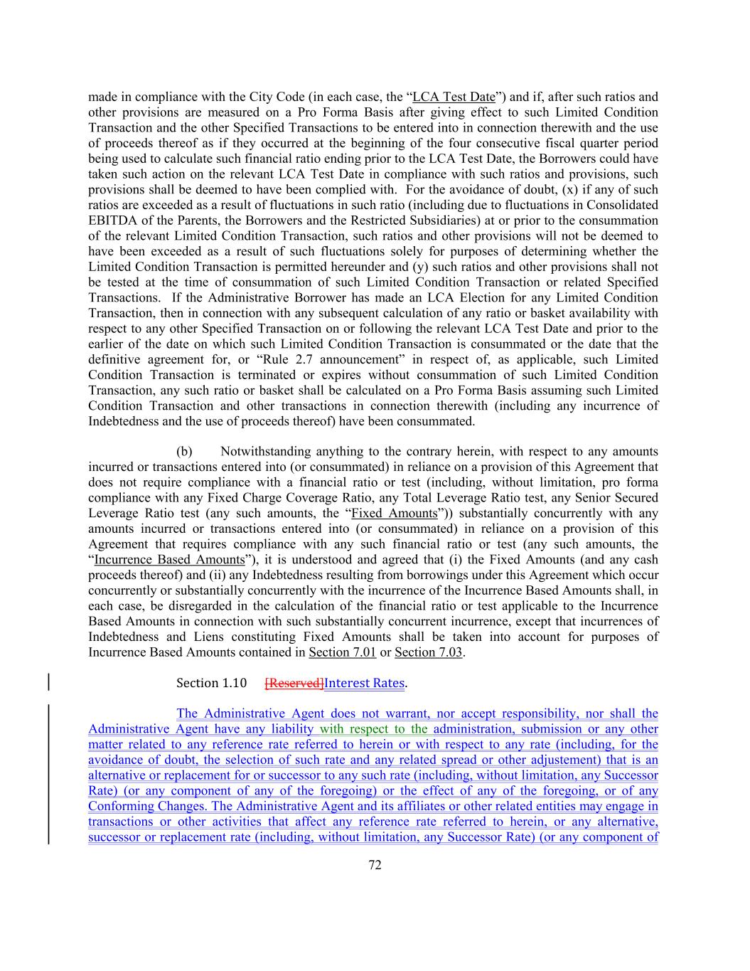 made in compliance with the City Code (in each case, the “LCA Test Date”) and if, after such ratios and other provisions are measured on a Pro Forma Basis after giving effect to such Limited Condition Transaction and the other Specified Transactions to be entered into in connection therewith and the use of proceeds thereof as if they occurred at the beginning of the four consecutive fiscal quarter period being used to calculate such financial ratio ending prior to the LCA Test Date, the Borrowers could have taken such action on the relevant LCA Test Date in compliance with such ratios and provisions, such provisions shall be deemed to have been complied with. For the avoidance of doubt, (x) if any of such ratios are exceeded as a result of fluctuations in such ratio (including due to fluctuations in Consolidated EBITDA of the Parents, the Borrowers and the Restricted Subsidiaries) at or prior to the consummation of the relevant Limited Condition Transaction, such ratios and other provisions will not be deemed to have been exceeded as a result of such fluctuations solely for purposes of determining whether the Limited Condition Transaction is permitted hereunder and (y) such ratios and other provisions shall not be tested at the time of consummation of such Limited Condition Transaction or related Specified Transactions. If the Administrative Borrower has made an LCA Election for any Limited Condition Transaction, then in connection with any subsequent calculation of any ratio or basket availability with respect to any other Specified Transaction on or following the relevant LCA Test Date and prior to the earlier of the date on which such Limited Condition Transaction is consummated or the date that the definitive agreement for, or “Rule 2.7 announcement” in respect of, as applicable, such Limited Condition Transaction is terminated or expires without consummation of such Limited Condition Transaction, any such ratio or basket shall be calculated on a Pro Forma Basis assuming such Limited Condition Transaction and other transactions in connection therewith (including any incurrence of Indebtedness and the use of proceeds thereof) have been consummated. (b) Notwithstanding anything to the contrary herein, with respect to any amounts incurred or transactions entered into (or consummated) in reliance on a provision of this Agreement that does not require compliance with a financial ratio or test (including, without limitation, pro forma compliance with any Fixed Charge Coverage Ratio, any Total Leverage Ratio test, any Senior Secured Leverage Ratio test (any such amounts, the “Fixed Amounts”)) substantially concurrently with any amounts incurred or transactions entered into (or consummated) in reliance on a provision of this Agreement that requires compliance with any such financial ratio or test (any such amounts, the “Incurrence Based Amounts”), it is understood and agreed that (i) the Fixed Amounts (and any cash proceeds thereof) and (ii) any Indebtedness resulting from borrowings under this Agreement which occur concurrently or substantially concurrently with the incurrence of the Incurrence Based Amounts shall, in each case, be disregarded in the calculation of the financial ratio or test applicable to the Incurrence Based Amounts in connection with such substantially concurrent incurrence, except that incurrences of Indebtedness and Liens constituting Fixed Amounts shall be taken into account for purposes of Incurrence Based Amounts contained in Section 7.01 or Section 7.03. Section 1.10 [Reserved]Interest Rates. The Administrative Agent does not warrant, nor accept responsibility, nor shall the Administrative Agent have any liability with respect to the administration, submission or any other matter related to any reference rate referred to herein or with respect to any rate (including, for the avoidance of doubt, the selection of such rate and any related spread or other adjustement) that is an alternative or replacement for or successor to any such rate (including, without limitation, any Successor Rate) (or any component of any of the foregoing) or the effect of any of the foregoing, or of any Conforming Changes. The Administrative Agent and its affiliates or other related entities may engage in transactions or other activities that affect any reference rate referred to herein, or any alternative, successor or replacement rate (including, without limitation, any Successor Rate) (or any component of 72