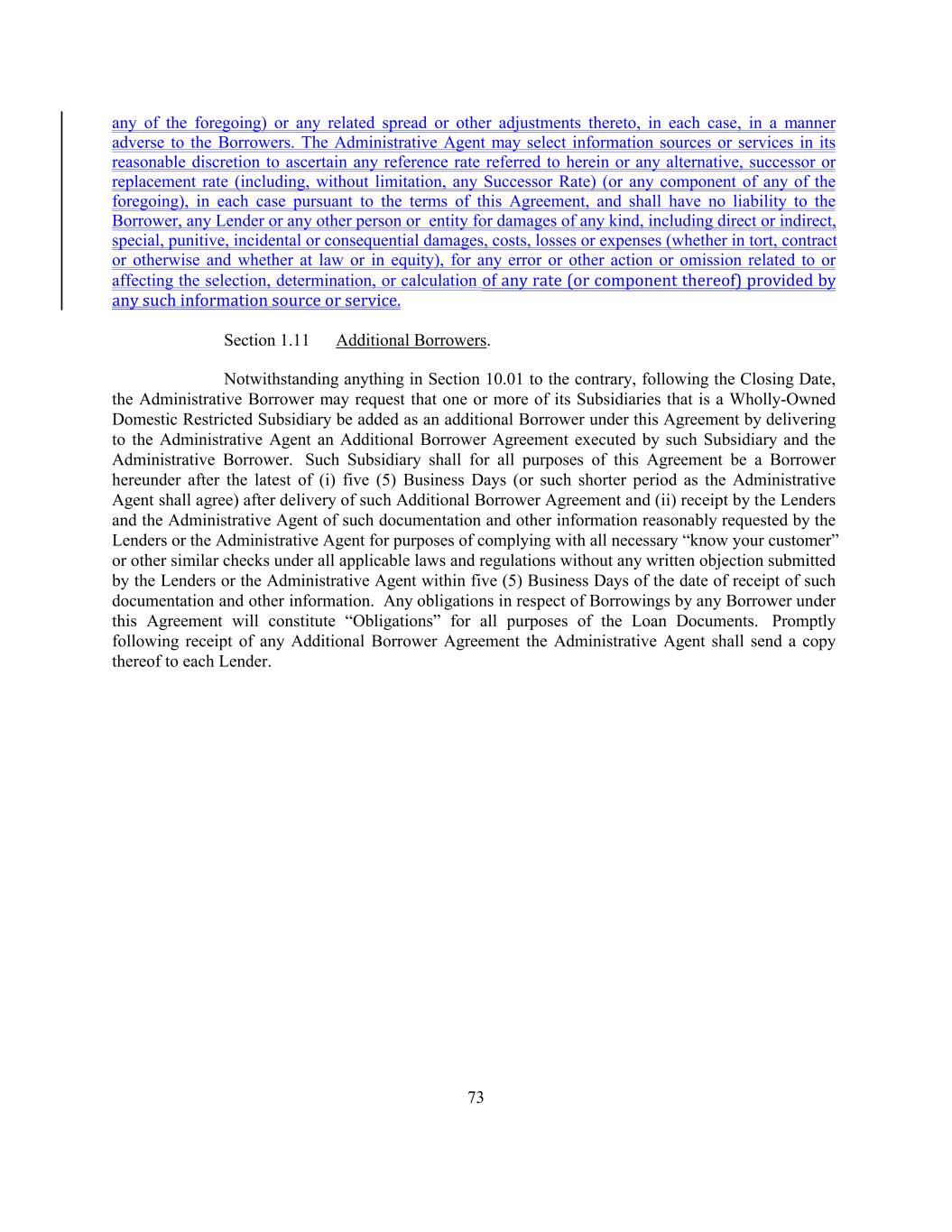 any of the foregoing) or any related spread or other adjustments thereto, in each case, in a manner adverse to the Borrowers. The Administrative Agent may select information sources or services in its reasonable discretion to ascertain any reference rate referred to herein or any alternative, successor or replacement rate (including, without limitation, any Successor Rate) (or any component of any of the foregoing), in each case pursuant to the terms of this Agreement, and shall have no liability to the Borrower, any Lender or any other person or entity for damages of any kind, including direct or indirect, special, punitive, incidental or consequential damages, costs, losses or expenses (whether in tort, contract or otherwise and whether at law or in equity), for any error or other action or omission related to or affecting the selection, determination, or calculation of any rate (or component thereof) provided by any such information source or service. Section 1.11 Additional Borrowers. Notwithstanding anything in Section 10.01 to the contrary, following the Closing Date, the Administrative Borrower may request that one or more of its Subsidiaries that is a Wholly-Owned Domestic Restricted Subsidiary be added as an additional Borrower under this Agreement by delivering to the Administrative Agent an Additional Borrower Agreement executed by such Subsidiary and the Administrative Borrower. Such Subsidiary shall for all purposes of this Agreement be a Borrower hereunder after the latest of (i) five (5) Business Days (or such shorter period as the Administrative Agent shall agree) after delivery of such Additional Borrower Agreement and (ii) receipt by the Lenders and the Administrative Agent of such documentation and other information reasonably requested by the Lenders or the Administrative Agent for purposes of complying with all necessary “know your customer” or other similar checks under all applicable laws and regulations without any written objection submitted by the Lenders or the Administrative Agent within five (5) Business Days of the date of receipt of such documentation and other information. Any obligations in respect of Borrowings by any Borrower under this Agreement will constitute “Obligations” for all purposes of the Loan Documents. Promptly following receipt of any Additional Borrower Agreement the Administrative Agent shall send a copy thereof to each Lender. 73