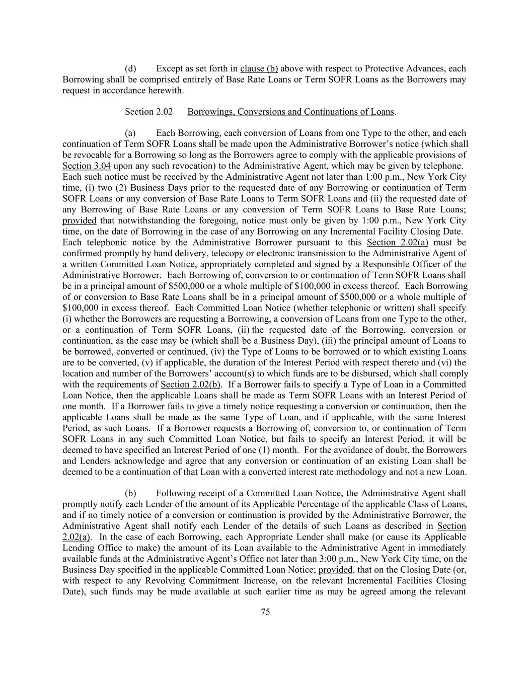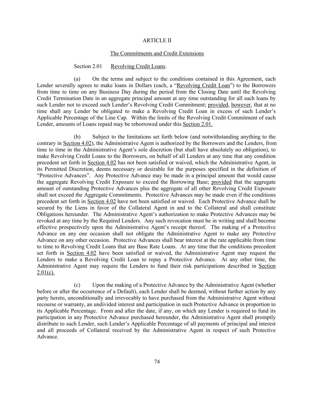 ARTICLE II The Commitments and Credit Extensions Section 2.01 Revolving Credit Loans. (a) On the terms and subject to the conditions contained in this Agreement, each Lender severally agrees to make loans in Dollars (each, a “Revolving Credit Loan”) to the Borrowers from time to time on any Business Day during the period from the Closing Date until the Revolving Credit Termination Date in an aggregate principal amount at any time outstanding for all such loans by such Lender not to exceed such Lender’s Revolving Credit Commitment; provided, however, that at no time shall any Lender be obligated to make a Revolving Credit Loan in excess of such Lender’s Applicable Percentage of the Line Cap. Within the limits of the Revolving Credit Commitment of each Lender, amounts of Loans repaid may be reborrowed under this Section 2.01. (b) Subject to the limitations set forth below (and notwithstanding anything to the contrary in Section 4.02), the Administrative Agent is authorized by the Borrowers and the Lenders, from time to time in the Administrative Agent’s sole discretion (but shall have absolutely no obligation), to make Revolving Credit Loans to the Borrowers, on behalf of all Lenders at any time that any condition precedent set forth in Section 4.02 has not been satisfied or waived, which the Administrative Agent, in its Permitted Discretion, deems necessary or desirable for the purposes specified in the definition of “Protective Advances”. Any Protective Advance may be made in a principal amount that would cause the aggregate Revolving Credit Exposure to exceed the Borrowing Base; provided that the aggregate amount of outstanding Protective Advances plus the aggregate of all other Revolving Credit Exposure shall not exceed the Aggregate Commitments. Protective Advances may be made even if the conditions precedent set forth in Section 4.02 have not been satisfied or waived. Each Protective Advance shall be secured by the Liens in favor of the Collateral Agent in and to the Collateral and shall constitute Obligations hereunder. The Administrative Agent’s authorization to make Protective Advances may be revoked at any time by the Required Lenders. Any such revocation must be in writing and shall become effective prospectively upon the Administrative Agent’s receipt thereof. The making of a Protective Advance on any one occasion shall not obligate the Administrative Agent to make any Protective Advance on any other occasion. Protective Advances shall bear interest at the rate applicable from time to time to Revolving Credit Loans that are Base Rate Loans. At any time that the conditions precedent set forth in Section 4.02 have been satisfied or waived, the Administrative Agent may request the Lenders to make a Revolving Credit Loan to repay a Protective Advance. At any other time, the Administrative Agent may require the Lenders to fund their risk participations described in Section 2.01(c). (c) Upon the making of a Protective Advance by the Administrative Agent (whether before or after the occurrence of a Default), each Lender shall be deemed, without further action by any party hereto, unconditionally and irrevocably to have purchased from the Administrative Agent without recourse or warranty, an undivided interest and participation in such Protective Advance in proportion to its Applicable Percentage. From and after the date, if any, on which any Lender is required to fund its participation in any Protective Advance purchased hereunder, the Administrative Agent shall promptly distribute to such Lender, such Lender’s Applicable Percentage of all payments of principal and interest and all proceeds of Collateral received by the Administrative Agent in respect of such Protective Advance. 74