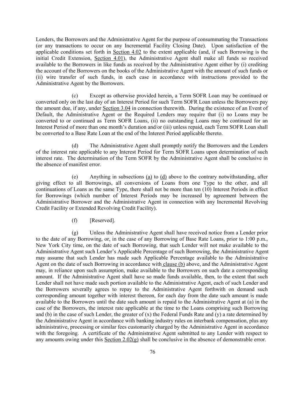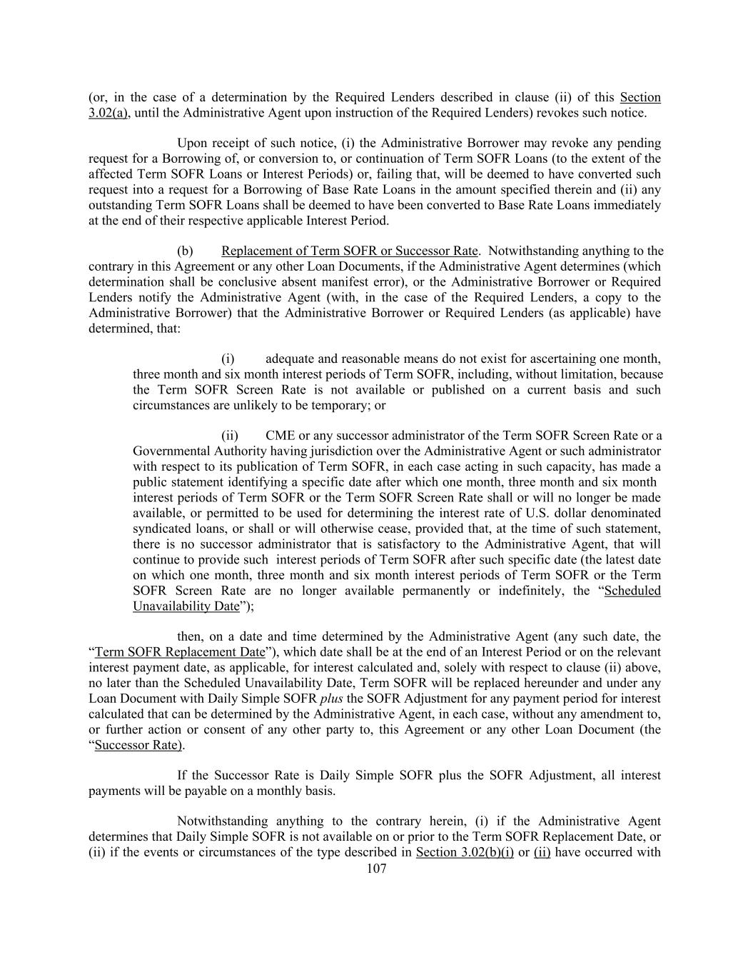 (or, in the case of a determination by the Required Lenders described in clause (ii) of this Section 3.02(a), until the Administrative Agent upon instruction of the Required Lenders) revokes such notice. Upon receipt of such notice, (i) the Administrative Borrower may revoke any pending request for a Borrowing of, or conversion to, or continuation of Term SOFR Loans (to the extent of the affected Term SOFR Loans or Interest Periods) or, failing that, will be deemed to have converted such request into a request for a Borrowing of Base Rate Loans in the amount specified therein and (ii) any outstanding Term SOFR Loans shall be deemed to have been converted to Base Rate Loans immediately at the end of their respective applicable Interest Period. (b) Replacement of Term SOFR or Successor Rate. Notwithstanding anything to the contrary in this Agreement or any other Loan Documents, if the Administrative Agent determines (which determination shall be conclusive absent manifest error), or the Administrative Borrower or Required Lenders notify the Administrative Agent (with, in the case of the Required Lenders, a copy to the Administrative Borrower) that the Administrative Borrower or Required Lenders (as applicable) have determined, that: (i) adequate and reasonable means do not exist for ascertaining one month, three month and six month interest periods of Term SOFR, including, without limitation, because the Term SOFR Screen Rate is not available or published on a current basis and such circumstances are unlikely to be temporary; or (ii) CME or any successor administrator of the Term SOFR Screen Rate or a Governmental Authority having jurisdiction over the Administrative Agent or such administrator with respect to its publication of Term SOFR, in each case acting in such capacity, has made a public statement identifying a specific date after which one month, three month and six month interest periods of Term SOFR or the Term SOFR Screen Rate shall or will no longer be made available, or permitted to be used for determining the interest rate of U.S. dollar denominated syndicated loans, or shall or will otherwise cease, provided that, at the time of such statement, there is no successor administrator that is satisfactory to the Administrative Agent, that will continue to provide such interest periods of Term SOFR after such specific date (the latest date on which one month, three month and six month interest periods of Term SOFR or the Term SOFR Screen Rate are no longer available permanently or indefinitely, the “Scheduled Unavailability Date”); then, on a date and time determined by the Administrative Agent (any such date, the “Term SOFR Replacement Date”), which date shall be at the end of an Interest Period or on the relevant interest payment date, as applicable, for interest calculated and, solely with respect to clause (ii) above, no later than the Scheduled Unavailability Date, Term SOFR will be replaced hereunder and under any Loan Document with Daily Simple SOFR plus the SOFR Adjustment for any payment period for interest calculated that can be determined by the Administrative Agent, in each case, without any amendment to, or further action or consent of any other party to, this Agreement or any other Loan Document (the “Successor Rate). If the Successor Rate is Daily Simple SOFR plus the SOFR Adjustment, all interest payments will be payable on a monthly basis. Notwithstanding anything to the contrary herein, (i) if the Administrative Agent determines that Daily Simple SOFR is not available on or prior to the Term SOFR Replacement Date, or (ii) if the events or circumstances of the type described in Section 3.02(b)(i) or (ii) have occurred with 107