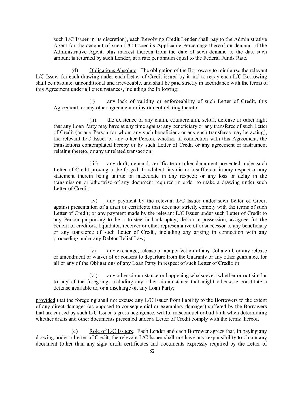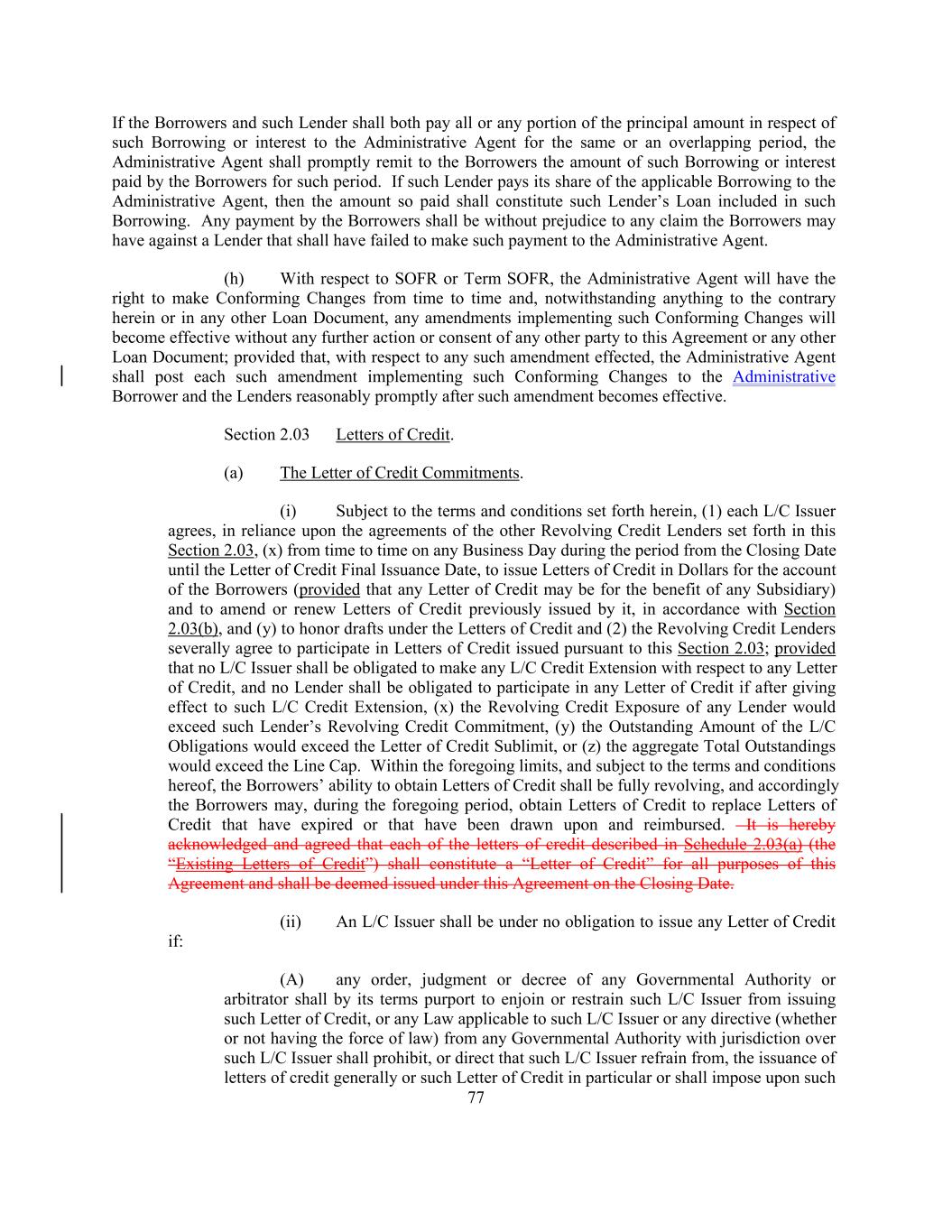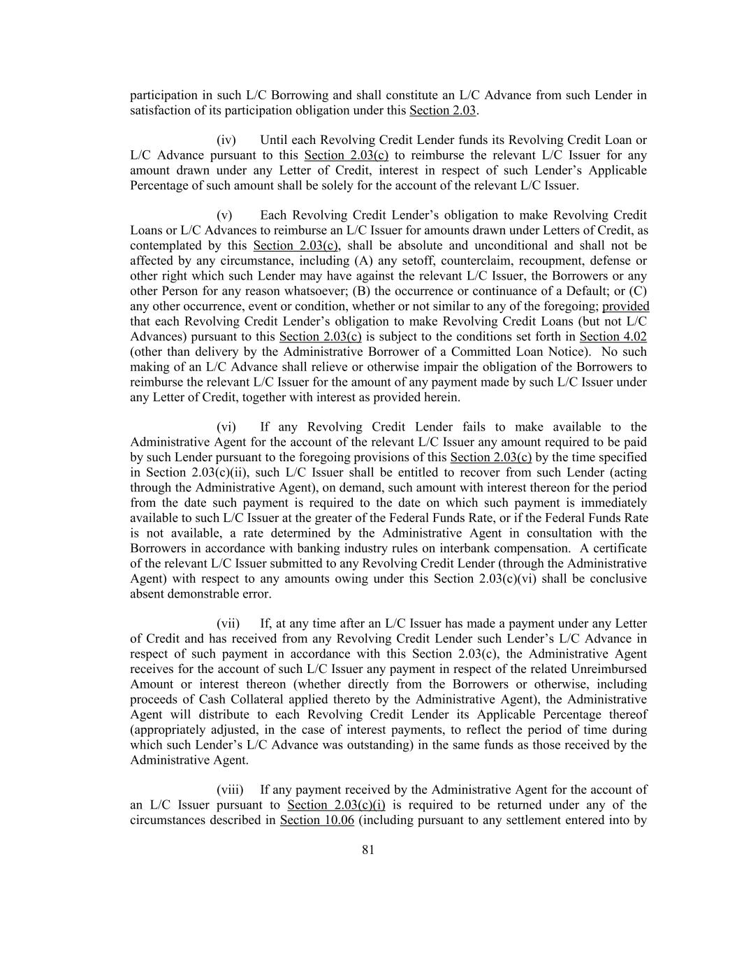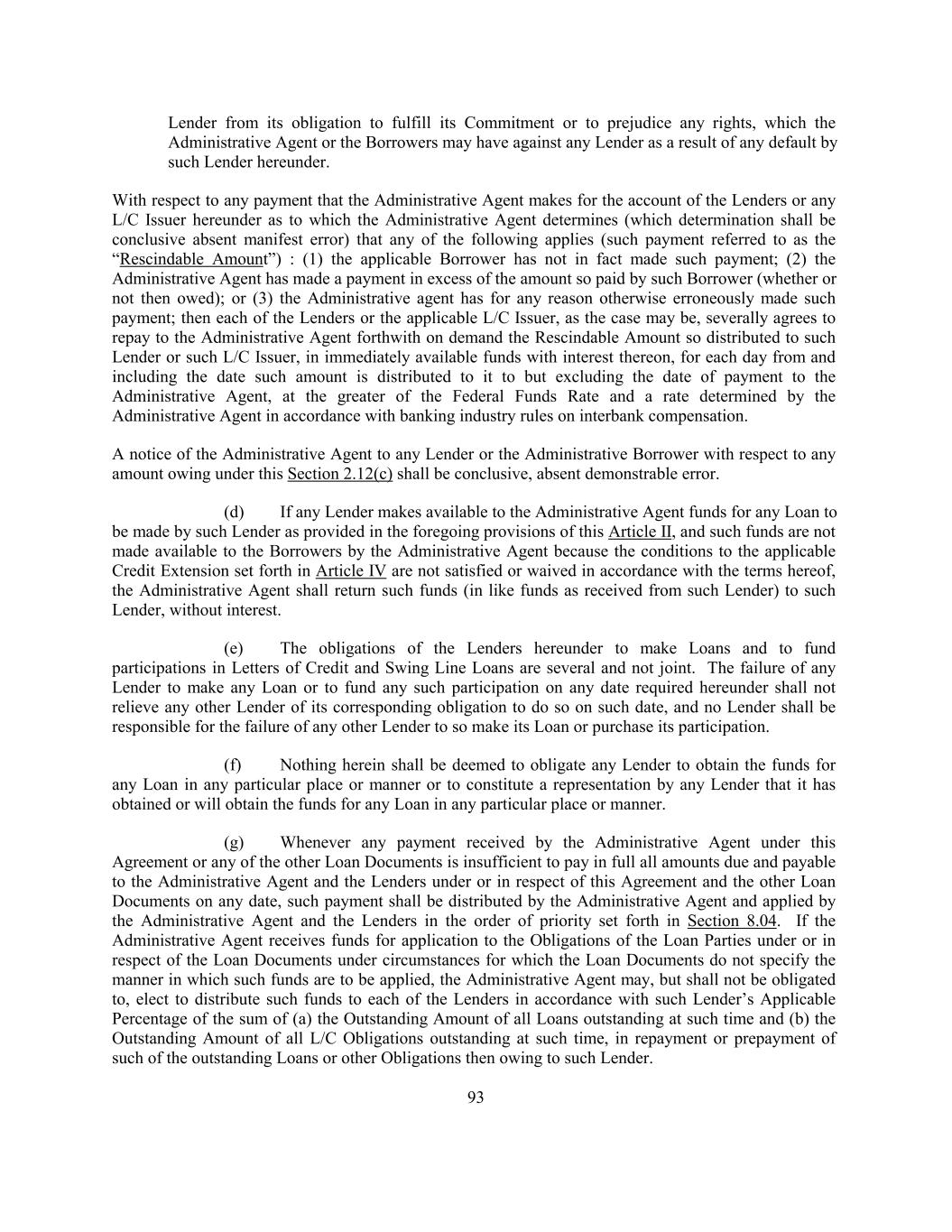 Lender from its obligation to fulfill its Commitment or to prejudice any rights, which the Administrative Agent or the Borrowers may have against any Lender as a result of any default by such Lender hereunder. With respect to any payment that the Administrative Agent makes for the account of the Lenders or any L/C Issuer hereunder as to which the Administrative Agent determines (which determination shall be conclusive absent manifest error) that any of the following applies (such payment referred to as the “Rescindable Amount”) : (1) the applicable Borrower has not in fact made such payment; (2) the Administrative Agent has made a payment in excess of the amount so paid by such Borrower (whether or not then owed); or (3) the Administrative agent has for any reason otherwise erroneously made such payment; then each of the Lenders or the applicable L/C Issuer, as the case may be, severally agrees to repay to the Administrative Agent forthwith on demand the Rescindable Amount so distributed to such Lender or such L/C Issuer, in immediately available funds with interest thereon, for each day from and including the date such amount is distributed to it to but excluding the date of payment to the Administrative Agent, at the greater of the Federal Funds Rate and a rate determined by the Administrative Agent in accordance with banking industry rules on interbank compensation. A notice of the Administrative Agent to any Lender or the Administrative Borrower with respect to any amount owing under this Section 2.12(c) shall be conclusive, absent demonstrable error. (d) If any Lender makes available to the Administrative Agent funds for any Loan to be made by such Lender as provided in the foregoing provisions of this Article II, and such funds are not made available to the Borrowers by the Administrative Agent because the conditions to the applicable Credit Extension set forth in Article IV are not satisfied or waived in accordance with the terms hereof, the Administrative Agent shall return such funds (in like funds as received from such Lender) to such Lender, without interest. (e) The obligations of the Lenders hereunder to make Loans and to fund participations in Letters of Credit and Swing Line Loans are several and not joint. The failure of any Lender to make any Loan or to fund any such participation on any date required hereunder shall not relieve any other Lender of its corresponding obligation to do so on such date, and no Lender shall be responsible for the failure of any other Lender to so make its Loan or purchase its participation. (f) Nothing herein shall be deemed to obligate any Lender to obtain the funds for any Loan in any particular place or manner or to constitute a representation by any Lender that it has obtained or will obtain the funds for any Loan in any particular place or manner. (g) Whenever any payment received by the Administrative Agent under this Agreement or any of the other Loan Documents is insufficient to pay in full all amounts due and payable to the Administrative Agent and the Lenders under or in respect of this Agreement and the other Loan Documents on any date, such payment shall be distributed by the Administrative Agent and applied by the Administrative Agent and the Lenders in the order of priority set forth in Section 8.04. If the Administrative Agent receives funds for application to the Obligations of the Loan Parties under or in respect of the Loan Documents under circumstances for which the Loan Documents do not specify the manner in which such funds are to be applied, the Administrative Agent may, but shall not be obligated to, elect to distribute such funds to each of the Lenders in accordance with such Lender’s Applicable Percentage of the sum of (a) the Outstanding Amount of all Loans outstanding at such time and (b) the Outstanding Amount of all L/C Obligations outstanding at such time, in repayment or prepayment of such of the outstanding Loans or other Obligations then owing to such Lender. 93