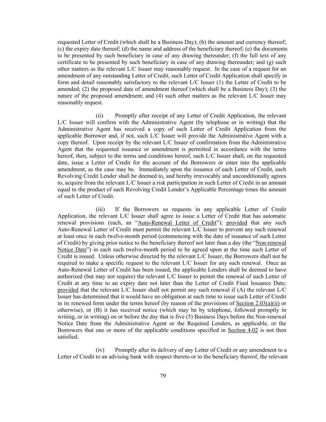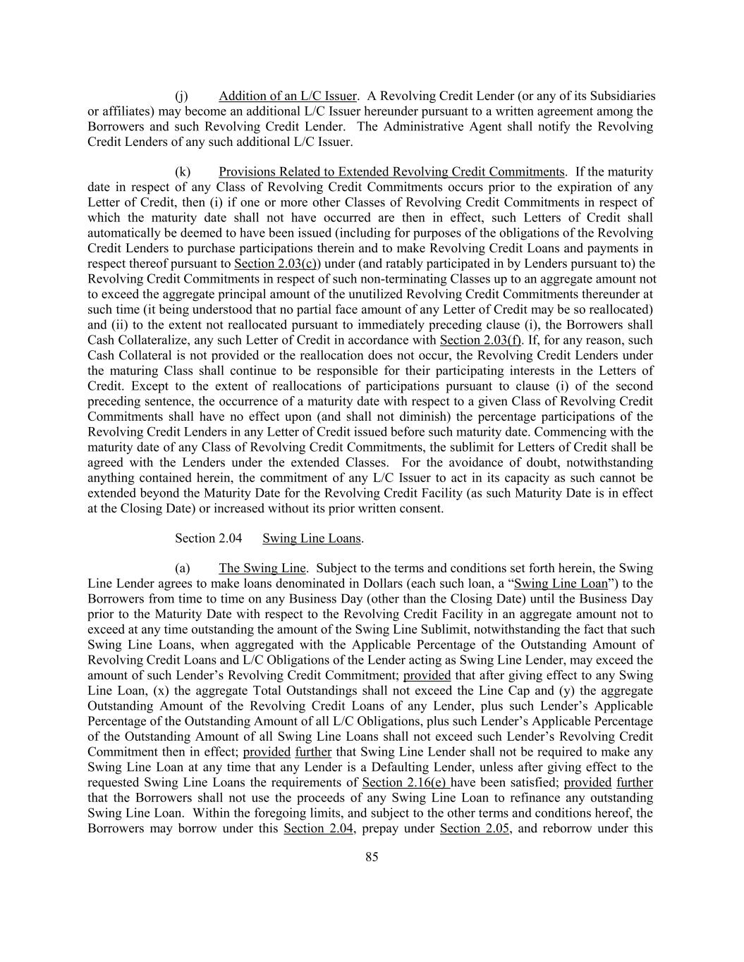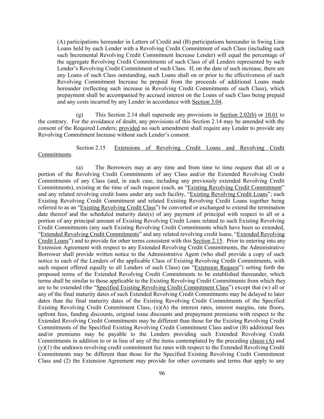 (A) participations hereunder in Letters of Credit and (B) participations hereunder in Swing Line Loans held by each Lender with a Revolving Credit Commitment of such Class (including each such Incremental Revolving Credit Commitment Increase Lender) will equal the percentage of the aggregate Revolving Credit Commitments of such Class of all Lenders represented by such Lender’s Revolving Credit Commitment of such Class. If, on the date of such increase, there are any Loans of such Class outstanding, such Loans shall on or prior to the effectiveness of such Revolving Commitment Increase be prepaid from the proceeds of additional Loans made hereunder (reflecting such increase in Revolving Credit Commitments of such Class), which prepayment shall be accompanied by accrued interest on the Loans of such Class being prepaid and any costs incurred by any Lender in accordance with Section 3.04. (g) This Section 2.14 shall supersede any provisions in Section 2.02(b) or 10.01 to the contrary. For the avoidance of doubt, any provisions of this Section 2.14 may be amended with the consent of the Required Lenders; provided no such amendment shall require any Lender to provide any Revolving Commitment Increase without such Lender’s consent. Section 2.15 Extensions of Revolving Credit Loans and Revolving Credit Commitments. (a) The Borrowers may at any time and from time to time request that all or a portion of the Revolving Credit Commitments of any Class and/or the Extended Revolving Credit Commitments of any Class (and, in each case, including any previously extended Revolving Credit Commitments), existing at the time of such request (each, an “Existing Revolving Credit Commitment” and any related revolving credit loans under any such facility, “Existing Revolving Credit Loans”; each Existing Revolving Credit Commitment and related Existing Revolving Credit Loans together being referred to as an “Existing Revolving Credit Class”) be converted or exchanged to extend the termination date thereof and the scheduled maturity date(s) of any payment of principal with respect to all or a portion of any principal amount of Existing Revolving Credit Loans related to such Existing Revolving Credit Commitments (any such Existing Revolving Credit Commitments which have been so extended, “Extended Revolving Credit Commitments” and any related revolving credit loans, “Extended Revolving Credit Loans”) and to provide for other terms consistent with this Section 2.15. Prior to entering into any Extension Agreement with respect to any Extended Revolving Credit Commitments, the Administrative Borrower shall provide written notice to the Administrative Agent (who shall provide a copy of such notice to each of the Lenders of the applicable Class of Existing Revolving Credit Commitments, with such request offered equally to all Lenders of such Class) (an “Extension Request”) setting forth the proposed terms of the Extended Revolving Credit Commitments to be established thereunder, which terms shall be similar to those applicable to the Existing Revolving Credit Commitments from which they are to be extended (the “Specified Existing Revolving Credit Commitment Class”) except that (w) all or any of the final maturity dates of such Extended Revolving Credit Commitments may be delayed to later dates than the final maturity dates of the Existing Revolving Credit Commitments of the Specified Existing Revolving Credit Commitment Class, (x)(A) the interest rates, interest margins, rate floors, upfront fees, funding discounts, original issue discounts and prepayment premiums with respect to the Extended Revolving Credit Commitments may be different than those for the Existing Revolving Credit Commitments of the Specified Existing Revolving Credit Commitment Class and/or (B) additional fees and/or premiums may be payable to the Lenders providing such Extended Revolving Credit Commitments in addition to or in lieu of any of the items contemplated by the preceding clause (A) and (y)(1) the undrawn revolving credit commitment fee rates with respect to the Extended Revolving Credit Commitments may be different than those for the Specified Existing Revolving Credit Commitment Class and (2) the Extension Agreement may provide for other covenants and terms that apply to any 96