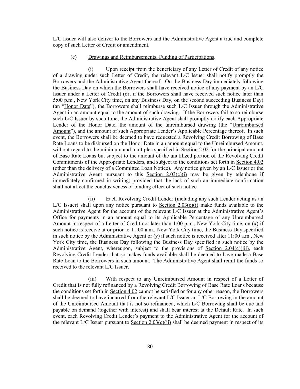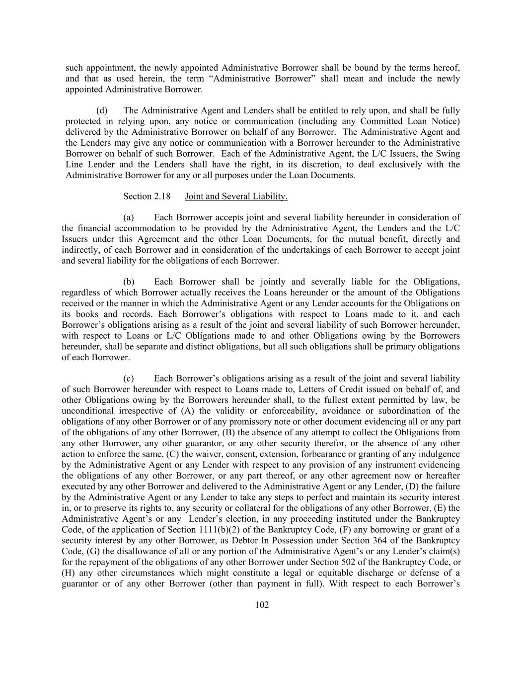such appointment, the newly appointed Administrative Borrower shall be bound by the terms hereof, and that as used herein, the term “Administrative Borrower” shall mean and include the newly appointed Administrative Borrower. (d) The Administrative Agent and Lenders shall be entitled to rely upon, and shall be fully protected in relying upon, any notice or communication (including any Committed Loan Notice) delivered by the Administrative Borrower on behalf of any Borrower. The Administrative Agent and the Lenders may give any notice or communication with a Borrower hereunder to the Administrative Borrower on behalf of such Borrower. Each of the Administrative Agent, the L/C Issuers, the Swing Line Lender and the Lenders shall have the right, in its discretion, to deal exclusively with the Administrative Borrower for any or all purposes under the Loan Documents. Section 2.18 Joint and Several Liability. (a) Each Borrower accepts joint and several liability hereunder in consideration of the financial accommodation to be provided by the Administrative Agent, the Lenders and the L/C Issuers under this Agreement and the other Loan Documents, for the mutual benefit, directly and indirectly, of each Borrower and in consideration of the undertakings of each Borrower to accept joint and several liability for the obligations of each Borrower. (b) Each Borrower shall be jointly and severally liable for the Obligations, regardless of which Borrower actually receives the Loans hereunder or the amount of the Obligations received or the manner in which the Administrative Agent or any Lender accounts for the Obligations on its books and records. Each Borrower’s obligations with respect to Loans made to it, and each Borrower’s obligations arising as a result of the joint and several liability of such Borrower hereunder, with respect to Loans or L/C Obligations made to and other Obligations owing by the Borrowers hereunder, shall be separate and distinct obligations, but all such obligations shall be primary obligations of each Borrower. (c) Each Borrower’s obligations arising as a result of the joint and several liability of such Borrower hereunder with respect to Loans made to, Letters of Credit issued on behalf of, and other Obligations owing by the Borrowers hereunder shall, to the fullest extent permitted by law, be unconditional irrespective of (A) the validity or enforceability, avoidance or subordination of the obligations of any other Borrower or of any promissory note or other document evidencing all or any part of the obligations of any other Borrower, (B) the absence of any attempt to collect the Obligations from any other Borrower, any other guarantor, or any other security therefor, or the absence of any other action to enforce the same, (C) the waiver, consent, extension, forbearance or granting of any indulgence by the Administrative Agent or any Lender with respect to any provision of any instrument evidencing the obligations of any other Borrower, or any part thereof, or any other agreement now or hereafter executed by any other Borrower and delivered to the Administrative Agent or any Lender, (D) the failure by the Administrative Agent or any Lender to take any steps to perfect and maintain its security interest in, or to preserve its rights to, any security or collateral for the obligations of any other Borrower, (E) the Administrative Agent’s or any Lender’s election, in any proceeding instituted under the Bankruptcy Code, of the application of Section 1111(b)(2) of the Bankruptcy Code, (F) any borrowing or grant of a security interest by any other Borrower, as Debtor In Possession under Section 364 of the Bankruptcy Code, (G) the disallowance of all or any portion of the Administrative Agent’s or any Lender’s claim(s) for the repayment of the obligations of any other Borrower under Section 502 of the Bankruptcy Code, or (H) any other circumstances which might constitute a legal or equitable discharge or defense of a guarantor or of any other Borrower (other than payment in full). With respect to each Borrower’s 102
