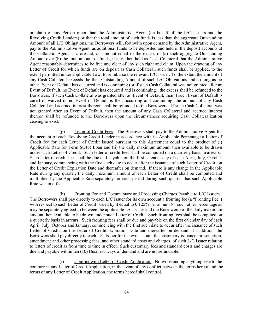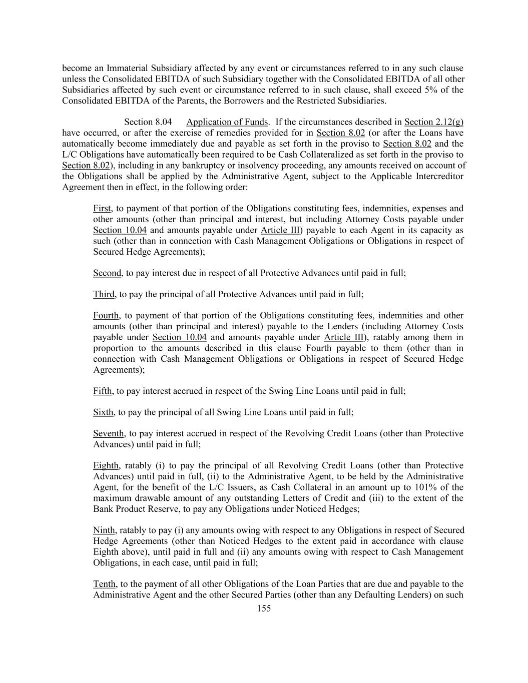 become an Immaterial Subsidiary affected by any event or circumstances referred to in any such clause unless the Consolidated EBITDA of such Subsidiary together with the Consolidated EBITDA of all other Subsidiaries affected by such event or circumstance referred to in such clause, shall exceed 5% of the Consolidated EBITDA of the Parents, the Borrowers and the Restricted Subsidiaries. Section 8.04 Application of Funds. If the circumstances described in Section 2.12(g) have occurred, or after the exercise of remedies provided for in Section 8.02 (or after the Loans have automatically become immediately due and payable as set forth in the proviso to Section 8.02 and the L/C Obligations have automatically been required to be Cash Collateralized as set forth in the proviso to Section 8.02), including in any bankruptcy or insolvency proceeding, any amounts received on account of the Obligations shall be applied by the Administrative Agent, subject to the Applicable Intercreditor Agreement then in effect, in the following order: First, to payment of that portion of the Obligations constituting fees, indemnities, expenses and other amounts (other than principal and interest, but including Attorney Costs payable under Section 10.04 and amounts payable under Article III) payable to each Agent in its capacity as such (other than in connection with Cash Management Obligations or Obligations in respect of Secured Hedge Agreements); Second, to pay interest due in respect of all Protective Advances until paid in full; Third, to pay the principal of all Protective Advances until paid in full; Fourth, to payment of that portion of the Obligations constituting fees, indemnities and other amounts (other than principal and interest) payable to the Lenders (including Attorney Costs payable under Section 10.04 and amounts payable under Article III), ratably among them in proportion to the amounts described in this clause Fourth payable to them (other than in connection with Cash Management Obligations or Obligations in respect of Secured Hedge Agreements); Fifth, to pay interest accrued in respect of the Swing Line Loans until paid in full; Sixth, to pay the principal of all Swing Line Loans until paid in full; Seventh, to pay interest accrued in respect of the Revolving Credit Loans (other than Protective Advances) until paid in full; Eighth, ratably (i) to pay the principal of all Revolving Credit Loans (other than Protective Advances) until paid in full, (ii) to the Administrative Agent, to be held by the Administrative Agent, for the benefit of the L/C Issuers, as Cash Collateral in an amount up to 101% of the maximum drawable amount of any outstanding Letters of Credit and (iii) to the extent of the Bank Product Reserve, to pay any Obligations under Noticed Hedges; Ninth, ratably to pay (i) any amounts owing with respect to any Obligations in respect of Secured Hedge Agreements (other than Noticed Hedges to the extent paid in accordance with clause Eighth above), until paid in full and (ii) any amounts owing with respect to Cash Management Obligations, in each case, until paid in full; Tenth, to the payment of all other Obligations of the Loan Parties that are due and payable to the Administrative Agent and the other Secured Parties (other than any Defaulting Lenders) on such 155