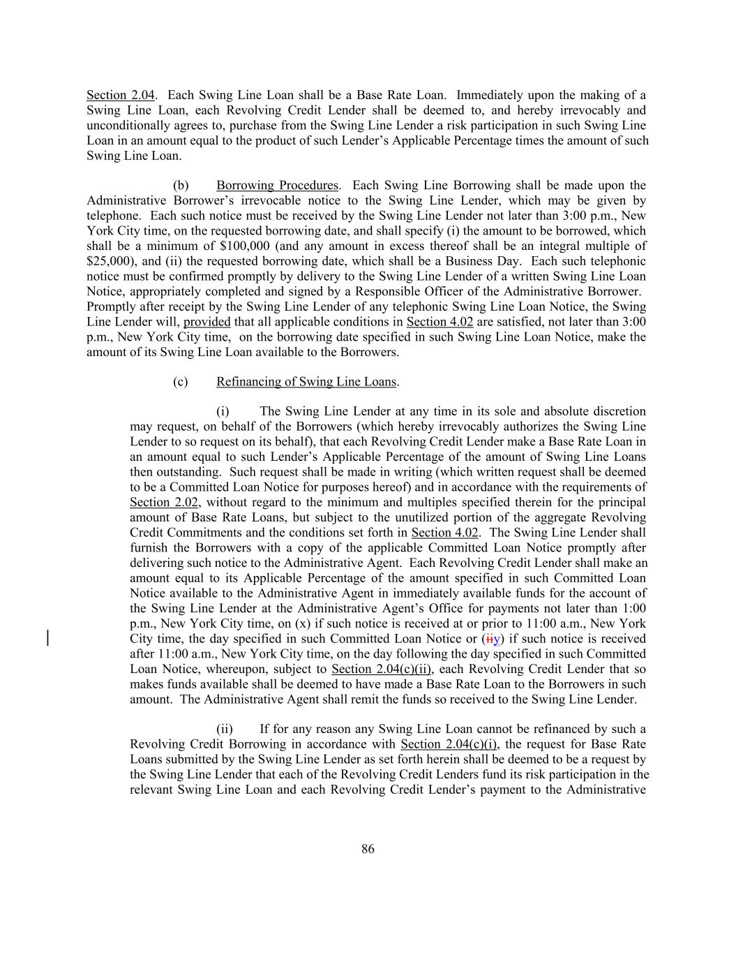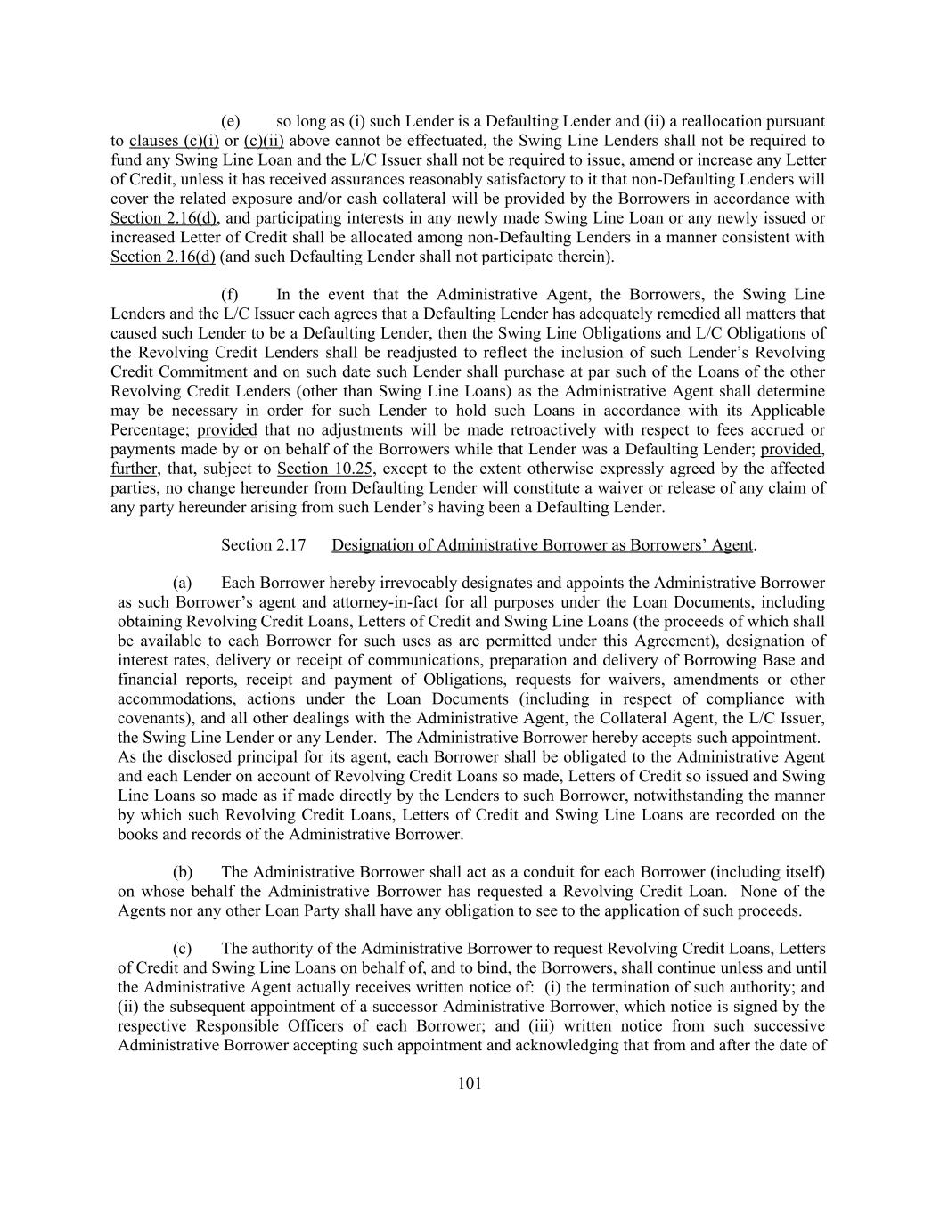 (e) so long as (i) such Lender is a Defaulting Lender and (ii) a reallocation pursuant to clauses (c)(i) or (c)(ii) above cannot be effectuated, the Swing Line Lenders shall not be required to fund any Swing Line Loan and the L/C Issuer shall not be required to issue, amend or increase any Letter of Credit, unless it has received assurances reasonably satisfactory to it that non-Defaulting Lenders will cover the related exposure and/or cash collateral will be provided by the Borrowers in accordance with Section 2.16(d), and participating interests in any newly made Swing Line Loan or any newly issued or increased Letter of Credit shall be allocated among non-Defaulting Lenders in a manner consistent with Section 2.16(d) (and such Defaulting Lender shall not participate therein). (f) In the event that the Administrative Agent, the Borrowers, the Swing Line Lenders and the L/C Issuer each agrees that a Defaulting Lender has adequately remedied all matters that caused such Lender to be a Defaulting Lender, then the Swing Line Obligations and L/C Obligations of the Revolving Credit Lenders shall be readjusted to reflect the inclusion of such Lender’s Revolving Credit Commitment and on such date such Lender shall purchase at par such of the Loans of the other Revolving Credit Lenders (other than Swing Line Loans) as the Administrative Agent shall determine may be necessary in order for such Lender to hold such Loans in accordance with its Applicable Percentage; provided that no adjustments will be made retroactively with respect to fees accrued or payments made by or on behalf of the Borrowers while that Lender was a Defaulting Lender; provided, further, that, subject to Section 10.25, except to the extent otherwise expressly agreed by the affected parties, no change hereunder from Defaulting Lender will constitute a waiver or release of any claim of any party hereunder arising from such Lender’s having been a Defaulting Lender. Section 2.17 Designation of Administrative Borrower as Borrowers’ Agent. (a) Each Borrower hereby irrevocably designates and appoints the Administrative Borrower as such Borrower’s agent and attorney-in-fact for all purposes under the Loan Documents, including obtaining Revolving Credit Loans, Letters of Credit and Swing Line Loans (the proceeds of which shall be available to each Borrower for such uses as are permitted under this Agreement), designation of interest rates, delivery or receipt of communications, preparation and delivery of Borrowing Base and financial reports, receipt and payment of Obligations, requests for waivers, amendments or other accommodations, actions under the Loan Documents (including in respect of compliance with covenants), and all other dealings with the Administrative Agent, the Collateral Agent, the L/C Issuer, the Swing Line Lender or any Lender. The Administrative Borrower hereby accepts such appointment. As the disclosed principal for its agent, each Borrower shall be obligated to the Administrative Agent and each Lender on account of Revolving Credit Loans so made, Letters of Credit so issued and Swing Line Loans so made as if made directly by the Lenders to such Borrower, notwithstanding the manner by which such Revolving Credit Loans, Letters of Credit and Swing Line Loans are recorded on the books and records of the Administrative Borrower. (b) The Administrative Borrower shall act as a conduit for each Borrower (including itself) on whose behalf the Administrative Borrower has requested a Revolving Credit Loan. None of the Agents nor any other Loan Party shall have any obligation to see to the application of such proceeds. (c) The authority of the Administrative Borrower to request Revolving Credit Loans, Letters of Credit and Swing Line Loans on behalf of, and to bind, the Borrowers, shall continue unless and until the Administrative Agent actually receives written notice of: (i) the termination of such authority; and (ii) the subsequent appointment of a successor Administrative Borrower, which notice is signed by the respective Responsible Officers of each Borrower; and (iii) written notice from such successive Administrative Borrower accepting such appointment and acknowledging that from and after the date of 101