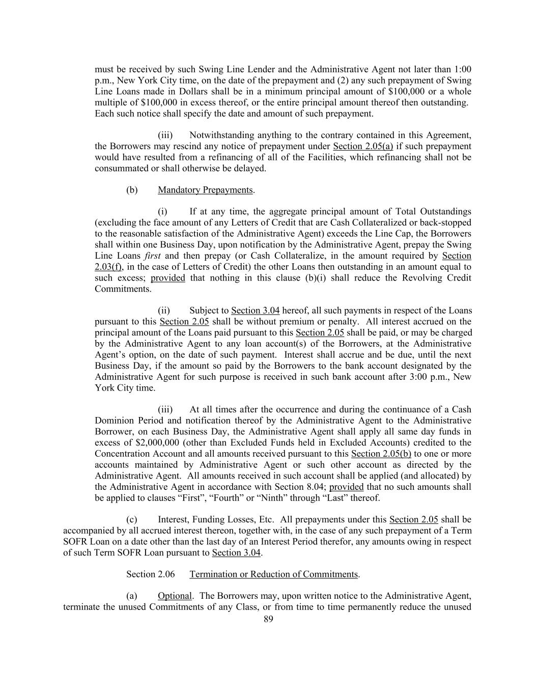 must be received by such Swing Line Lender and the Administrative Agent not later than 1:00 p.m., New York City time, on the date of the prepayment and (2) any such prepayment of Swing Line Loans made in Dollars shall be in a minimum principal amount of $100,000 or a whole multiple of $100,000 in excess thereof, or the entire principal amount thereof then outstanding. Each such notice shall specify the date and amount of such prepayment. (iii) Notwithstanding anything to the contrary contained in this Agreement, the Borrowers may rescind any notice of prepayment under Section 2.05(a) if such prepayment would have resulted from a refinancing of all of the Facilities, which refinancing shall not be consummated or shall otherwise be delayed. (b) Mandatory Prepayments. (i) If at any time, the aggregate principal amount of Total Outstandings (excluding the face amount of any Letters of Credit that are Cash Collateralized or back-stopped to the reasonable satisfaction of the Administrative Agent) exceeds the Line Cap, the Borrowers shall within one Business Day, upon notification by the Administrative Agent, prepay the Swing Line Loans first and then prepay (or Cash Collateralize, in the amount required by Section 2.03(f), in the case of Letters of Credit) the other Loans then outstanding in an amount equal to such excess; provided that nothing in this clause (b)(i) shall reduce the Revolving Credit Commitments. (ii) Subject to Section 3.04 hereof, all such payments in respect of the Loans pursuant to this Section 2.05 shall be without premium or penalty. All interest accrued on the principal amount of the Loans paid pursuant to this Section 2.05 shall be paid, or may be charged by the Administrative Agent to any loan account(s) of the Borrowers, at the Administrative Agent’s option, on the date of such payment. Interest shall accrue and be due, until the next Business Day, if the amount so paid by the Borrowers to the bank account designated by the Administrative Agent for such purpose is received in such bank account after 3:00 p.m., New York City time. (iii) At all times after the occurrence and during the continuance of a Cash Dominion Period and notification thereof by the Administrative Agent to the Administrative Borrower, on each Business Day, the Administrative Agent shall apply all same day funds in excess of $2,000,000 (other than Excluded Funds held in Excluded Accounts) credited to the Concentration Account and all amounts received pursuant to this Section 2.05(b) to one or more accounts maintained by Administrative Agent or such other account as directed by the Administrative Agent. All amounts received in such account shall be applied (and allocated) by the Administrative Agent in accordance with Section 8.04; provided that no such amounts shall be applied to clauses “First”, “Fourth” or “Ninth” through “Last” thereof. (c) Interest, Funding Losses, Etc. All prepayments under this Section 2.05 shall be accompanied by all accrued interest thereon, together with, in the case of any such prepayment of a Term SOFR Loan on a date other than the last day of an Interest Period therefor, any amounts owing in respect of such Term SOFR Loan pursuant to Section 3.04. Section 2.06 Termination or Reduction of Commitments. (a) Optional. The Borrowers may, upon written notice to the Administrative Agent, terminate the unused Commitments of any Class, or from time to time permanently reduce the unused 89