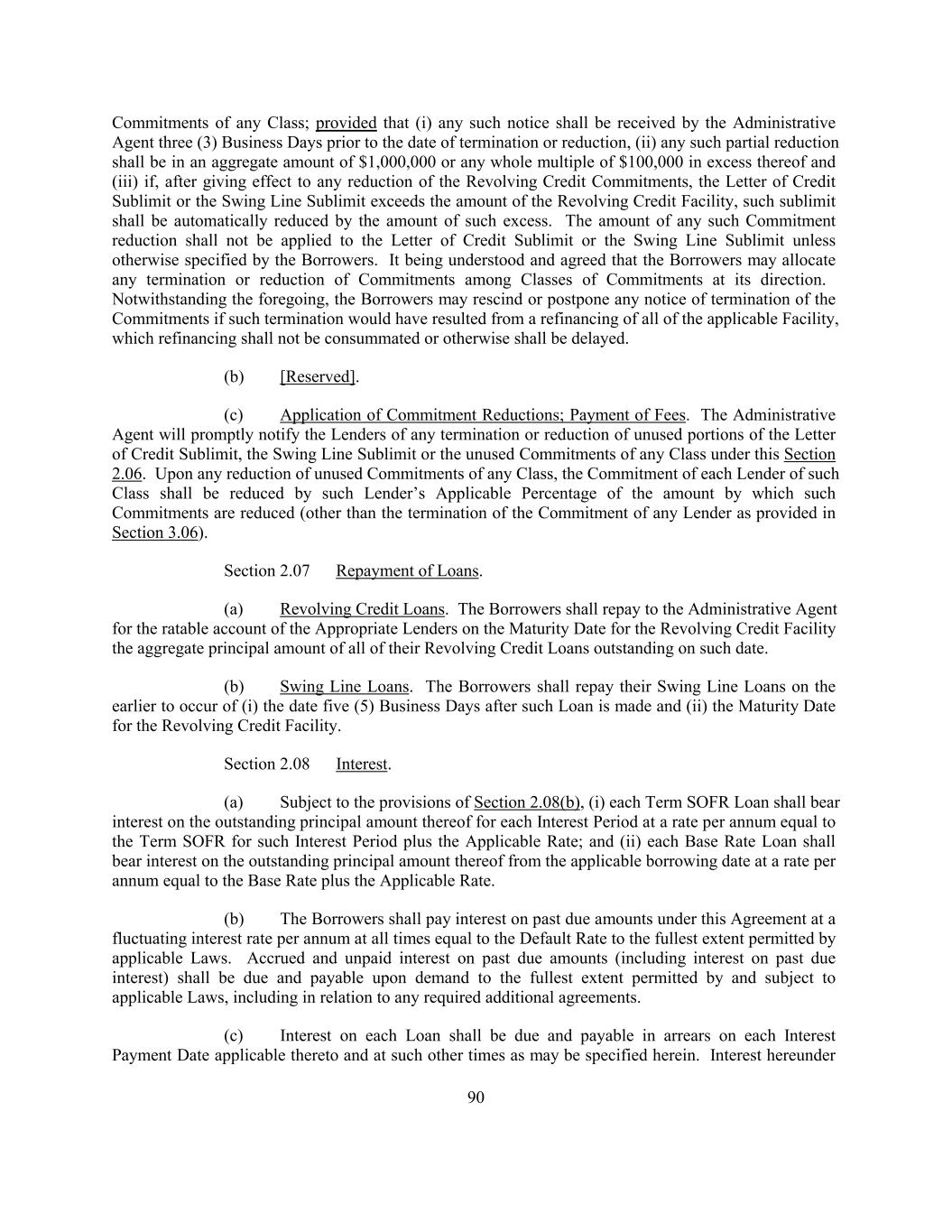 Commitments of any Class; provided that (i) any such notice shall be received by the Administrative Agent three (3) Business Days prior to the date of termination or reduction, (ii) any such partial reduction shall be in an aggregate amount of $1,000,000 or any whole multiple of $100,000 in excess thereof and (iii) if, after giving effect to any reduction of the Revolving Credit Commitments, the Letter of Credit Sublimit or the Swing Line Sublimit exceeds the amount of the Revolving Credit Facility, such sublimit shall be automatically reduced by the amount of such excess. The amount of any such Commitment reduction shall not be applied to the Letter of Credit Sublimit or the Swing Line Sublimit unless otherwise specified by the Borrowers. It being understood and agreed that the Borrowers may allocate any termination or reduction of Commitments among Classes of Commitments at its direction. Notwithstanding the foregoing, the Borrowers may rescind or postpone any notice of termination of the Commitments if such termination would have resulted from a refinancing of all of the applicable Facility, which refinancing shall not be consummated or otherwise shall be delayed. (b) [Reserved]. (c) Application of Commitment Reductions; Payment of Fees. The Administrative Agent will promptly notify the Lenders of any termination or reduction of unused portions of the Letter of Credit Sublimit, the Swing Line Sublimit or the unused Commitments of any Class under this Section 2.06. Upon any reduction of unused Commitments of any Class, the Commitment of each Lender of such Class shall be reduced by such Lender’s Applicable Percentage of the amount by which such Commitments are reduced (other than the termination of the Commitment of any Lender as provided in Section 3.06). Section 2.07 Repayment of Loans. (a) Revolving Credit Loans. The Borrowers shall repay to the Administrative Agent for the ratable account of the Appropriate Lenders on the Maturity Date for the Revolving Credit Facility the aggregate principal amount of all of their Revolving Credit Loans outstanding on such date. (b) Swing Line Loans. The Borrowers shall repay their Swing Line Loans on the earlier to occur of (i) the date five (5) Business Days after such Loan is made and (ii) the Maturity Date for the Revolving Credit Facility. Section 2.08 Interest. (a) Subject to the provisions of Section 2.08(b), (i) each Term SOFR Loan shall bear interest on the outstanding principal amount thereof for each Interest Period at a rate per annum equal to the Term SOFR for such Interest Period plus the Applicable Rate; and (ii) each Base Rate Loan shall bear interest on the outstanding principal amount thereof from the applicable borrowing date at a rate per annum equal to the Base Rate plus the Applicable Rate. (b) The Borrowers shall pay interest on past due amounts under this Agreement at a fluctuating interest rate per annum at all times equal to the Default Rate to the fullest extent permitted by applicable Laws. Accrued and unpaid interest on past due amounts (including interest on past due interest) shall be due and payable upon demand to the fullest extent permitted by and subject to applicable Laws, including in relation to any required additional agreements. (c) Interest on each Loan shall be due and payable in arrears on each Interest Payment Date applicable thereto and at such other times as may be specified herein. Interest hereunder 90