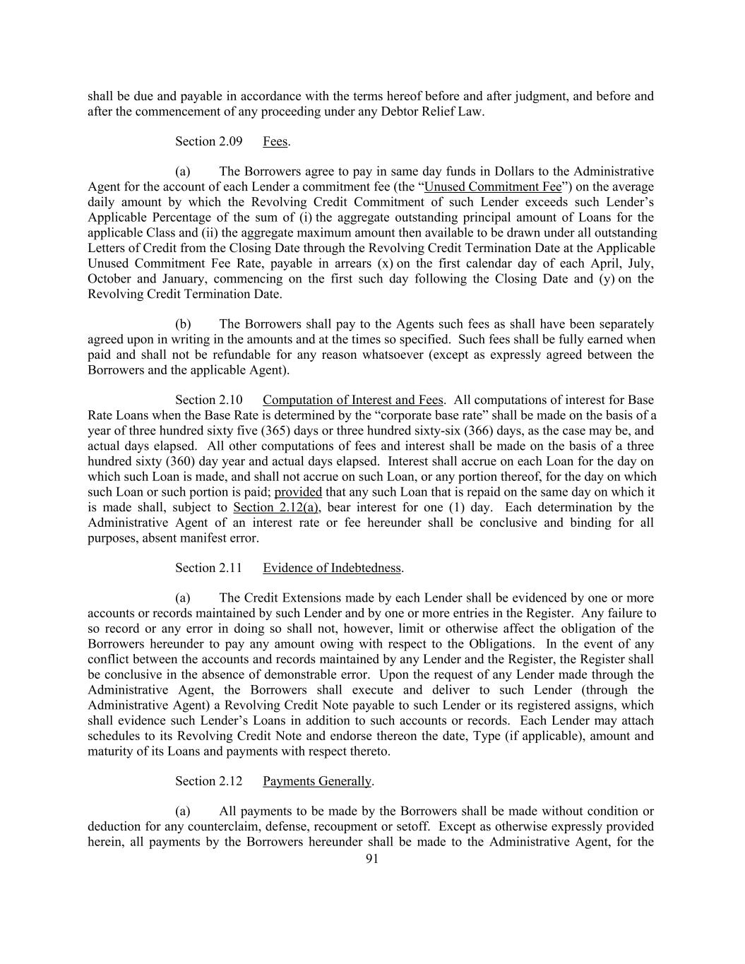 shall be due and payable in accordance with the terms hereof before and after judgment, and before and after the commencement of any proceeding under any Debtor Relief Law. Section 2.09 Fees. (a) The Borrowers agree to pay in same day funds in Dollars to the Administrative Agent for the account of each Lender a commitment fee (the “Unused Commitment Fee”) on the average daily amount by which the Revolving Credit Commitment of such Lender exceeds such Lender’s Applicable Percentage of the sum of (i) the aggregate outstanding principal amount of Loans for the applicable Class and (ii) the aggregate maximum amount then available to be drawn under all outstanding Letters of Credit from the Closing Date through the Revolving Credit Termination Date at the Applicable Unused Commitment Fee Rate, payable in arrears (x) on the first calendar day of each April, July, October and January, commencing on the first such day following the Closing Date and (y) on the Revolving Credit Termination Date. (b) The Borrowers shall pay to the Agents such fees as shall have been separately agreed upon in writing in the amounts and at the times so specified. Such fees shall be fully earned when paid and shall not be refundable for any reason whatsoever (except as expressly agreed between the Borrowers and the applicable Agent). Section 2.10 Computation of Interest and Fees. All computations of interest for Base Rate Loans when the Base Rate is determined by the “corporate base rate” shall be made on the basis of a year of three hundred sixty five (365) days or three hundred sixty-six (366) days, as the case may be, and actual days elapsed. All other computations of fees and interest shall be made on the basis of a three hundred sixty (360) day year and actual days elapsed. Interest shall accrue on each Loan for the day on which such Loan is made, and shall not accrue on such Loan, or any portion thereof, for the day on which such Loan or such portion is paid; provided that any such Loan that is repaid on the same day on which it is made shall, subject to Section 2.12(a), bear interest for one (1) day. Each determination by the Administrative Agent of an interest rate or fee hereunder shall be conclusive and binding for all purposes, absent manifest error. Section 2.11 Evidence of Indebtedness. (a) The Credit Extensions made by each Lender shall be evidenced by one or more accounts or records maintained by such Lender and by one or more entries in the Register. Any failure to so record or any error in doing so shall not, however, limit or otherwise affect the obligation of the Borrowers hereunder to pay any amount owing with respect to the Obligations. In the event of any conflict between the accounts and records maintained by any Lender and the Register, the Register shall be conclusive in the absence of demonstrable error. Upon the request of any Lender made through the Administrative Agent, the Borrowers shall execute and deliver to such Lender (through the Administrative Agent) a Revolving Credit Note payable to such Lender or its registered assigns, which shall evidence such Lender’s Loans in addition to such accounts or records. Each Lender may attach schedules to its Revolving Credit Note and endorse thereon the date, Type (if applicable), amount and maturity of its Loans and payments with respect thereto. Section 2.12 Payments Generally. (a) All payments to be made by the Borrowers shall be made without condition or deduction for any counterclaim, defense, recoupment or setoff. Except as otherwise expressly provided herein, all payments by the Borrowers hereunder shall be made to the Administrative Agent, for the 91