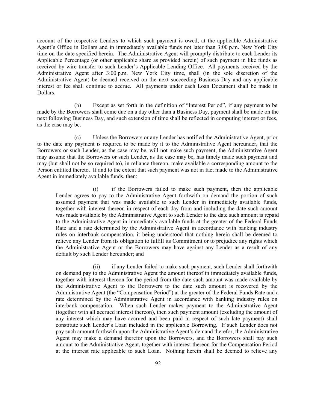 account of the respective Lenders to which such payment is owed, at the applicable Administrative Agent’s Office in Dollars and in immediately available funds not later than 3:00 p.m. New York City time on the date specified herein. The Administrative Agent will promptly distribute to each Lender its Applicable Percentage (or other applicable share as provided herein) of such payment in like funds as received by wire transfer to such Lender’s Applicable Lending Office. All payments received by the Administrative Agent after 3:00 p.m. New York City time, shall (in the sole discretion of the Administrative Agent) be deemed received on the next succeeding Business Day and any applicable interest or fee shall continue to accrue. All payments under each Loan Document shall be made in Dollars. (b) Except as set forth in the definition of “Interest Period”, if any payment to be made by the Borrowers shall come due on a day other than a Business Day, payment shall be made on the next following Business Day, and such extension of time shall be reflected in computing interest or fees, as the case may be. (c) Unless the Borrowers or any Lender has notified the Administrative Agent, prior to the date any payment is required to be made by it to the Administrative Agent hereunder, that the Borrowers or such Lender, as the case may be, will not make such payment, the Administrative Agent may assume that the Borrowers or such Lender, as the case may be, has timely made such payment and may (but shall not be so required to), in reliance thereon, make available a corresponding amount to the Person entitled thereto. If and to the extent that such payment was not in fact made to the Administrative Agent in immediately available funds, then: (i) if the Borrowers failed to make such payment, then the applicable Lender agrees to pay to the Administrative Agent forthwith on demand the portion of such assumed payment that was made available to such Lender in immediately available funds, together with interest thereon in respect of each day from and including the date such amount was made available by the Administrative Agent to such Lender to the date such amount is repaid to the Administrative Agent in immediately available funds at the greater of the Federal Funds Rate and a rate determined by the Administrative Agent in accordance with banking industry rules on interbank compensation, it being understood that nothing herein shall be deemed to relieve any Lender from its obligation to fulfill its Commitment or to prejudice any rights which the Administrative Agent or the Borrowers may have against any Lender as a result of any default by such Lender hereunder; and (ii) if any Lender failed to make such payment, such Lender shall forthwith on demand pay to the Administrative Agent the amount thereof in immediately available funds, together with interest thereon for the period from the date such amount was made available by the Administrative Agent to the Borrowers to the date such amount is recovered by the Administrative Agent (the “Compensation Period”) at the greater of the Federal Funds Rate and a rate determined by the Administrative Agent in accordance with banking industry rules on interbank compensation. When such Lender makes payment to the Administrative Agent (together with all accrued interest thereon), then such payment amount (excluding the amount of any interest which may have accrued and been paid in respect of such late payment) shall constitute such Lender’s Loan included in the applicable Borrowing. If such Lender does not pay such amount forthwith upon the Administrative Agent’s demand therefor, the Administrative Agent may make a demand therefor upon the Borrowers, and the Borrowers shall pay such amount to the Administrative Agent, together with interest thereon for the Compensation Period at the interest rate applicable to such Loan. Nothing herein shall be deemed to relieve any 92