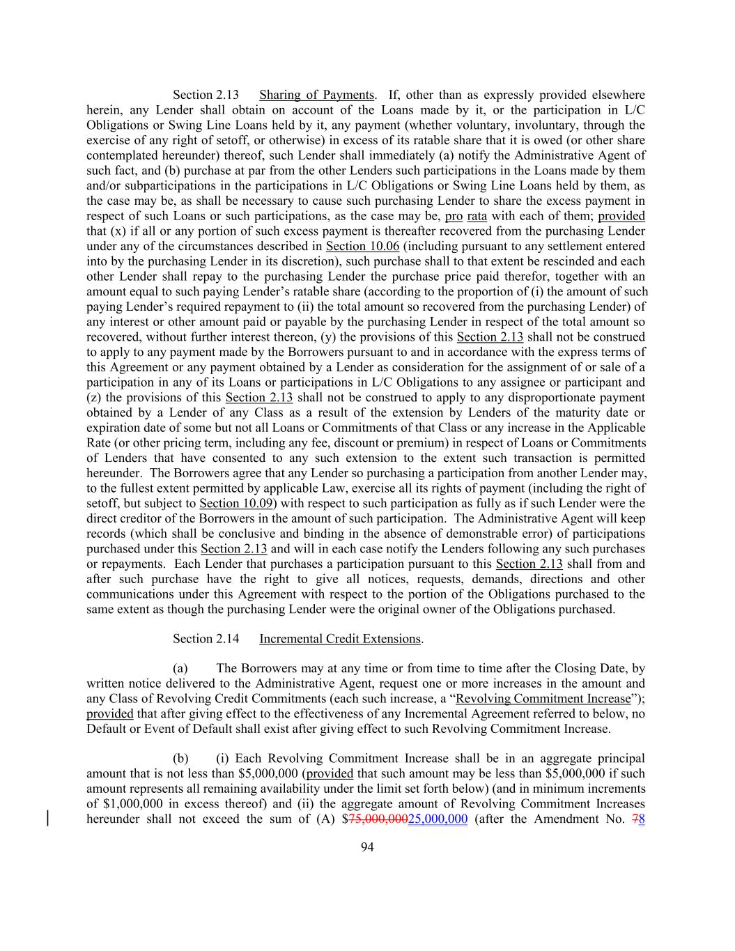 Section 2.13 Sharing of Payments. If, other than as expressly provided elsewhere herein, any Lender shall obtain on account of the Loans made by it, or the participation in L/C Obligations or Swing Line Loans held by it, any payment (whether voluntary, involuntary, through the exercise of any right of setoff, or otherwise) in excess of its ratable share that it is owed (or other share contemplated hereunder) thereof, such Lender shall immediately (a) notify the Administrative Agent of such fact, and (b) purchase at par from the other Lenders such participations in the Loans made by them and/or subparticipations in the participations in L/C Obligations or Swing Line Loans held by them, as the case may be, as shall be necessary to cause such purchasing Lender to share the excess payment in respect of such Loans or such participations, as the case may be, pro rata with each of them; provided that (x) if all or any portion of such excess payment is thereafter recovered from the purchasing Lender under any of the circumstances described in Section 10.06 (including pursuant to any settlement entered into by the purchasing Lender in its discretion), such purchase shall to that extent be rescinded and each other Lender shall repay to the purchasing Lender the purchase price paid therefor, together with an amount equal to such paying Lender’s ratable share (according to the proportion of (i) the amount of such paying Lender’s required repayment to (ii) the total amount so recovered from the purchasing Lender) of any interest or other amount paid or payable by the purchasing Lender in respect of the total amount so recovered, without further interest thereon, (y) the provisions of this Section 2.13 shall not be construed to apply to any payment made by the Borrowers pursuant to and in accordance with the express terms of this Agreement or any payment obtained by a Lender as consideration for the assignment of or sale of a participation in any of its Loans or participations in L/C Obligations to any assignee or participant and (z) the provisions of this Section 2.13 shall not be construed to apply to any disproportionate payment obtained by a Lender of any Class as a result of the extension by Lenders of the maturity date or expiration date of some but not all Loans or Commitments of that Class or any increase in the Applicable Rate (or other pricing term, including any fee, discount or premium) in respect of Loans or Commitments of Lenders that have consented to any such extension to the extent such transaction is permitted hereunder. The Borrowers agree that any Lender so purchasing a participation from another Lender may, to the fullest extent permitted by applicable Law, exercise all its rights of payment (including the right of setoff, but subject to Section 10.09) with respect to such participation as fully as if such Lender were the direct creditor of the Borrowers in the amount of such participation. The Administrative Agent will keep records (which shall be conclusive and binding in the absence of demonstrable error) of participations purchased under this Section 2.13 and will in each case notify the Lenders following any such purchases or repayments. Each Lender that purchases a participation pursuant to this Section 2.13 shall from and after such purchase have the right to give all notices, requests, demands, directions and other communications under this Agreement with respect to the portion of the Obligations purchased to the same extent as though the purchasing Lender were the original owner of the Obligations purchased. Section 2.14 Incremental Credit Extensions. (a) The Borrowers may at any time or from time to time after the Closing Date, by written notice delivered to the Administrative Agent, request one or more increases in the amount and any Class of Revolving Credit Commitments (each such increase, a “Revolving Commitment Increase”); provided that after giving effect to the effectiveness of any Incremental Agreement referred to below, no Default or Event of Default shall exist after giving effect to such Revolving Commitment Increase. (b) (i) Each Revolving Commitment Increase shall be in an aggregate principal amount that is not less than $5,000,000 (provided that such amount may be less than $5,000,000 if such amount represents all remaining availability under the limit set forth below) (and in minimum increments of $1,000,000 in excess thereof) and (ii) the aggregate amount of Revolving Commitment Increases hereunder shall not exceed the sum of (A) $75,000,00025,000,000 (after the Amendment No. 78 94