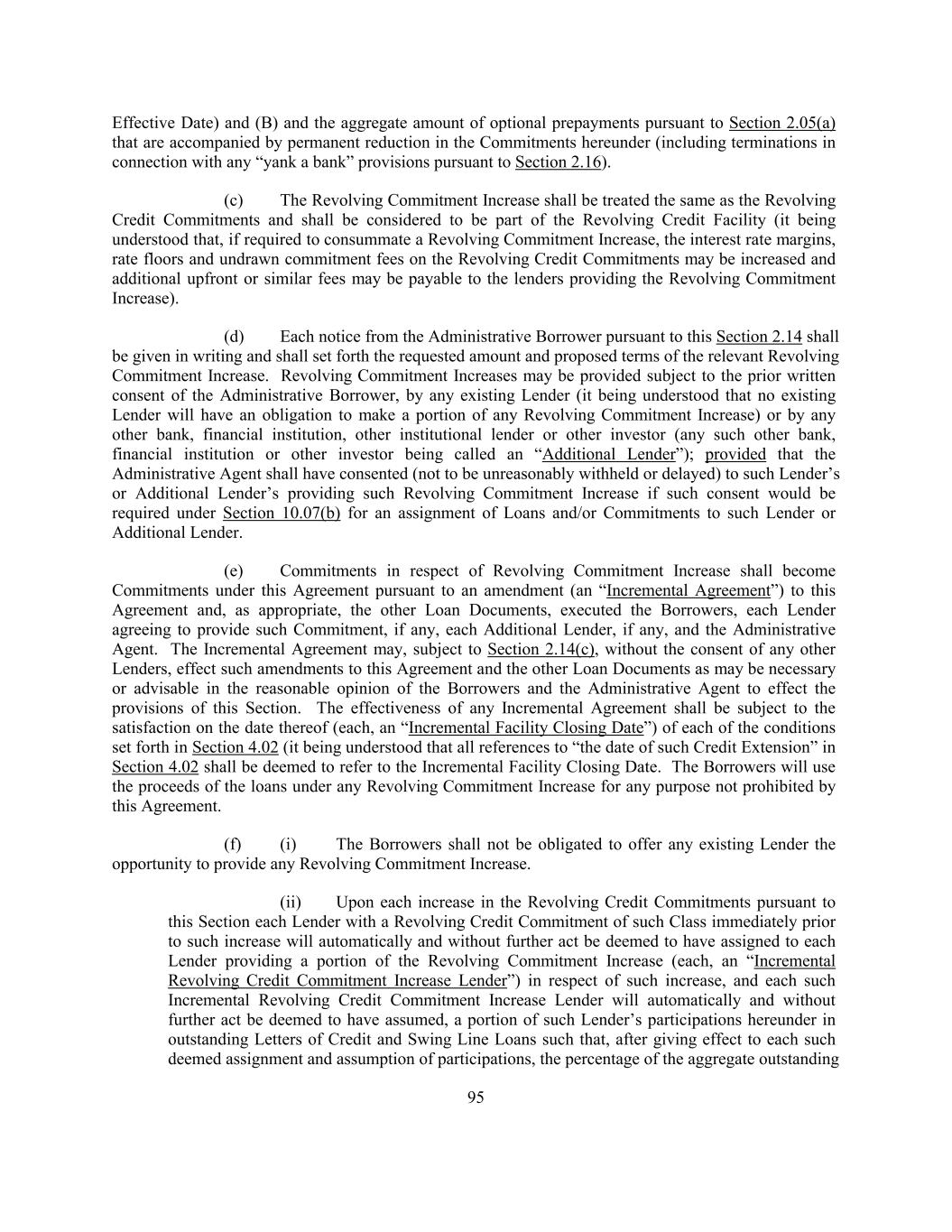 Effective Date) and (B) and the aggregate amount of optional prepayments pursuant to Section 2.05(a) that are accompanied by permanent reduction in the Commitments hereunder (including terminations in connection with any “yank a bank” provisions pursuant to Section 2.16). (c) The Revolving Commitment Increase shall be treated the same as the Revolving Credit Commitments and shall be considered to be part of the Revolving Credit Facility (it being understood that, if required to consummate a Revolving Commitment Increase, the interest rate margins, rate floors and undrawn commitment fees on the Revolving Credit Commitments may be increased and additional upfront or similar fees may be payable to the lenders providing the Revolving Commitment Increase). (d) Each notice from the Administrative Borrower pursuant to this Section 2.14 shall be given in writing and shall set forth the requested amount and proposed terms of the relevant Revolving Commitment Increase. Revolving Commitment Increases may be provided subject to the prior written consent of the Administrative Borrower, by any existing Lender (it being understood that no existing Lender will have an obligation to make a portion of any Revolving Commitment Increase) or by any other bank, financial institution, other institutional lender or other investor (any such other bank, financial institution or other investor being called an “Additional Lender”); provided that the Administrative Agent shall have consented (not to be unreasonably withheld or delayed) to such Lender’s or Additional Lender’s providing such Revolving Commitment Increase if such consent would be required under Section 10.07(b) for an assignment of Loans and/or Commitments to such Lender or Additional Lender. (e) Commitments in respect of Revolving Commitment Increase shall become Commitments under this Agreement pursuant to an amendment (an “Incremental Agreement”) to this Agreement and, as appropriate, the other Loan Documents, executed the Borrowers, each Lender agreeing to provide such Commitment, if any, each Additional Lender, if any, and the Administrative Agent. The Incremental Agreement may, subject to Section 2.14(c), without the consent of any other Lenders, effect such amendments to this Agreement and the other Loan Documents as may be necessary or advisable in the reasonable opinion of the Borrowers and the Administrative Agent to effect the provisions of this Section. The effectiveness of any Incremental Agreement shall be subject to the satisfaction on the date thereof (each, an “Incremental Facility Closing Date”) of each of the conditions set forth in Section 4.02 (it being understood that all references to “the date of such Credit Extension” in Section 4.02 shall be deemed to refer to the Incremental Facility Closing Date. The Borrowers will use the proceeds of the loans under any Revolving Commitment Increase for any purpose not prohibited by this Agreement. (f) (i) The Borrowers shall not be obligated to offer any existing Lender the opportunity to provide any Revolving Commitment Increase. (ii) Upon each increase in the Revolving Credit Commitments pursuant to this Section each Lender with a Revolving Credit Commitment of such Class immediately prior to such increase will automatically and without further act be deemed to have assigned to each Lender providing a portion of the Revolving Commitment Increase (each, an “Incremental Revolving Credit Commitment Increase Lender”) in respect of such increase, and each such Incremental Revolving Credit Commitment Increase Lender will automatically and without further act be deemed to have assumed, a portion of such Lender’s participations hereunder in outstanding Letters of Credit and Swing Line Loans such that, after giving effect to each such deemed assignment and assumption of participations, the percentage of the aggregate outstanding 95