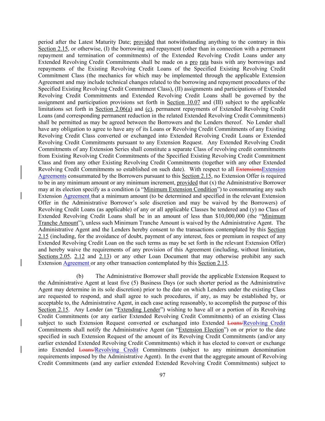 period after the Latest Maturity Date; provided that notwithstanding anything to the contrary in this Section 2.15, or otherwise, (I) the borrowing and repayment (other than in connection with a permanent repayment and termination of commitments) of the Extended Revolving Credit Loans under any Extended Revolving Credit Commitments shall be made on a pro rata basis with any borrowings and repayments of the Existing Revolving Credit Loans of the Specified Existing Revolving Credit Commitment Class (the mechanics for which may be implemented through the applicable Extension Agreement and may include technical changes related to the borrowing and repayment procedures of the Specified Existing Revolving Credit Commitment Class), (II) assignments and participations of Extended Revolving Credit Commitments and Extended Revolving Credit Loans shall be governed by the assignment and participation provisions set forth in Section 10.07 and (III) subject to the applicable limitations set forth in Section 2.06(a) and (c), permanent repayments of Extended Revolving Credit Loans (and corresponding permanent reduction in the related Extended Revolving Credit Commitments) shall be permitted as may be agreed between the Borrowers and the Lenders thereof. No Lender shall have any obligation to agree to have any of its Loans or Revolving Credit Commitments of any Existing Revolving Credit Class converted or exchanged into Extended Revolving Credit Loans or Extended Revolving Credit Commitments pursuant to any Extension Request. Any Extended Revolving Credit Commitments of any Extension Series shall constitute a separate Class of revolving credit commitments from Existing Revolving Credit Commitments of the Specified Existing Revolving Credit Commitment Class and from any other Existing Revolving Credit Commitments (together with any other Extended Revolving Credit Commitments so established on such date). With respect to all ExtensionsExtension Agreements consummated by the Borrowers pursuant to this Section 2.15, no Extension Offer is required to be in any minimum amount or any minimum increment, provided that (x) the Administrative Borrower may at its election specify as a condition (a “Minimum Extension Condition”) to consummating any such Extension Agreement that a minimum amount (to be determined and specified in the relevant Extension Offer in the Administrative Borrower’s sole discretion and may be waived by the Borrowers) of Revolving Credit Loans (as applicable) of any or all applicable Classes be tendered and (y) no Class of Extended Revolving Credit Loans shall be in an amount of less than $10,000,000 (the “Minimum Tranche Amount”), unless such Minimum Tranche Amount is waived by the Administrative Agent. The Administrative Agent and the Lenders hereby consent to the transactions contemplated by this Section 2.15 (including, for the avoidance of doubt, payment of any interest, fees or premium in respect of any Extended Revolving Credit Loan on the such terms as may be set forth in the relevant Extension Offer) and hereby waive the requirements of any provision of this Agreement (including, without limitation, Sections 2.05, 2.12 and 2.13) or any other Loan Document that may otherwise prohibit any such Extension Agreement or any other transaction contemplated by this Section 2.15. (b) The Administrative Borrower shall provide the applicable Extension Request to the Administrative Agent at least five (5) Business Days (or such shorter period as the Administrative Agent may determine in its sole discretion) prior to the date on which Lenders under the existing Class are requested to respond, and shall agree to such procedures, if any, as may be established by, or acceptable to, the Administrative Agent, in each case acting reasonably, to accomplish the purpose of this Section 2.15. Any Lender (an “Extending Lender”) wishing to have all or a portion of its Revolving Credit Commitments (or any earlier Extended Revolving Credit Commitments) of an existing Class subject to such Extension Request converted or exchanged into Extended Loans/Revolving Credit Commitments shall notify the Administrative Agent (an “Extension Election”) on or prior to the date specified in such Extension Request of the amount of its Revolving Credit Commitments (and/or any earlier extended Extended Revolving Credit Commitments) which it has elected to convert or exchange into Extended Loans/Revolving Credit Commitments (subject to any minimum denomination requirements imposed by the Administrative Agent). In the event that the aggregate amount of Revolving Credit Commitments (and any earlier extended Extended Revolving Credit Commitments) subject to 97