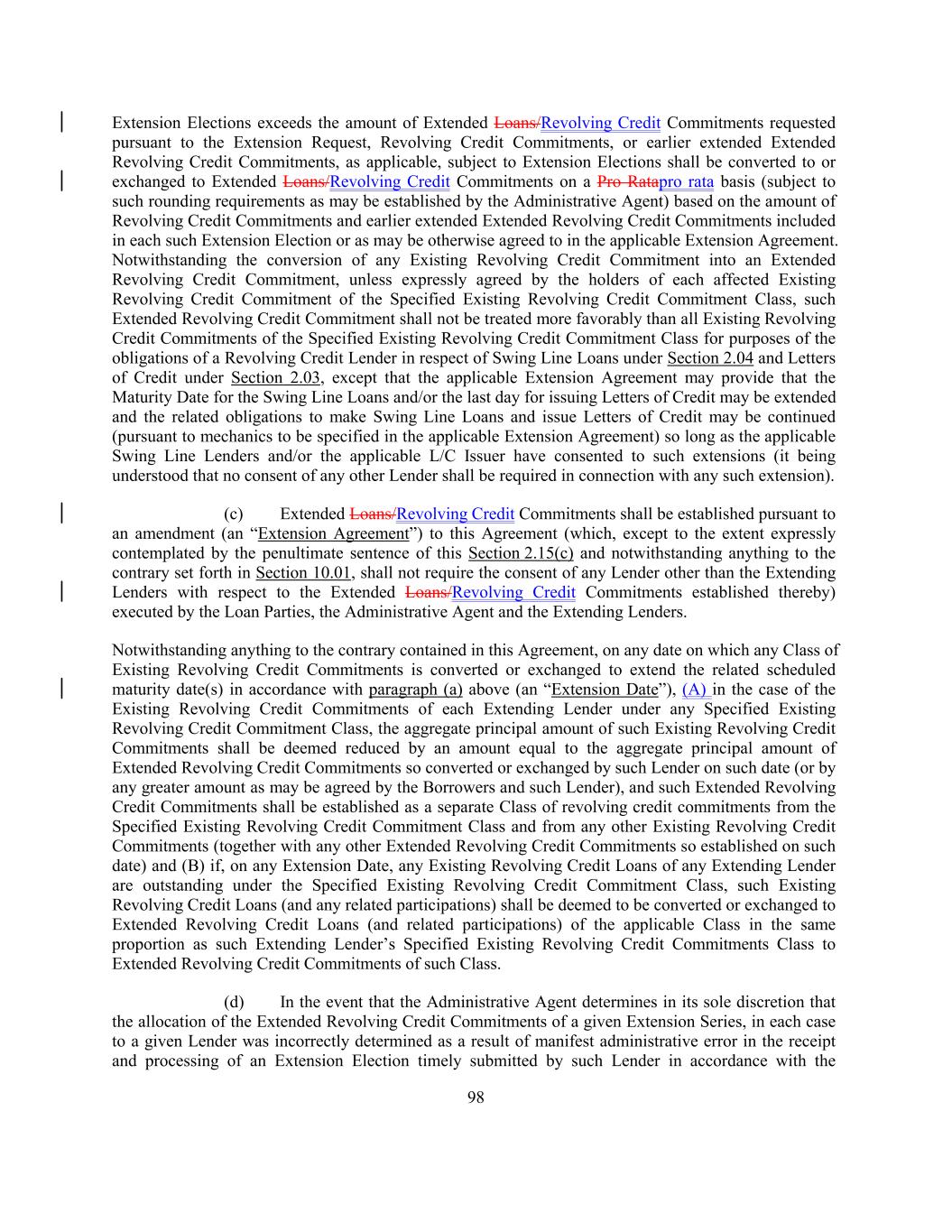 Extension Elections exceeds the amount of Extended Loans/Revolving Credit Commitments requested pursuant to the Extension Request, Revolving Credit Commitments, or earlier extended Extended Revolving Credit Commitments, as applicable, subject to Extension Elections shall be converted to or exchanged to Extended Loans/Revolving Credit Commitments on a Pro Ratapro rata basis (subject to such rounding requirements as may be established by the Administrative Agent) based on the amount of Revolving Credit Commitments and earlier extended Extended Revolving Credit Commitments included in each such Extension Election or as may be otherwise agreed to in the applicable Extension Agreement. Notwithstanding the conversion of any Existing Revolving Credit Commitment into an Extended Revolving Credit Commitment, unless expressly agreed by the holders of each affected Existing Revolving Credit Commitment of the Specified Existing Revolving Credit Commitment Class, such Extended Revolving Credit Commitment shall not be treated more favorably than all Existing Revolving Credit Commitments of the Specified Existing Revolving Credit Commitment Class for purposes of the obligations of a Revolving Credit Lender in respect of Swing Line Loans under Section 2.04 and Letters of Credit under Section 2.03, except that the applicable Extension Agreement may provide that the Maturity Date for the Swing Line Loans and/or the last day for issuing Letters of Credit may be extended and the related obligations to make Swing Line Loans and issue Letters of Credit may be continued (pursuant to mechanics to be specified in the applicable Extension Agreement) so long as the applicable Swing Line Lenders and/or the applicable L/C Issuer have consented to such extensions (it being understood that no consent of any other Lender shall be required in connection with any such extension). (c) Extended Loans/Revolving Credit Commitments shall be established pursuant to an amendment (an “Extension Agreement”) to this Agreement (which, except to the extent expressly contemplated by the penultimate sentence of this Section 2.15(c) and notwithstanding anything to the contrary set forth in Section 10.01, shall not require the consent of any Lender other than the Extending Lenders with respect to the Extended Loans/Revolving Credit Commitments established thereby) executed by the Loan Parties, the Administrative Agent and the Extending Lenders. Notwithstanding anything to the contrary contained in this Agreement, on any date on which any Class of Existing Revolving Credit Commitments is converted or exchanged to extend the related scheduled maturity date(s) in accordance with paragraph (a) above (an “Extension Date”), (A) in the case of the Existing Revolving Credit Commitments of each Extending Lender under any Specified Existing Revolving Credit Commitment Class, the aggregate principal amount of such Existing Revolving Credit Commitments shall be deemed reduced by an amount equal to the aggregate principal amount of Extended Revolving Credit Commitments so converted or exchanged by such Lender on such date (or by any greater amount as may be agreed by the Borrowers and such Lender), and such Extended Revolving Credit Commitments shall be established as a separate Class of revolving credit commitments from the Specified Existing Revolving Credit Commitment Class and from any other Existing Revolving Credit Commitments (together with any other Extended Revolving Credit Commitments so established on such date) and (B) if, on any Extension Date, any Existing Revolving Credit Loans of any Extending Lender are outstanding under the Specified Existing Revolving Credit Commitment Class, such Existing Revolving Credit Loans (and any related participations) shall be deemed to be converted or exchanged to Extended Revolving Credit Loans (and related participations) of the applicable Class in the same proportion as such Extending Lender’s Specified Existing Revolving Credit Commitments Class to Extended Revolving Credit Commitments of such Class. (d) In the event that the Administrative Agent determines in its sole discretion that the allocation of the Extended Revolving Credit Commitments of a given Extension Series, in each case to a given Lender was incorrectly determined as a result of manifest administrative error in the receipt and processing of an Extension Election timely submitted by such Lender in accordance with the 98