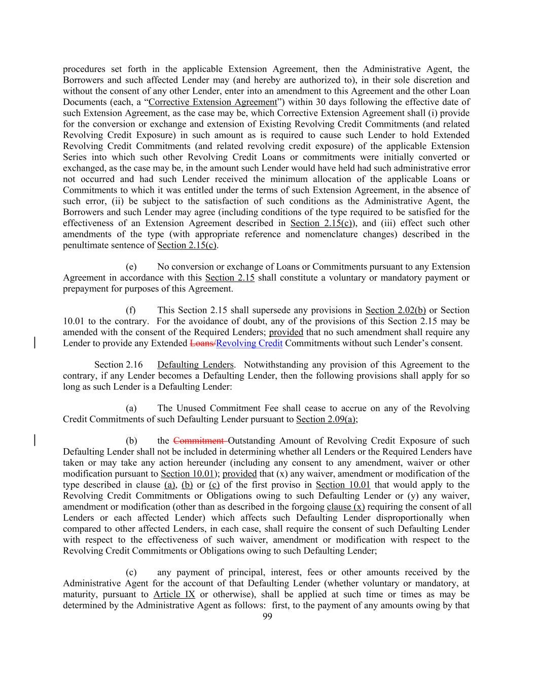 procedures set forth in the applicable Extension Agreement, then the Administrative Agent, the Borrowers and such affected Lender may (and hereby are authorized to), in their sole discretion and without the consent of any other Lender, enter into an amendment to this Agreement and the other Loan Documents (each, a “Corrective Extension Agreement”) within 30 days following the effective date of such Extension Agreement, as the case may be, which Corrective Extension Agreement shall (i) provide for the conversion or exchange and extension of Existing Revolving Credit Commitments (and related Revolving Credit Exposure) in such amount as is required to cause such Lender to hold Extended Revolving Credit Commitments (and related revolving credit exposure) of the applicable Extension Series into which such other Revolving Credit Loans or commitments were initially converted or exchanged, as the case may be, in the amount such Lender would have held had such administrative error not occurred and had such Lender received the minimum allocation of the applicable Loans or Commitments to which it was entitled under the terms of such Extension Agreement, in the absence of such error, (ii) be subject to the satisfaction of such conditions as the Administrative Agent, the Borrowers and such Lender may agree (including conditions of the type required to be satisfied for the effectiveness of an Extension Agreement described in Section 2.15(c)), and (iii) effect such other amendments of the type (with appropriate reference and nomenclature changes) described in the penultimate sentence of Section 2.15(c). (e) No conversion or exchange of Loans or Commitments pursuant to any Extension Agreement in accordance with this Section 2.15 shall constitute a voluntary or mandatory payment or prepayment for purposes of this Agreement. (f) This Section 2.15 shall supersede any provisions in Section 2.02(b) or Section 10.01 to the contrary. For the avoidance of doubt, any of the provisions of this Section 2.15 may be amended with the consent of the Required Lenders; provided that no such amendment shall require any Lender to provide any Extended Loans/Revolving Credit Commitments without such Lender’s consent. Section 2.16 Defaulting Lenders. Notwithstanding any provision of this Agreement to the contrary, if any Lender becomes a Defaulting Lender, then the following provisions shall apply for so long as such Lender is a Defaulting Lender: (a) The Unused Commitment Fee shall cease to accrue on any of the Revolving Credit Commitments of such Defaulting Lender pursuant to Section 2.09(a); (b) the Commitment Outstanding Amount of Revolving Credit Exposure of such Defaulting Lender shall not be included in determining whether all Lenders or the Required Lenders have taken or may take any action hereunder (including any consent to any amendment, waiver or other modification pursuant to Section 10.01); provided that (x) any waiver, amendment or modification of the type described in clause (a), (b) or (c) of the first proviso in Section 10.01 that would apply to the Revolving Credit Commitments or Obligations owing to such Defaulting Lender or (y) any waiver, amendment or modification (other than as described in the forgoing clause (x) requiring the consent of all Lenders or each affected Lender) which affects such Defaulting Lender disproportionally when compared to other affected Lenders, in each case, shall require the consent of such Defaulting Lender with respect to the effectiveness of such waiver, amendment or modification with respect to the Revolving Credit Commitments or Obligations owing to such Defaulting Lender; (c) any payment of principal, interest, fees or other amounts received by the Administrative Agent for the account of that Defaulting Lender (whether voluntary or mandatory, at maturity, pursuant to Article IX or otherwise), shall be applied at such time or times as may be determined by the Administrative Agent as follows: first, to the payment of any amounts owing by that 99