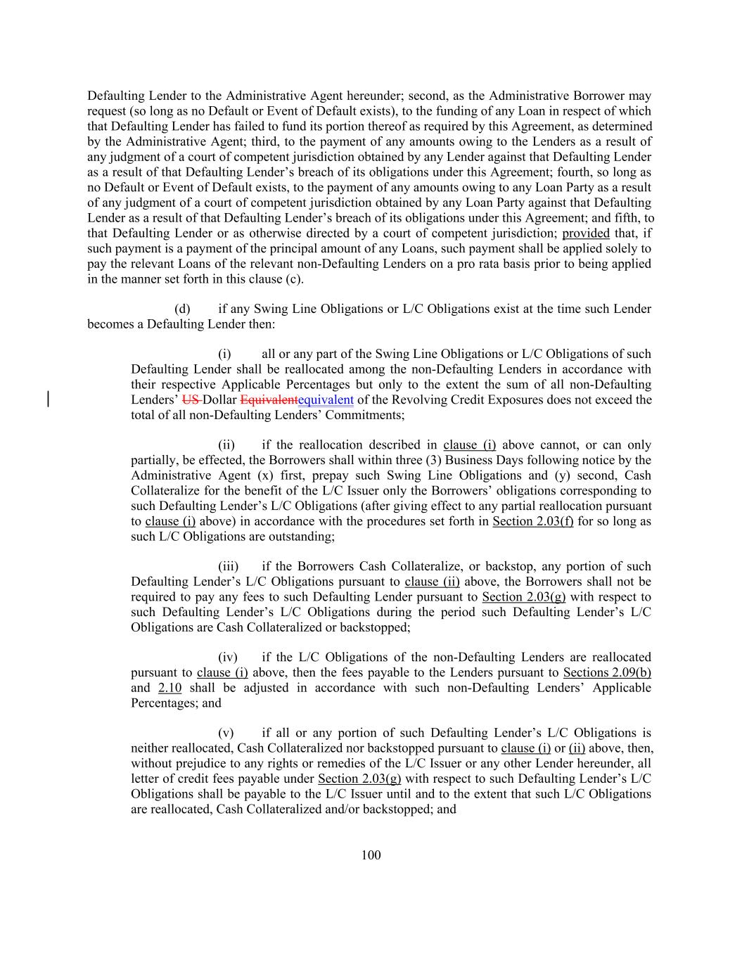 Defaulting Lender to the Administrative Agent hereunder; second, as the Administrative Borrower may request (so long as no Default or Event of Default exists), to the funding of any Loan in respect of which that Defaulting Lender has failed to fund its portion thereof as required by this Agreement, as determined by the Administrative Agent; third, to the payment of any amounts owing to the Lenders as a result of any judgment of a court of competent jurisdiction obtained by any Lender against that Defaulting Lender as a result of that Defaulting Lender’s breach of its obligations under this Agreement; fourth, so long as no Default or Event of Default exists, to the payment of any amounts owing to any Loan Party as a result of any judgment of a court of competent jurisdiction obtained by any Loan Party against that Defaulting Lender as a result of that Defaulting Lender’s breach of its obligations under this Agreement; and fifth, to that Defaulting Lender or as otherwise directed by a court of competent jurisdiction; provided that, if such payment is a payment of the principal amount of any Loans, such payment shall be applied solely to pay the relevant Loans of the relevant non-Defaulting Lenders on a pro rata basis prior to being applied in the manner set forth in this clause (c). (d) if any Swing Line Obligations or L/C Obligations exist at the time such Lender becomes a Defaulting Lender then: (i) all or any part of the Swing Line Obligations or L/C Obligations of such Defaulting Lender shall be reallocated among the non-Defaulting Lenders in accordance with their respective Applicable Percentages but only to the extent the sum of all non-Defaulting Lenders’ US Dollar Equivalentequivalent of the Revolving Credit Exposures does not exceed the total of all non-Defaulting Lenders’ Commitments; (ii) if the reallocation described in clause (i) above cannot, or can only partially, be effected, the Borrowers shall within three (3) Business Days following notice by the Administrative Agent (x) first, prepay such Swing Line Obligations and (y) second, Cash Collateralize for the benefit of the L/C Issuer only the Borrowers’ obligations corresponding to such Defaulting Lender’s L/C Obligations (after giving effect to any partial reallocation pursuant to clause (i) above) in accordance with the procedures set forth in Section 2.03(f) for so long as such L/C Obligations are outstanding; (iii) if the Borrowers Cash Collateralize, or backstop, any portion of such Defaulting Lender’s L/C Obligations pursuant to clause (ii) above, the Borrowers shall not be required to pay any fees to such Defaulting Lender pursuant to Section 2.03(g) with respect to such Defaulting Lender’s L/C Obligations during the period such Defaulting Lender’s L/C Obligations are Cash Collateralized or backstopped; (iv) if the L/C Obligations of the non-Defaulting Lenders are reallocated pursuant to clause (i) above, then the fees payable to the Lenders pursuant to Sections 2.09(b) and 2.10 shall be adjusted in accordance with such non-Defaulting Lenders’ Applicable Percentages; and (v) if all or any portion of such Defaulting Lender’s L/C Obligations is neither reallocated, Cash Collateralized nor backstopped pursuant to clause (i) or (ii) above, then, without prejudice to any rights or remedies of the L/C Issuer or any other Lender hereunder, all letter of credit fees payable under Section 2.03(g) with respect to such Defaulting Lender’s L/C Obligations shall be payable to the L/C Issuer until and to the extent that such L/C Obligations are reallocated, Cash Collateralized and/or backstopped; and 100