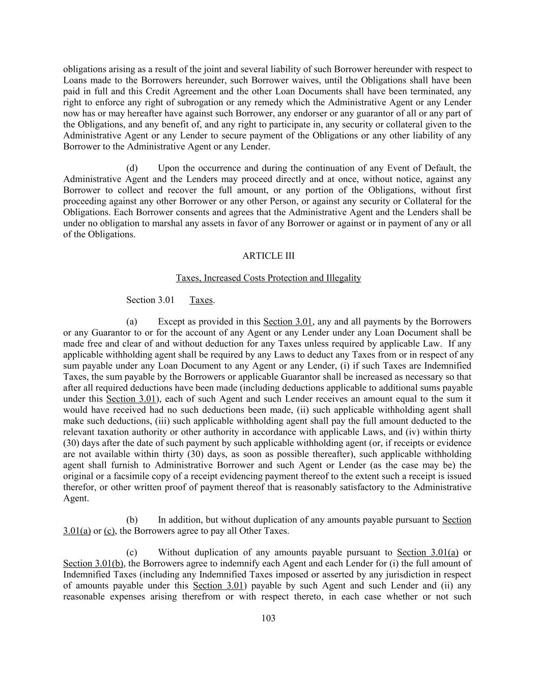 obligations arising as a result of the joint and several liability of such Borrower hereunder with respect to Loans made to the Borrowers hereunder, such Borrower waives, until the Obligations shall have been paid in full and this Credit Agreement and the other Loan Documents shall have been terminated, any right to enforce any right of subrogation or any remedy which the Administrative Agent or any Lender now has or may hereafter have against such Borrower, any endorser or any guarantor of all or any part of the Obligations, and any benefit of, and any right to participate in, any security or collateral given to the Administrative Agent or any Lender to secure payment of the Obligations or any other liability of any Borrower to the Administrative Agent or any Lender. (d) Upon the occurrence and during the continuation of any Event of Default, the Administrative Agent and the Lenders may proceed directly and at once, without notice, against any Borrower to collect and recover the full amount, or any portion of the Obligations, without first proceeding against any other Borrower or any other Person, or against any security or Collateral for the Obligations. Each Borrower consents and agrees that the Administrative Agent and the Lenders shall be under no obligation to marshal any assets in favor of any Borrower or against or in payment of any or all of the Obligations. ARTICLE III Taxes, Increased Costs Protection and Illegality Section 3.01 Taxes. (a) Except as provided in this Section 3.01, any and all payments by the Borrowers or any Guarantor to or for the account of any Agent or any Lender under any Loan Document shall be made free and clear of and without deduction for any Taxes unless required by applicable Law. If any applicable withholding agent shall be required by any Laws to deduct any Taxes from or in respect of any sum payable under any Loan Document to any Agent or any Lender, (i) if such Taxes are Indemnified Taxes, the sum payable by the Borrowers or applicable Guarantor shall be increased as necessary so that after all required deductions have been made (including deductions applicable to additional sums payable under this Section 3.01), each of such Agent and such Lender receives an amount equal to the sum it would have received had no such deductions been made, (ii) such applicable withholding agent shall make such deductions, (iii) such applicable withholding agent shall pay the full amount deducted to the relevant taxation authority or other authority in accordance with applicable Laws, and (iv) within thirty (30) days after the date of such payment by such applicable withholding agent (or, if receipts or evidence are not available within thirty (30) days, as soon as possible thereafter), such applicable withholding agent shall furnish to Administrative Borrower and such Agent or Lender (as the case may be) the original or a facsimile copy of a receipt evidencing payment thereof to the extent such a receipt is issued therefor, or other written proof of payment thereof that is reasonably satisfactory to the Administrative Agent. (b) In addition, but without duplication of any amounts payable pursuant to Section 3.01(a) or (c), the Borrowers agree to pay all Other Taxes. (c) Without duplication of any amounts payable pursuant to Section 3.01(a) or Section 3.01(b), the Borrowers agree to indemnify each Agent and each Lender for (i) the full amount of Indemnified Taxes (including any Indemnified Taxes imposed or asserted by any jurisdiction in respect of amounts payable under this Section 3.01) payable by such Agent and such Lender and (ii) any reasonable expenses arising therefrom or with respect thereto, in each case whether or not such 103