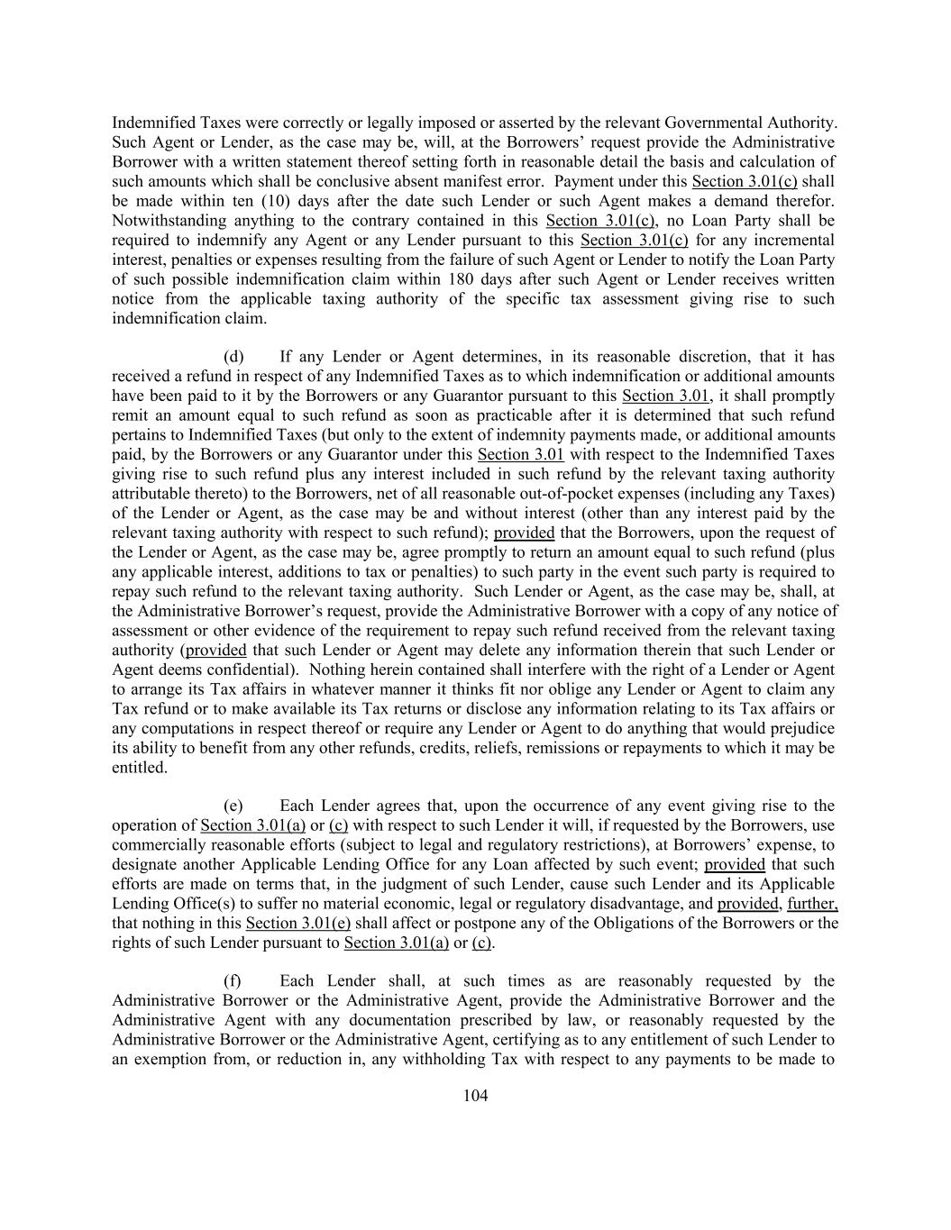Indemnified Taxes were correctly or legally imposed or asserted by the relevant Governmental Authority. Such Agent or Lender, as the case may be, will, at the Borrowers’ request provide the Administrative Borrower with a written statement thereof setting forth in reasonable detail the basis and calculation of such amounts which shall be conclusive absent manifest error. Payment under this Section 3.01(c) shall be made within ten (10) days after the date such Lender or such Agent makes a demand therefor. Notwithstanding anything to the contrary contained in this Section 3.01(c), no Loan Party shall be required to indemnify any Agent or any Lender pursuant to this Section 3.01(c) for any incremental interest, penalties or expenses resulting from the failure of such Agent or Lender to notify the Loan Party of such possible indemnification claim within 180 days after such Agent or Lender receives written notice from the applicable taxing authority of the specific tax assessment giving rise to such indemnification claim. (d) If any Lender or Agent determines, in its reasonable discretion, that it has received a refund in respect of any Indemnified Taxes as to which indemnification or additional amounts have been paid to it by the Borrowers or any Guarantor pursuant to this Section 3.01, it shall promptly remit an amount equal to such refund as soon as practicable after it is determined that such refund pertains to Indemnified Taxes (but only to the extent of indemnity payments made, or additional amounts paid, by the Borrowers or any Guarantor under this Section 3.01 with respect to the Indemnified Taxes giving rise to such refund plus any interest included in such refund by the relevant taxing authority attributable thereto) to the Borrowers, net of all reasonable out-of-pocket expenses (including any Taxes) of the Lender or Agent, as the case may be and without interest (other than any interest paid by the relevant taxing authority with respect to such refund); provided that the Borrowers, upon the request of the Lender or Agent, as the case may be, agree promptly to return an amount equal to such refund (plus any applicable interest, additions to tax or penalties) to such party in the event such party is required to repay such refund to the relevant taxing authority. Such Lender or Agent, as the case may be, shall, at the Administrative Borrower’s request, provide the Administrative Borrower with a copy of any notice of assessment or other evidence of the requirement to repay such refund received from the relevant taxing authority (provided that such Lender or Agent may delete any information therein that such Lender or Agent deems confidential). Nothing herein contained shall interfere with the right of a Lender or Agent to arrange its Tax affairs in whatever manner it thinks fit nor oblige any Lender or Agent to claim any Tax refund or to make available its Tax returns or disclose any information relating to its Tax affairs or any computations in respect thereof or require any Lender or Agent to do anything that would prejudice its ability to benefit from any other refunds, credits, reliefs, remissions or repayments to which it may be entitled. (e) Each Lender agrees that, upon the occurrence of any event giving rise to the operation of Section 3.01(a) or (c) with respect to such Lender it will, if requested by the Borrowers, use commercially reasonable efforts (subject to legal and regulatory restrictions), at Borrowers’ expense, to designate another Applicable Lending Office for any Loan affected by such event; provided that such efforts are made on terms that, in the judgment of such Lender, cause such Lender and its Applicable Lending Office(s) to suffer no material economic, legal or regulatory disadvantage, and provided, further, that nothing in this Section 3.01(e) shall affect or postpone any of the Obligations of the Borrowers or the rights of such Lender pursuant to Section 3.01(a) or (c). (f) Each Lender shall, at such times as are reasonably requested by the Administrative Borrower or the Administrative Agent, provide the Administrative Borrower and the Administrative Agent with any documentation prescribed by law, or reasonably requested by the Administrative Borrower or the Administrative Agent, certifying as to any entitlement of such Lender to an exemption from, or reduction in, any withholding Tax with respect to any payments to be made to 104