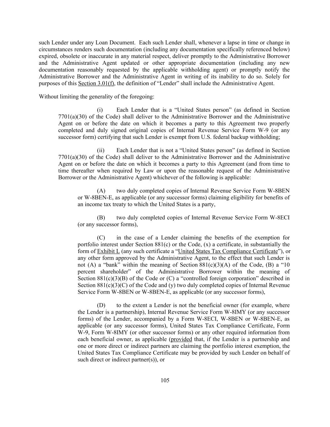 such Lender under any Loan Document. Each such Lender shall, whenever a lapse in time or change in circumstances renders such documentation (including any documentation specifically referenced below) expired, obsolete or inaccurate in any material respect, deliver promptly to the Administrative Borrower and the Administrative Agent updated or other appropriate documentation (including any new documentation reasonably requested by the applicable withholding agent) or promptly notify the Administrative Borrower and the Administrative Agent in writing of its inability to do so. Solely for purposes of this Section 3.01(f), the definition of “Lender” shall include the Administrative Agent. Without limiting the generality of the foregoing: (i) Each Lender that is a “United States person” (as defined in Section 7701(a)(30) of the Code) shall deliver to the Administrative Borrower and the Administrative Agent on or before the date on which it becomes a party to this Agreement two properly completed and duly signed original copies of Internal Revenue Service Form W-9 (or any successor form) certifying that such Lender is exempt from U.S. federal backup withholding; (ii) Each Lender that is not a “United States person” (as defined in Section 7701(a)(30) of the Code) shall deliver to the Administrative Borrower and the Administrative Agent on or before the date on which it becomes a party to this Agreement (and from time to time thereafter when required by Law or upon the reasonable request of the Administrative Borrower or the Administrative Agent) whichever of the following is applicable: (A) two duly completed copies of Internal Revenue Service Form W-8BEN or W-8BEN-E, as applicable (or any successor forms) claiming eligibility for benefits of an income tax treaty to which the United States is a party, (B) two duly completed copies of Internal Revenue Service Form W-8ECI (or any successor forms), (C) in the case of a Lender claiming the benefits of the exemption for portfolio interest under Section 881(c) or the Code, (x) a certificate, in substantially the form of Exhibit L (any such certificate a “United States Tax Compliance Certificate”), or any other form approved by the Administrative Agent, to the effect that such Lender is not (A) a “bank” within the meaning of Section 881(c)(3)(A) of the Code, (B) a “10 percent shareholder” of the Administrative Borrower within the meaning of Section 881(c)(3)(B) of the Code or (C) a “controlled foreign corporation” described in Section 881(c)(3)(C) of the Code and (y) two duly completed copies of Internal Revenue Service Form W-8BEN or W-8BEN-E, as applicable (or any successor forms), (D) to the extent a Lender is not the beneficial owner (for example, where the Lender is a partnership), Internal Revenue Service Form W-8IMY (or any successor forms) of the Lender, accompanied by a Form W-8ECI, W-8BEN or W-8BEN-E, as applicable (or any successor forms), United States Tax Compliance Certificate, Form W-9, Form W-8IMY (or other successor forms) or any other required information from each beneficial owner, as applicable (provided that, if the Lender is a partnership and one or more direct or indirect partners are claiming the portfolio interest exemption, the United States Tax Compliance Certificate may be provided by such Lender on behalf of such direct or indirect partner(s)), or 105