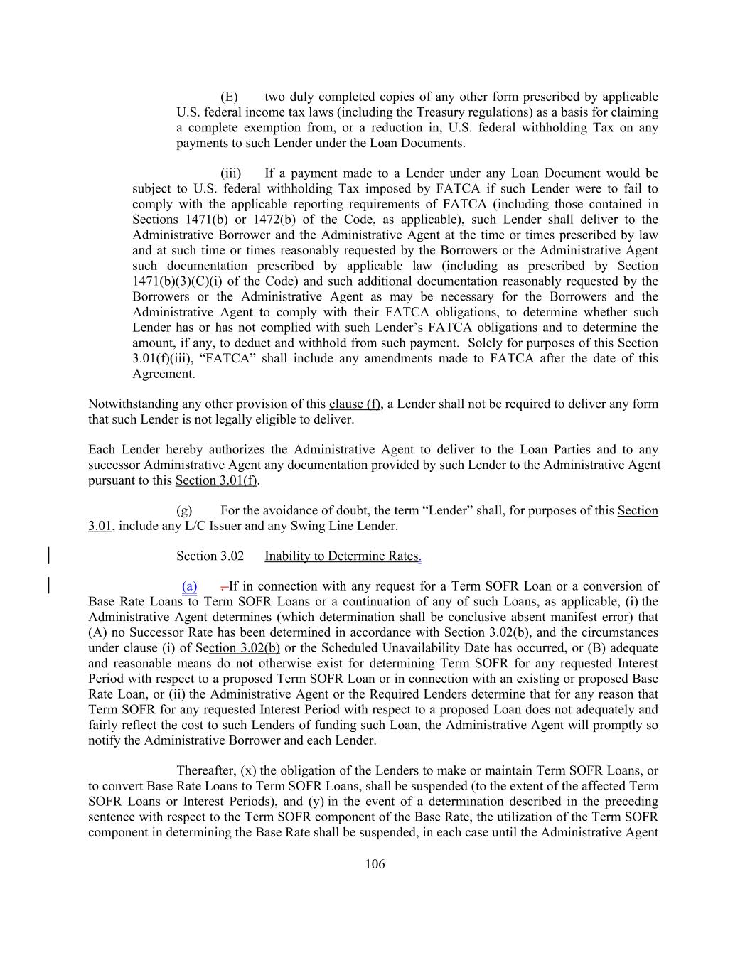 (E) two duly completed copies of any other form prescribed by applicable U.S. federal income tax laws (including the Treasury regulations) as a basis for claiming a complete exemption from, or a reduction in, U.S. federal withholding Tax on any payments to such Lender under the Loan Documents. (iii) If a payment made to a Lender under any Loan Document would be subject to U.S. federal withholding Tax imposed by FATCA if such Lender were to fail to comply with the applicable reporting requirements of FATCA (including those contained in Sections 1471(b) or 1472(b) of the Code, as applicable), such Lender shall deliver to the Administrative Borrower and the Administrative Agent at the time or times prescribed by law and at such time or times reasonably requested by the Borrowers or the Administrative Agent such documentation prescribed by applicable law (including as prescribed by Section 1471(b)(3)(C)(i) of the Code) and such additional documentation reasonably requested by the Borrowers or the Administrative Agent as may be necessary for the Borrowers and the Administrative Agent to comply with their FATCA obligations, to determine whether such Lender has or has not complied with such Lender’s FATCA obligations and to determine the amount, if any, to deduct and withhold from such payment. Solely for purposes of this Section 3.01(f)(iii), “FATCA” shall include any amendments made to FATCA after the date of this Agreement. Notwithstanding any other provision of this clause (f), a Lender shall not be required to deliver any form that such Lender is not legally eligible to deliver. Each Lender hereby authorizes the Administrative Agent to deliver to the Loan Parties and to any successor Administrative Agent any documentation provided by such Lender to the Administrative Agent pursuant to this Section 3.01(f). (g) For the avoidance of doubt, the term “Lender” shall, for purposes of this Section 3.01, include any L/C Issuer and any Swing Line Lender. Section 3.02 Inability to Determine Rates. (a) . If in connection with any request for a Term SOFR Loan or a conversion of Base Rate Loans to Term SOFR Loans or a continuation of any of such Loans, as applicable, (i) the Administrative Agent determines (which determination shall be conclusive absent manifest error) that (A) no Successor Rate has been determined in accordance with Section 3.02(b), and the circumstances under clause (i) of Section 3.02(b) or the Scheduled Unavailability Date has occurred, or (B) adequate and reasonable means do not otherwise exist for determining Term SOFR for any requested Interest Period with respect to a proposed Term SOFR Loan or in connection with an existing or proposed Base Rate Loan, or (ii) the Administrative Agent or the Required Lenders determine that for any reason that Term SOFR for any requested Interest Period with respect to a proposed Loan does not adequately and fairly reflect the cost to such Lenders of funding such Loan, the Administrative Agent will promptly so notify the Administrative Borrower and each Lender. Thereafter, (x) the obligation of the Lenders to make or maintain Term SOFR Loans, or to convert Base Rate Loans to Term SOFR Loans, shall be suspended (to the extent of the affected Term SOFR Loans or Interest Periods), and (y) in the event of a determination described in the preceding sentence with respect to the Term SOFR component of the Base Rate, the utilization of the Term SOFR component in determining the Base Rate shall be suspended, in each case until the Administrative Agent 106