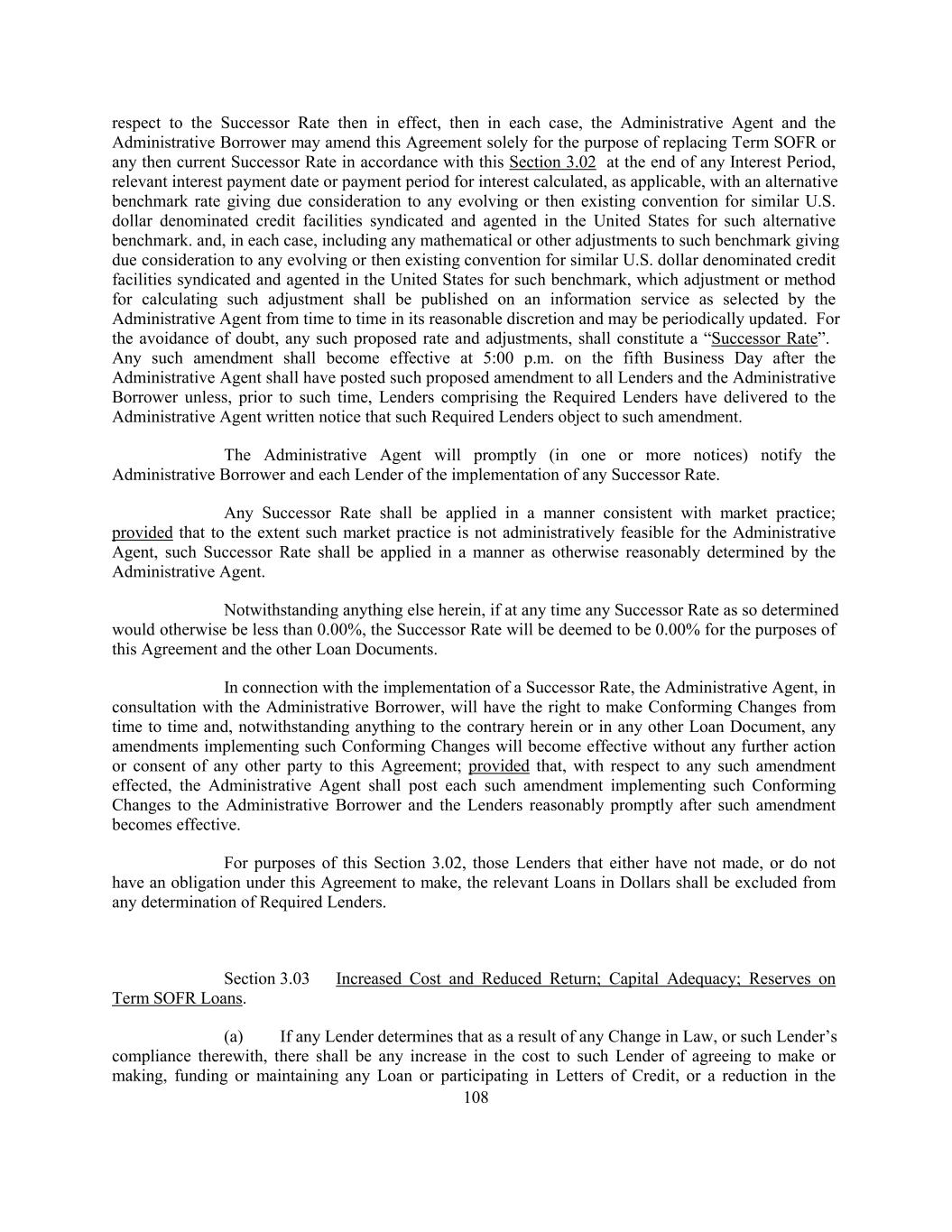 respect to the Successor Rate then in effect, then in each case, the Administrative Agent and the Administrative Borrower may amend this Agreement solely for the purpose of replacing Term SOFR or any then current Successor Rate in accordance with this Section 3.02 at the end of any Interest Period, relevant interest payment date or payment period for interest calculated, as applicable, with an alternative benchmark rate giving due consideration to any evolving or then existing convention for similar U.S. dollar denominated credit facilities syndicated and agented in the United States for such alternative benchmark. and, in each case, including any mathematical or other adjustments to such benchmark giving due consideration to any evolving or then existing convention for similar U.S. dollar denominated credit facilities syndicated and agented in the United States for such benchmark, which adjustment or method for calculating such adjustment shall be published on an information service as selected by the Administrative Agent from time to time in its reasonable discretion and may be periodically updated. For the avoidance of doubt, any such proposed rate and adjustments, shall constitute a “Successor Rate”. Any such amendment shall become effective at 5:00 p.m. on the fifth Business Day after the Administrative Agent shall have posted such proposed amendment to all Lenders and the Administrative Borrower unless, prior to such time, Lenders comprising the Required Lenders have delivered to the Administrative Agent written notice that such Required Lenders object to such amendment. The Administrative Agent will promptly (in one or more notices) notify the Administrative Borrower and each Lender of the implementation of any Successor Rate. Any Successor Rate shall be applied in a manner consistent with market practice; provided that to the extent such market practice is not administratively feasible for the Administrative Agent, such Successor Rate shall be applied in a manner as otherwise reasonably determined by the Administrative Agent. Notwithstanding anything else herein, if at any time any Successor Rate as so determined would otherwise be less than 0.00%, the Successor Rate will be deemed to be 0.00% for the purposes of this Agreement and the other Loan Documents. In connection with the implementation of a Successor Rate, the Administrative Agent, in consultation with the Administrative Borrower, will have the right to make Conforming Changes from time to time and, notwithstanding anything to the contrary herein or in any other Loan Document, any amendments implementing such Conforming Changes will become effective without any further action or consent of any other party to this Agreement; provided that, with respect to any such amendment effected, the Administrative Agent shall post each such amendment implementing such Conforming Changes to the Administrative Borrower and the Lenders reasonably promptly after such amendment becomes effective. For purposes of this Section 3.02, those Lenders that either have not made, or do not have an obligation under this Agreement to make, the relevant Loans in Dollars shall be excluded from any determination of Required Lenders. Section 3.03 Increased Cost and Reduced Return; Capital Adequacy; Reserves on Term SOFR Loans. (a) If any Lender determines that as a result of any Change in Law, or such Lender’s compliance therewith, there shall be any increase in the cost to such Lender of agreeing to make or making, funding or maintaining any Loan or participating in Letters of Credit, or a reduction in the 108