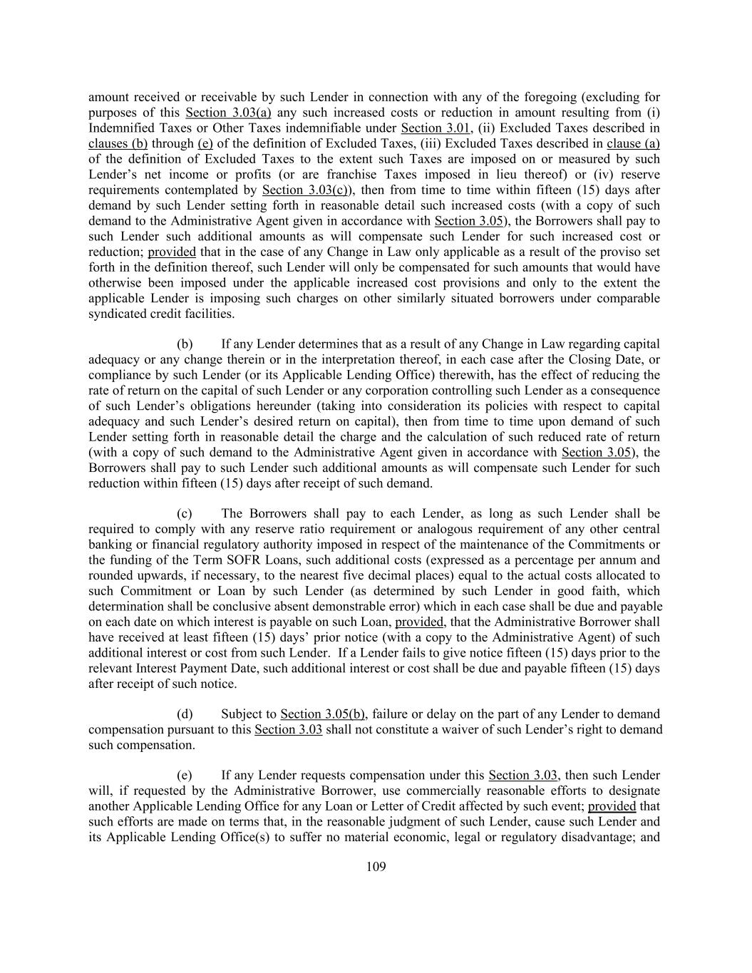 amount received or receivable by such Lender in connection with any of the foregoing (excluding for purposes of this Section 3.03(a) any such increased costs or reduction in amount resulting from (i) Indemnified Taxes or Other Taxes indemnifiable under Section 3.01, (ii) Excluded Taxes described in clauses (b) through (e) of the definition of Excluded Taxes, (iii) Excluded Taxes described in clause (a) of the definition of Excluded Taxes to the extent such Taxes are imposed on or measured by such Lender’s net income or profits (or are franchise Taxes imposed in lieu thereof) or (iv) reserve requirements contemplated by Section 3.03(c)), then from time to time within fifteen (15) days after demand by such Lender setting forth in reasonable detail such increased costs (with a copy of such demand to the Administrative Agent given in accordance with Section 3.05), the Borrowers shall pay to such Lender such additional amounts as will compensate such Lender for such increased cost or reduction; provided that in the case of any Change in Law only applicable as a result of the proviso set forth in the definition thereof, such Lender will only be compensated for such amounts that would have otherwise been imposed under the applicable increased cost provisions and only to the extent the applicable Lender is imposing such charges on other similarly situated borrowers under comparable syndicated credit facilities. (b) If any Lender determines that as a result of any Change in Law regarding capital adequacy or any change therein or in the interpretation thereof, in each case after the Closing Date, or compliance by such Lender (or its Applicable Lending Office) therewith, has the effect of reducing the rate of return on the capital of such Lender or any corporation controlling such Lender as a consequence of such Lender’s obligations hereunder (taking into consideration its policies with respect to capital adequacy and such Lender’s desired return on capital), then from time to time upon demand of such Lender setting forth in reasonable detail the charge and the calculation of such reduced rate of return (with a copy of such demand to the Administrative Agent given in accordance with Section 3.05), the Borrowers shall pay to such Lender such additional amounts as will compensate such Lender for such reduction within fifteen (15) days after receipt of such demand. (c) The Borrowers shall pay to each Lender, as long as such Lender shall be required to comply with any reserve ratio requirement or analogous requirement of any other central banking or financial regulatory authority imposed in respect of the maintenance of the Commitments or the funding of the Term SOFR Loans, such additional costs (expressed as a percentage per annum and rounded upwards, if necessary, to the nearest five decimal places) equal to the actual costs allocated to such Commitment or Loan by such Lender (as determined by such Lender in good faith, which determination shall be conclusive absent demonstrable error) which in each case shall be due and payable on each date on which interest is payable on such Loan, provided, that the Administrative Borrower shall have received at least fifteen (15) days’ prior notice (with a copy to the Administrative Agent) of such additional interest or cost from such Lender. If a Lender fails to give notice fifteen (15) days prior to the relevant Interest Payment Date, such additional interest or cost shall be due and payable fifteen (15) days after receipt of such notice. (d) Subject to Section 3.05(b), failure or delay on the part of any Lender to demand compensation pursuant to this Section 3.03 shall not constitute a waiver of such Lender’s right to demand such compensation. (e) If any Lender requests compensation under this Section 3.03, then such Lender will, if requested by the Administrative Borrower, use commercially reasonable efforts to designate another Applicable Lending Office for any Loan or Letter of Credit affected by such event; provided that such efforts are made on terms that, in the reasonable judgment of such Lender, cause such Lender and its Applicable Lending Office(s) to suffer no material economic, legal or regulatory disadvantage; and 109
