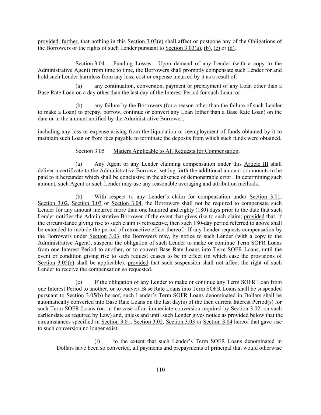 provided, further, that nothing in this Section 3.03(e) shall affect or postpone any of the Obligations of the Borrowers or the rights of such Lender pursuant to Section 3.03(a), (b), (c) or (d). Section 3.04 Funding Losses. Upon demand of any Lender (with a copy to the Administrative Agent) from time to time, the Borrowers shall promptly compensate such Lender for and hold such Lender harmless from any loss, cost or expense incurred by it as a result of: (a) any continuation, conversion, payment or prepayment of any Loan other than a Base Rate Loan on a day other than the last day of the Interest Period for such Loan; or (b) any failure by the Borrowers (for a reason other than the failure of such Lender to make a Loan) to prepay, borrow, continue or convert any Loan (other than a Base Rate Loan) on the date or in the amount notified by the Administrative Borrower; including any loss or expense arising from the liquidation or reemployment of funds obtained by it to maintain such Loan or from fees payable to terminate the deposits from which such funds were obtained. Section 3.05 Matters Applicable to All Requests for Compensation. (a) Any Agent or any Lender claiming compensation under this Article III shall deliver a certificate to the Administrative Borrower setting forth the additional amount or amounts to be paid to it hereunder which shall be conclusive in the absence of demonstrable error. In determining such amount, such Agent or such Lender may use any reasonable averaging and attribution methods. (b) With respect to any Lender’s claim for compensation under Section 3.01, Section 3.02, Section 3.03 or Section 3.04, the Borrowers shall not be required to compensate such Lender for any amount incurred more than one hundred and eighty (180) days prior to the date that such Lender notifies the Administrative Borrower of the event that gives rise to such claim; provided that, if the circumstance giving rise to such claim is retroactive, then such 180-day period referred to above shall be extended to include the period of retroactive effect thereof. If any Lender requests compensation by the Borrowers under Section 3.03, the Borrowers may, by notice to such Lender (with a copy to the Administrative Agent), suspend the obligation of such Lender to make or continue Term SOFR Loans from one Interest Period to another, or to convert Base Rate Loans into Term SOFR Loans, until the event or condition giving rise to such request ceases to be in effect (in which case the provisions of Section 3.05(c) shall be applicable); provided that such suspension shall not affect the right of such Lender to receive the compensation so requested. (c) If the obligation of any Lender to make or continue any Term SOFR Loan from one Interest Period to another, or to convert Base Rate Loans into Term SOFR Loans shall be suspended pursuant to Section 3.05(b) hereof, such Lender’s Term SOFR Loans denominated in Dollars shall be automatically converted into Base Rate Loans on the last day(s) of the then current Interest Period(s) for such Term SOFR Loans (or, in the case of an immediate conversion required by Section 3.02, on such earlier date as required by Law) and, unless and until such Lender gives notice as provided below that the circumstances specified in Section 3.01, Section 3.02, Section 3.03 or Section 3.04 hereof that gave rise to such conversion no longer exist: (i) to the extent that such Lender’s Term SOFR Loans denominated in Dollars have been so converted, all payments and prepayments of principal that would otherwise 110