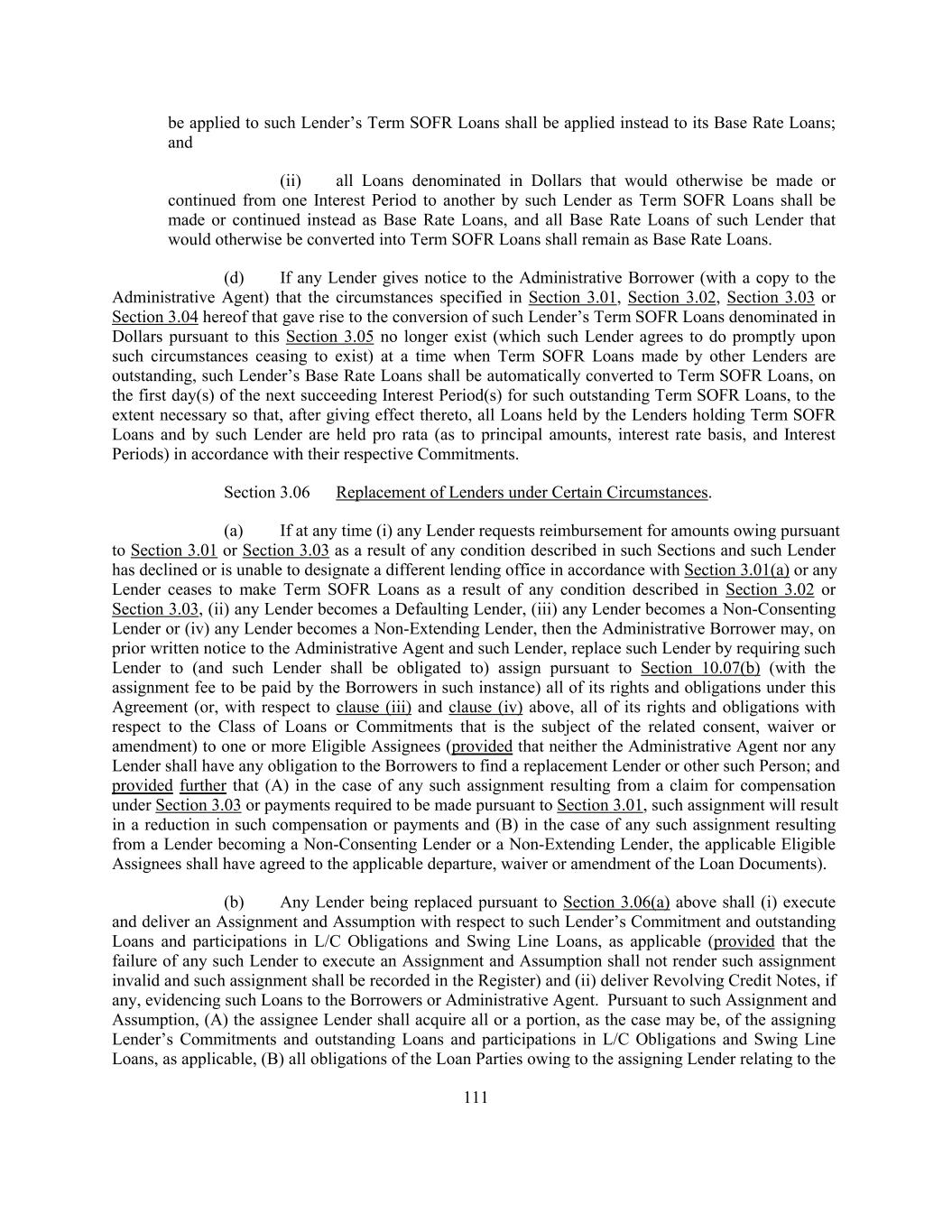 be applied to such Lender’s Term SOFR Loans shall be applied instead to its Base Rate Loans; and (ii) all Loans denominated in Dollars that would otherwise be made or continued from one Interest Period to another by such Lender as Term SOFR Loans shall be made or continued instead as Base Rate Loans, and all Base Rate Loans of such Lender that would otherwise be converted into Term SOFR Loans shall remain as Base Rate Loans. (d) If any Lender gives notice to the Administrative Borrower (with a copy to the Administrative Agent) that the circumstances specified in Section 3.01, Section 3.02, Section 3.03 or Section 3.04 hereof that gave rise to the conversion of such Lender’s Term SOFR Loans denominated in Dollars pursuant to this Section 3.05 no longer exist (which such Lender agrees to do promptly upon such circumstances ceasing to exist) at a time when Term SOFR Loans made by other Lenders are outstanding, such Lender’s Base Rate Loans shall be automatically converted to Term SOFR Loans, on the first day(s) of the next succeeding Interest Period(s) for such outstanding Term SOFR Loans, to the extent necessary so that, after giving effect thereto, all Loans held by the Lenders holding Term SOFR Loans and by such Lender are held pro rata (as to principal amounts, interest rate basis, and Interest Periods) in accordance with their respective Commitments. Section 3.06 Replacement of Lenders under Certain Circumstances. (a) If at any time (i) any Lender requests reimbursement for amounts owing pursuant to Section 3.01 or Section 3.03 as a result of any condition described in such Sections and such Lender has declined or is unable to designate a different lending office in accordance with Section 3.01(a) or any Lender ceases to make Term SOFR Loans as a result of any condition described in Section 3.02 or Section 3.03, (ii) any Lender becomes a Defaulting Lender, (iii) any Lender becomes a Non-Consenting Lender or (iv) any Lender becomes a Non-Extending Lender, then the Administrative Borrower may, on prior written notice to the Administrative Agent and such Lender, replace such Lender by requiring such Lender to (and such Lender shall be obligated to) assign pursuant to Section 10.07(b) (with the assignment fee to be paid by the Borrowers in such instance) all of its rights and obligations under this Agreement (or, with respect to clause (iii) and clause (iv) above, all of its rights and obligations with respect to the Class of Loans or Commitments that is the subject of the related consent, waiver or amendment) to one or more Eligible Assignees (provided that neither the Administrative Agent nor any Lender shall have any obligation to the Borrowers to find a replacement Lender or other such Person; and provided further that (A) in the case of any such assignment resulting from a claim for compensation under Section 3.03 or payments required to be made pursuant to Section 3.01, such assignment will result in a reduction in such compensation or payments and (B) in the case of any such assignment resulting from a Lender becoming a Non-Consenting Lender or a Non-Extending Lender, the applicable Eligible Assignees shall have agreed to the applicable departure, waiver or amendment of the Loan Documents). (b) Any Lender being replaced pursuant to Section 3.06(a) above shall (i) execute and deliver an Assignment and Assumption with respect to such Lender’s Commitment and outstanding Loans and participations in L/C Obligations and Swing Line Loans, as applicable (provided that the failure of any such Lender to execute an Assignment and Assumption shall not render such assignment invalid and such assignment shall be recorded in the Register) and (ii) deliver Revolving Credit Notes, if any, evidencing such Loans to the Borrowers or Administrative Agent. Pursuant to such Assignment and Assumption, (A) the assignee Lender shall acquire all or a portion, as the case may be, of the assigning Lender’s Commitments and outstanding Loans and participations in L/C Obligations and Swing Line Loans, as applicable, (B) all obligations of the Loan Parties owing to the assigning Lender relating to the 111